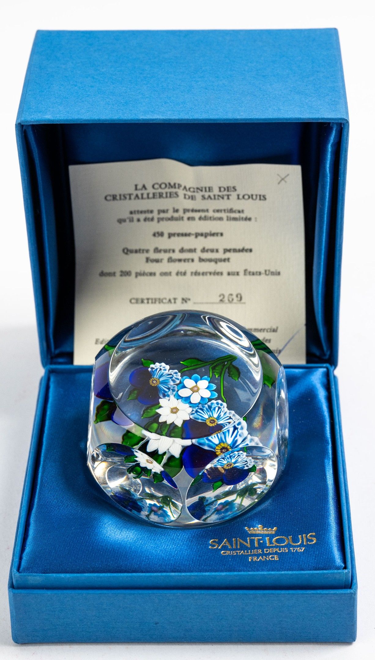 SAINT LOUIS, crystal paperweight, Four flowers including two pansies, 1983, justified 269/450, in box with certificate