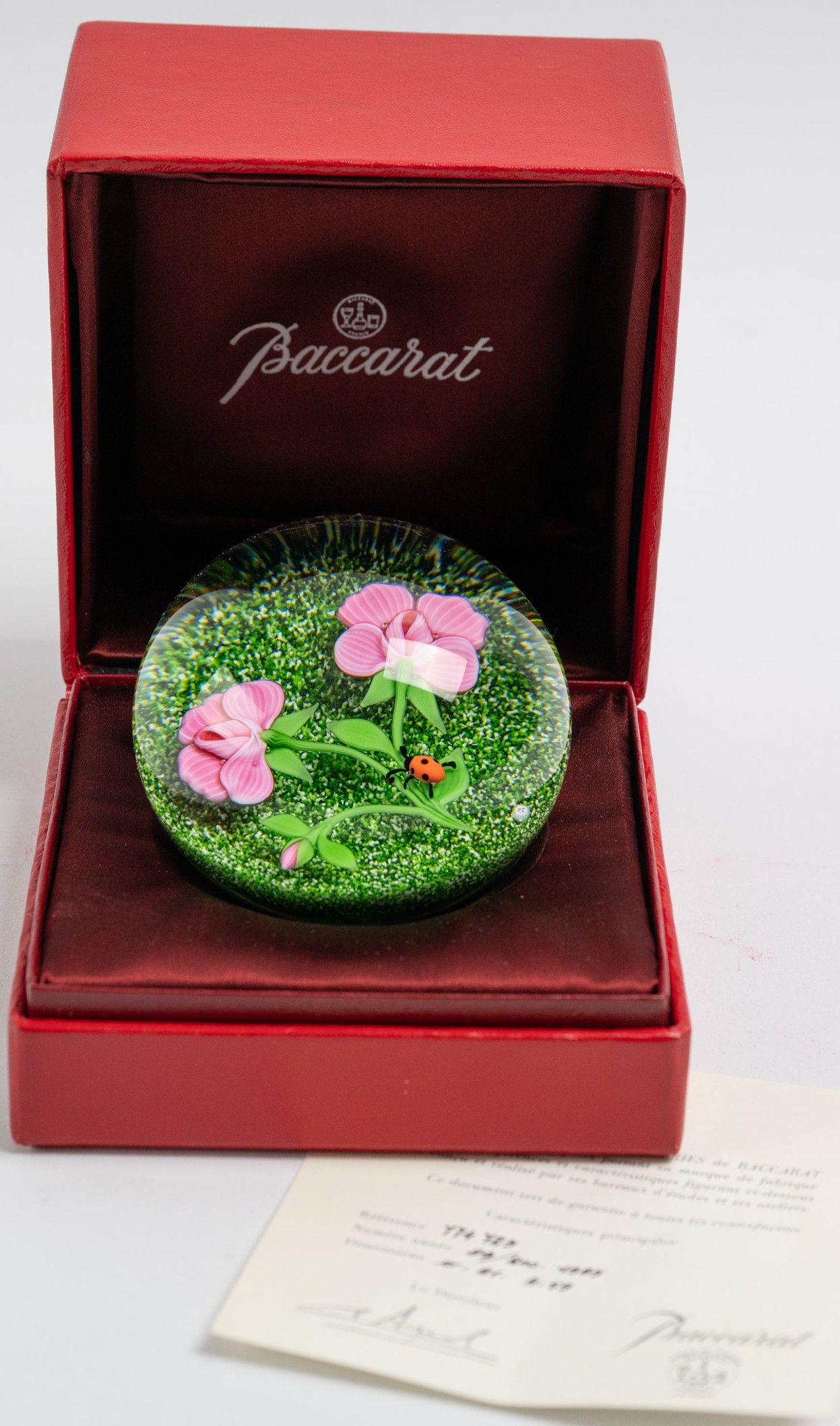 BACCARAT, crystal paperweight ball, Two roses on green background with red bud and insect, 1985, ref: 774725, justified 89/200, D: 81 mm, H: 59 mm, in box with certificate