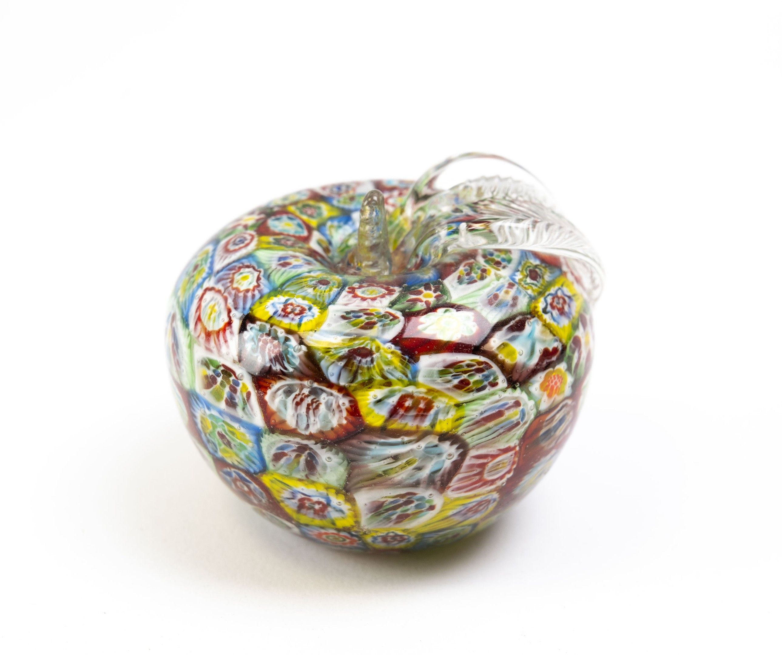 An apple-shaped crystal paperweight with polychrome millefiori decoration. Height: 8 cm
