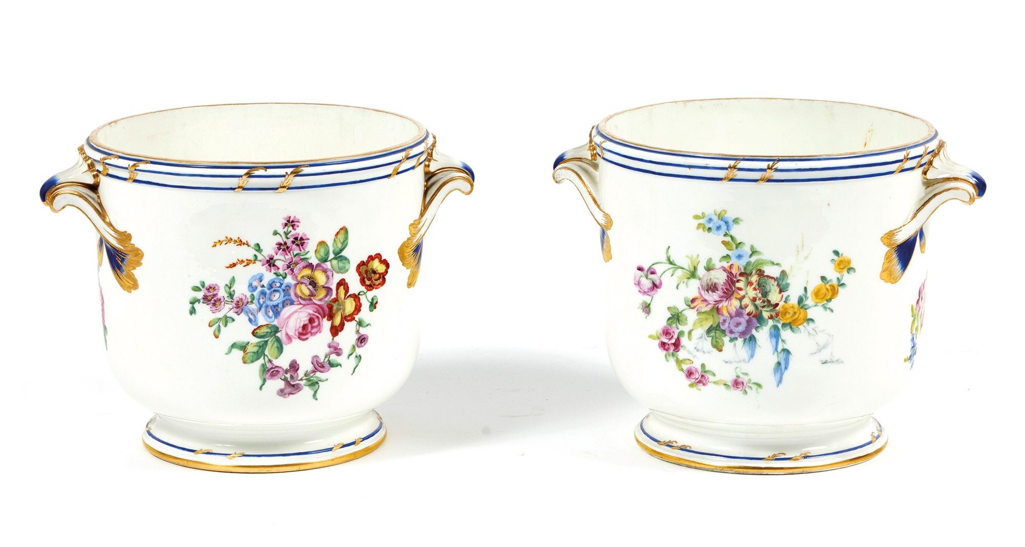 Two bottle coolers in soft paste with polychrome decoration of large bunches of flowers. Blue and gold combed handles and triple blue nets on the edges with gold clasps. Marked LL interlaced year 1771 painter Méreaud the young and Tandart the elder for one and year 1764 painter Pierre the young for the other.