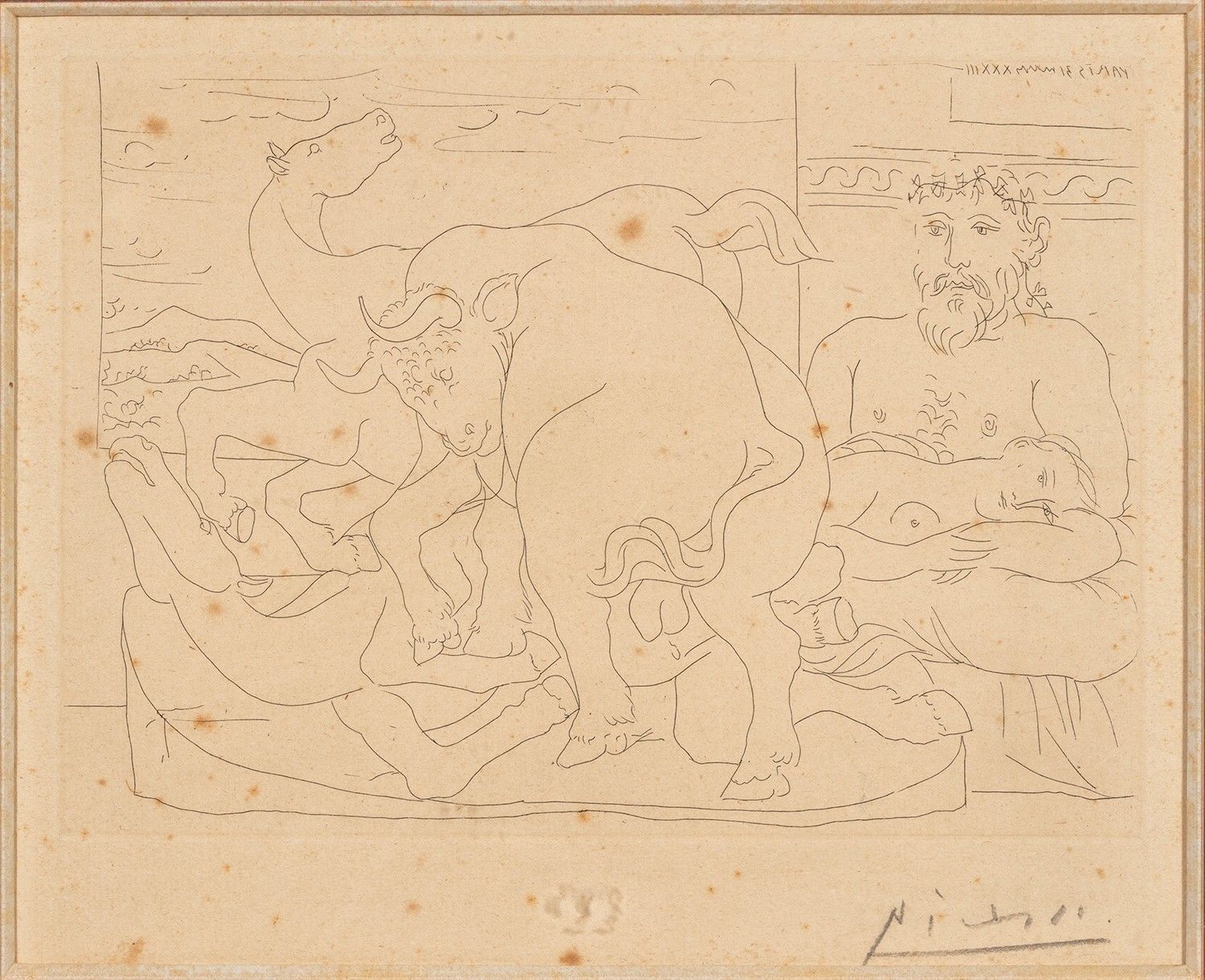 Le Repos du sculpteur devant des chevaux et un taureau (Suite Vollard, pl. 57). 31 March 1933. Etching. 268 x 193 mm. Bloch 166; Baer 319 B d. Fine proof on Montval laid paper (watermark not apparent), from an edition of 260 small-margin proofs [429 x 334 mm], signed in pencil, pasted in full on card. Oxidation when the mat was opened. Light scattered foxing. Framed.