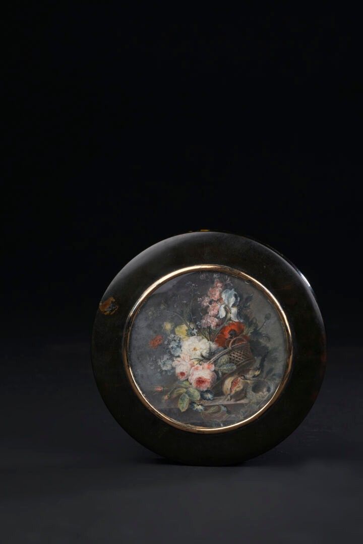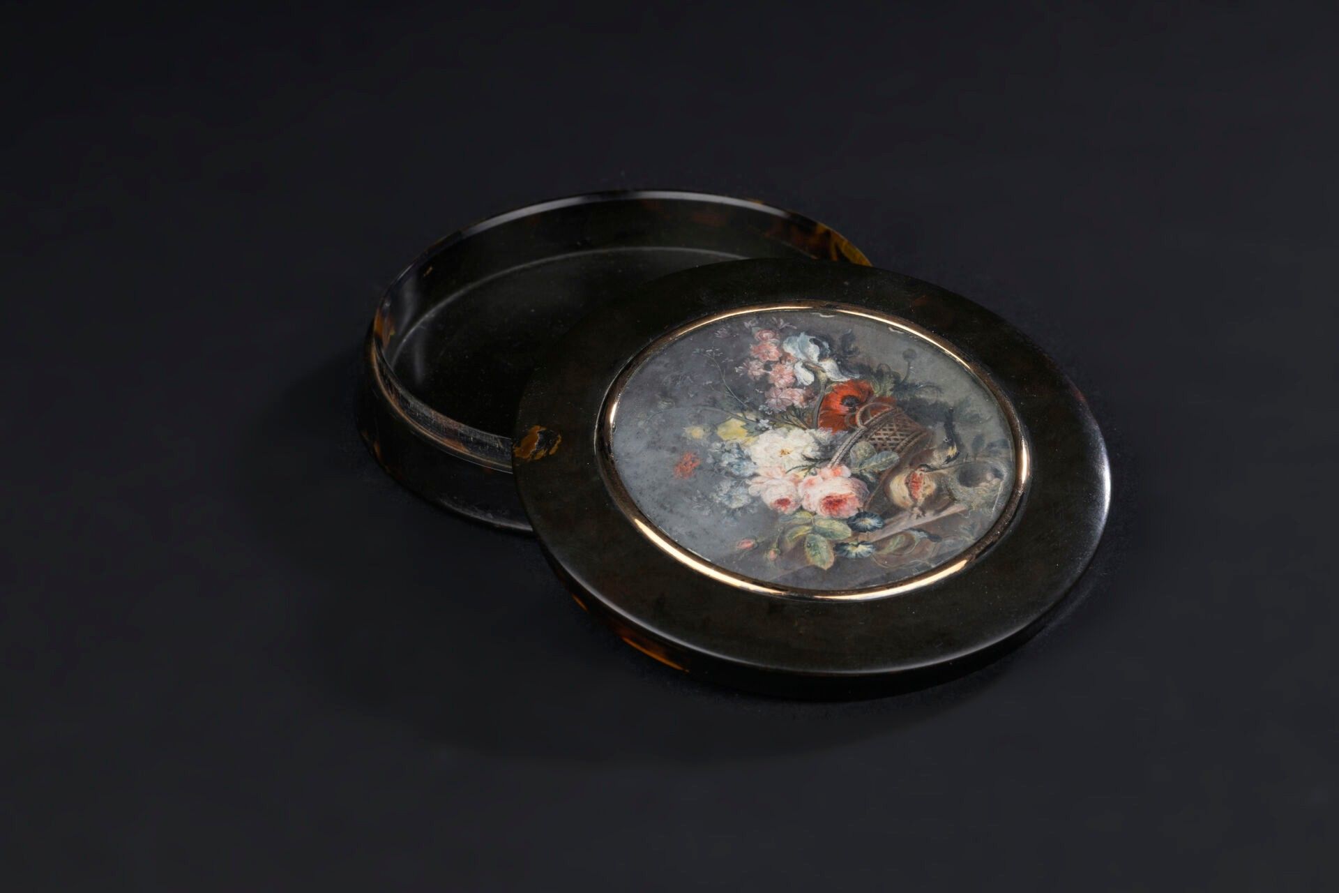 Our miniature is based on the oval painting (47 x 38.3 cm), Flowers in a twisted basket, a pomegranate and a thistle with a nest on a marble tray, signed