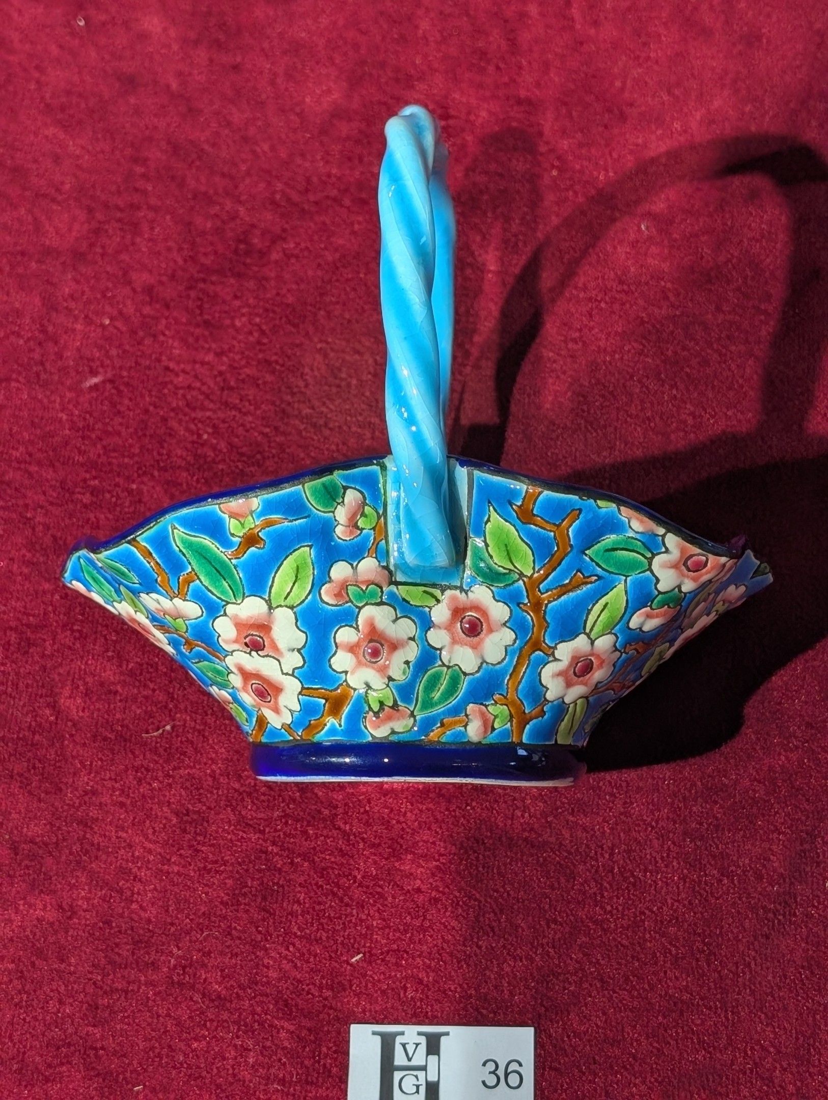 Longwy - Small earthenware basket with polychrome enamel decoration - Dim. 15 x 10 cm H. 13.5 cm
