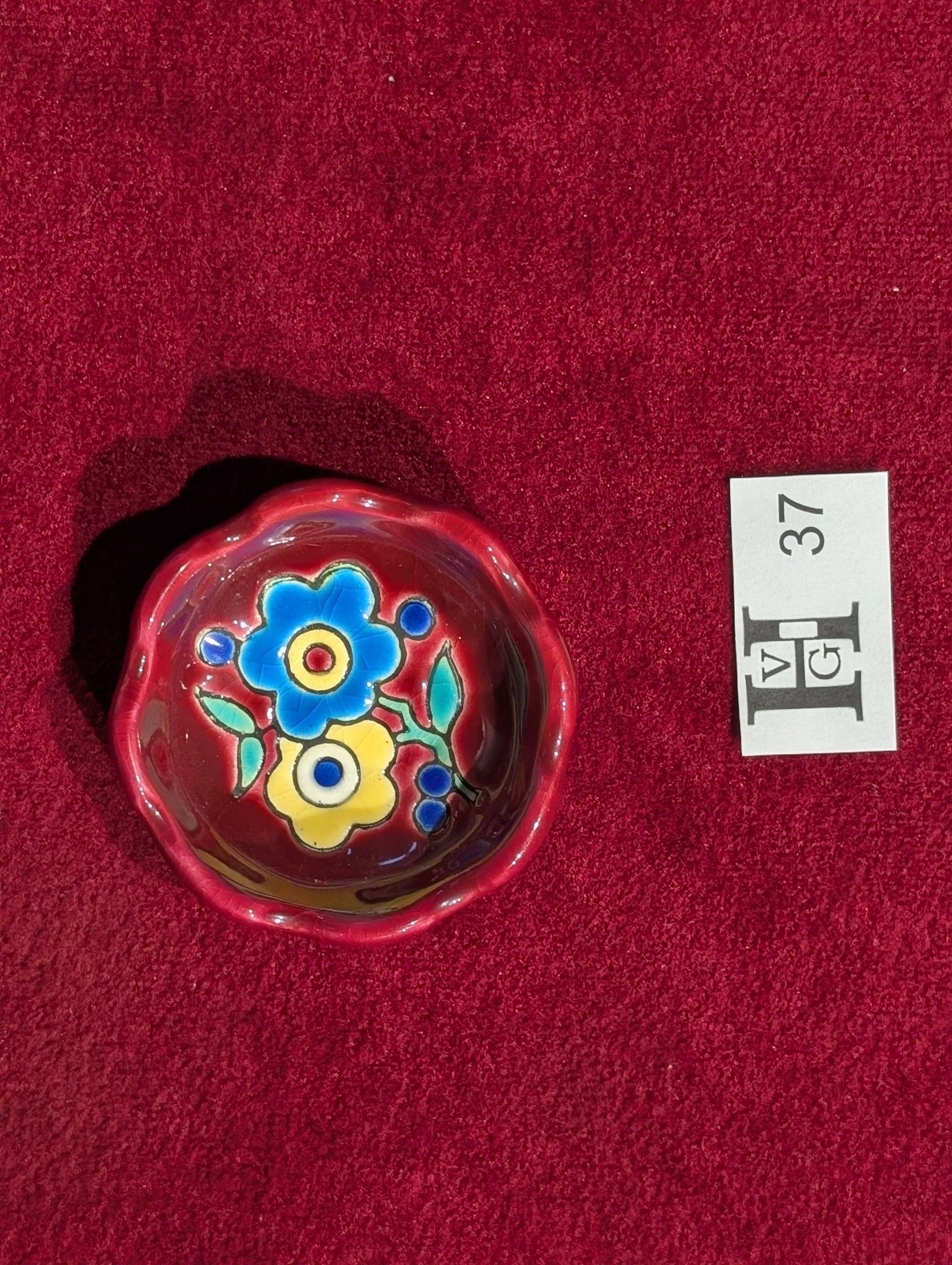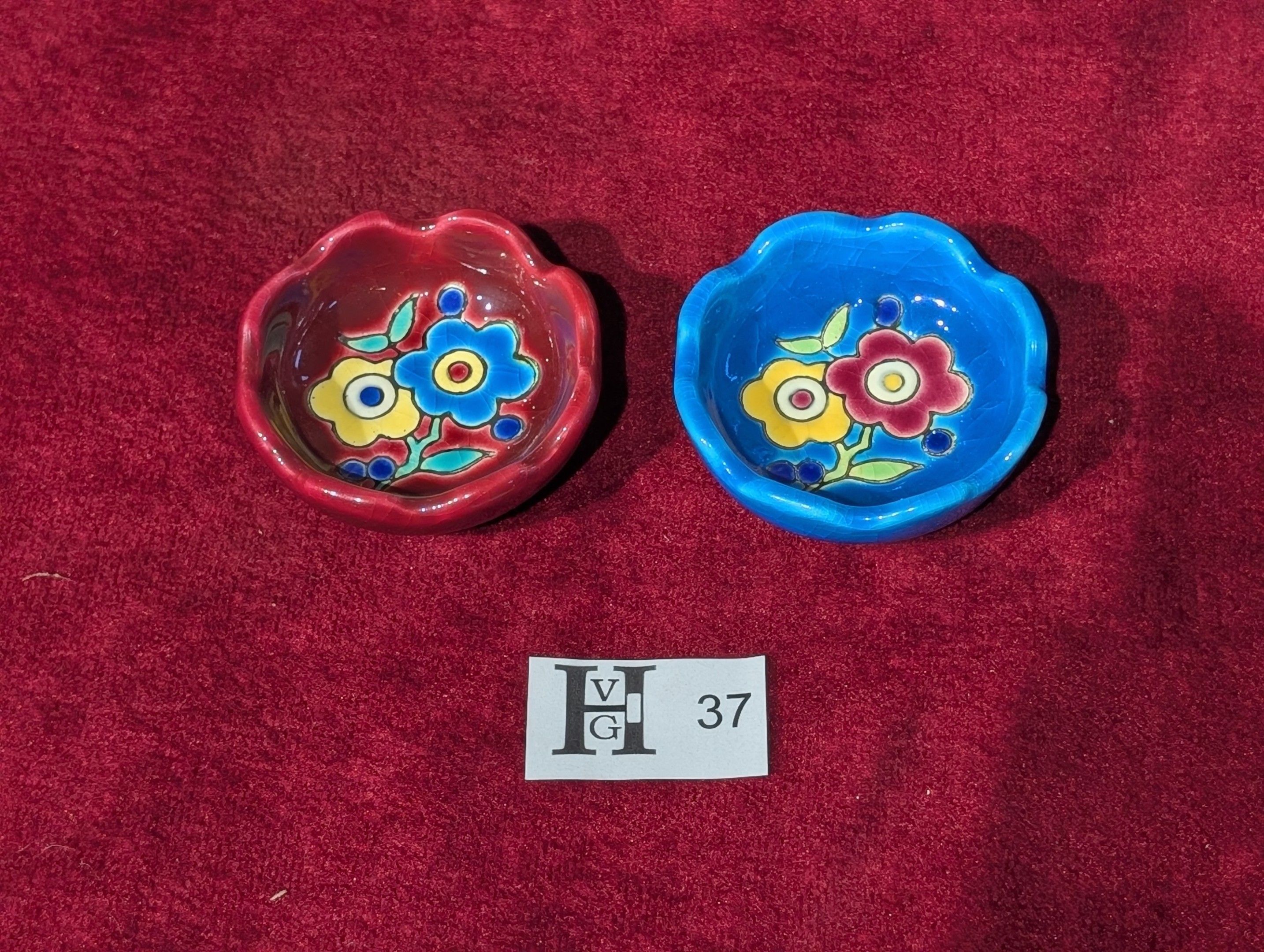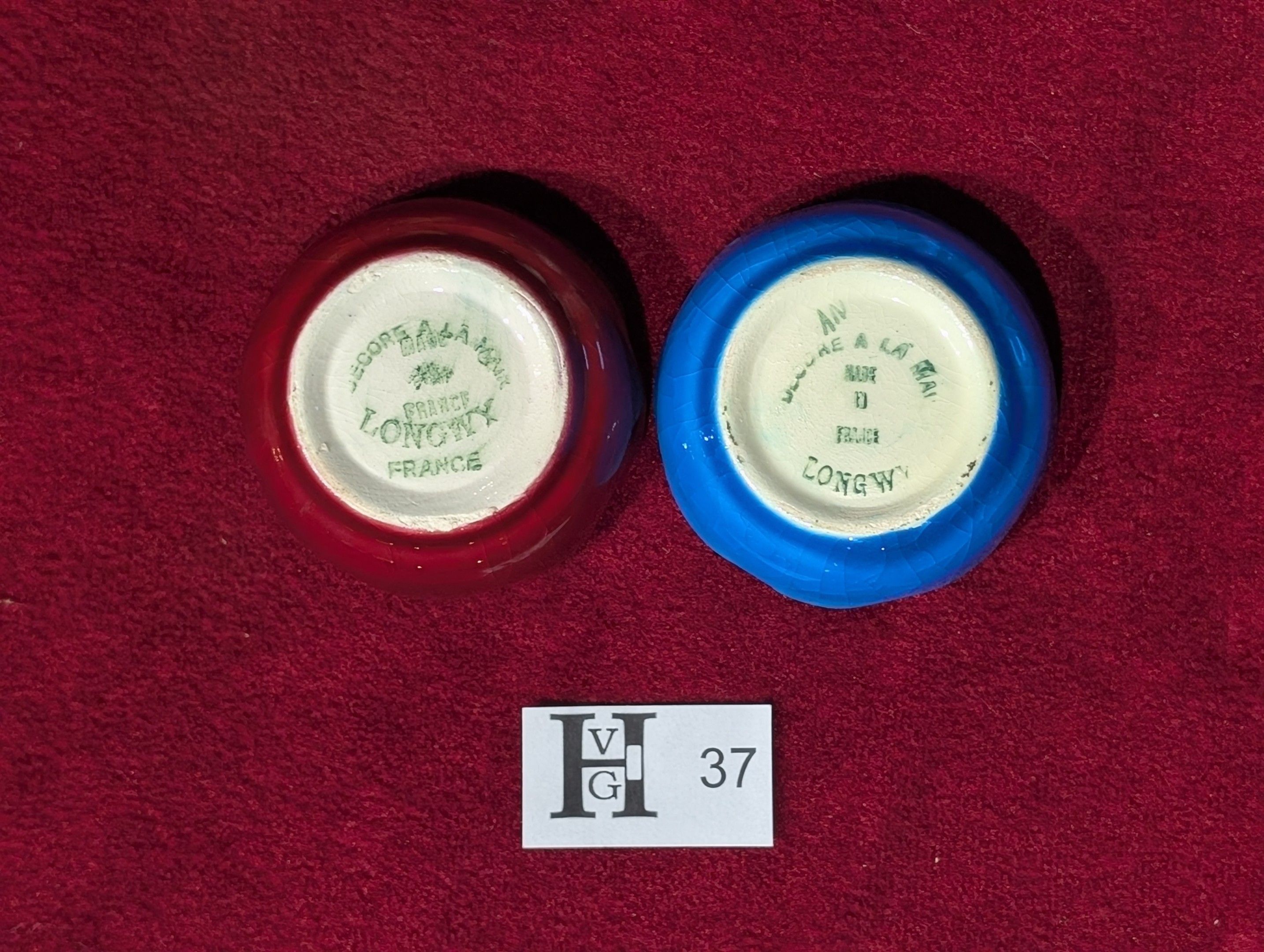 Longwy - Reunion of 2 small earthenware dishes decorated with polychrome enamels - Hand-decorated - Diam. 6 cm