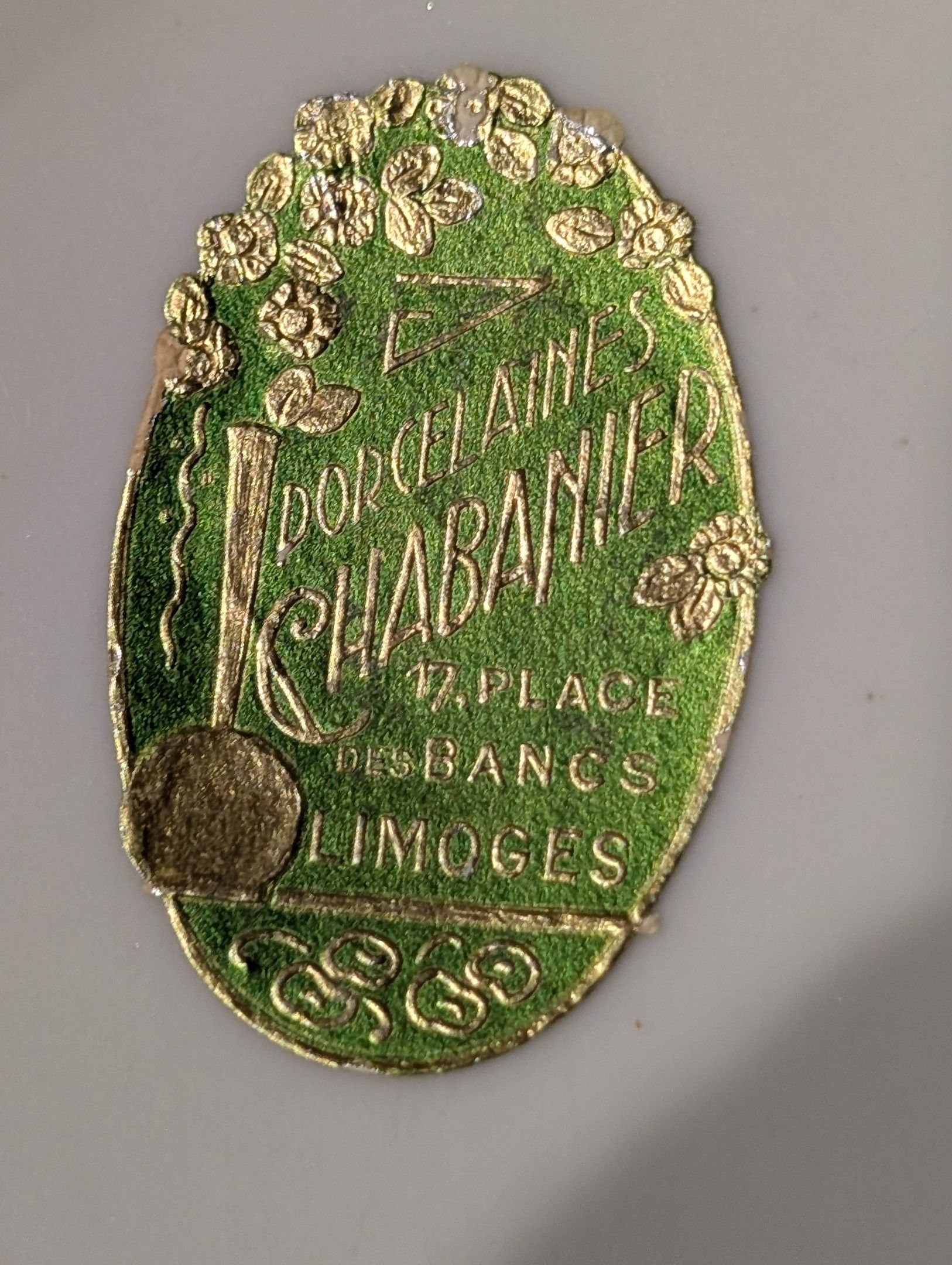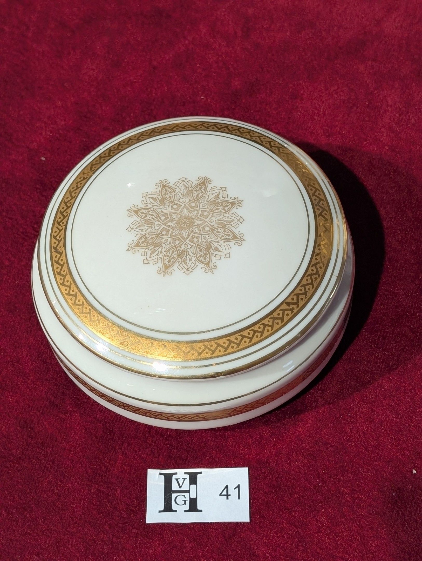 Limoges porcelain bonbonnière with lid - Diam. 13 cm - Provenance porcelaine Chabanier 17 places des bancs Limoges - Note small missing gilding.