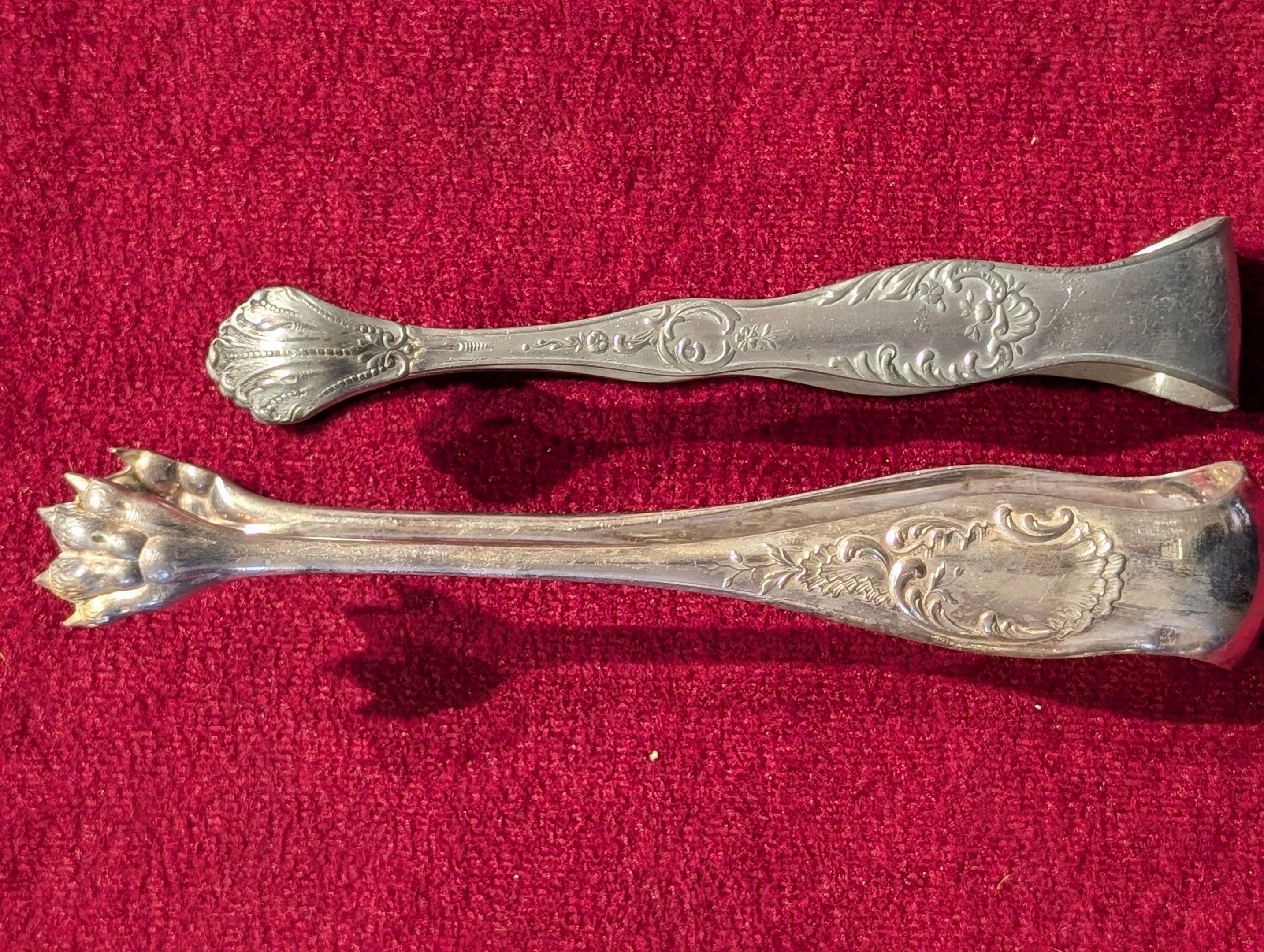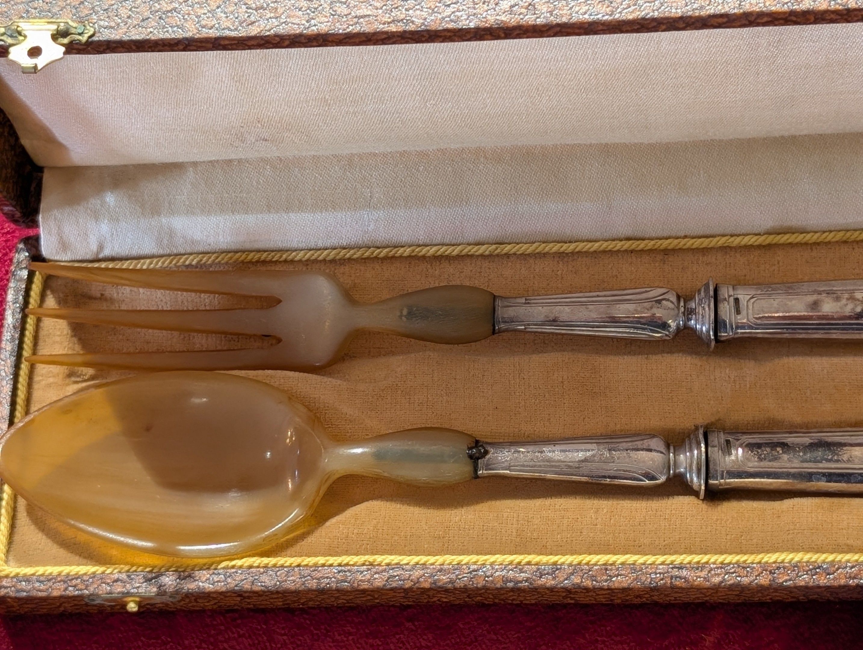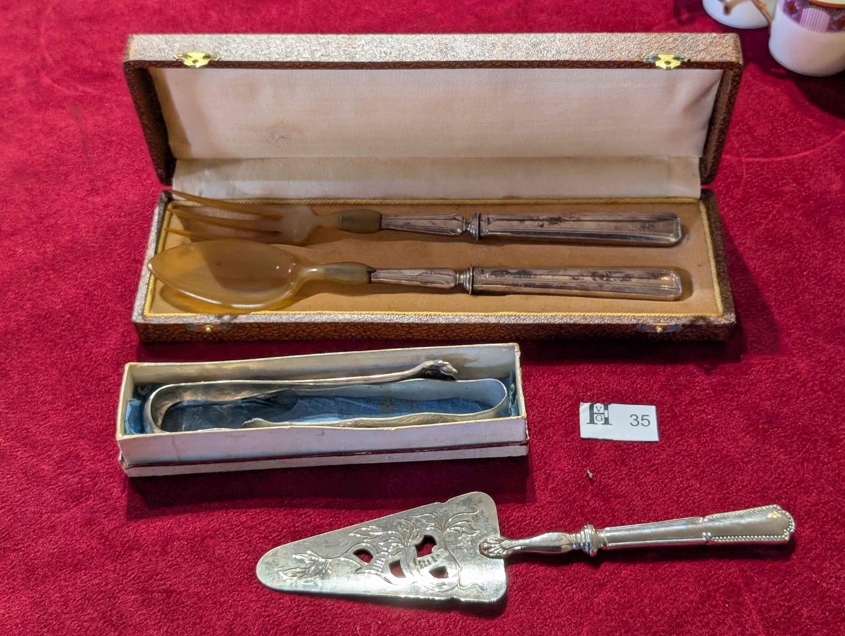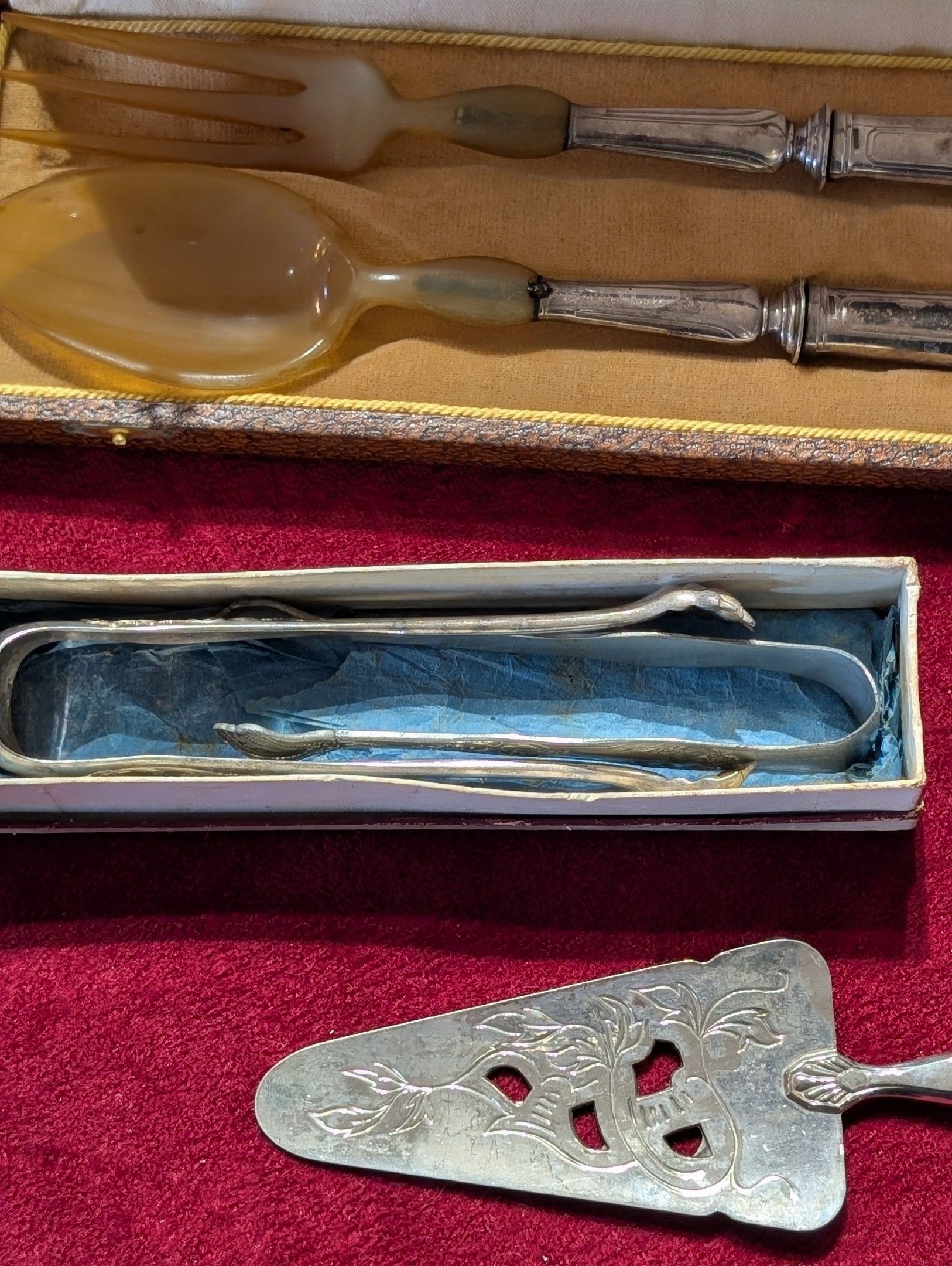 This set includes a salad server in its box, two sugar tongs and a pie server.