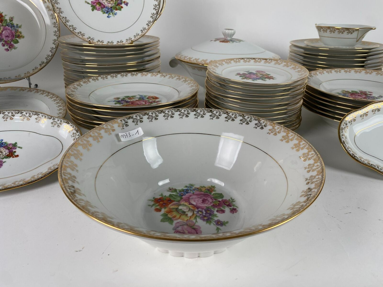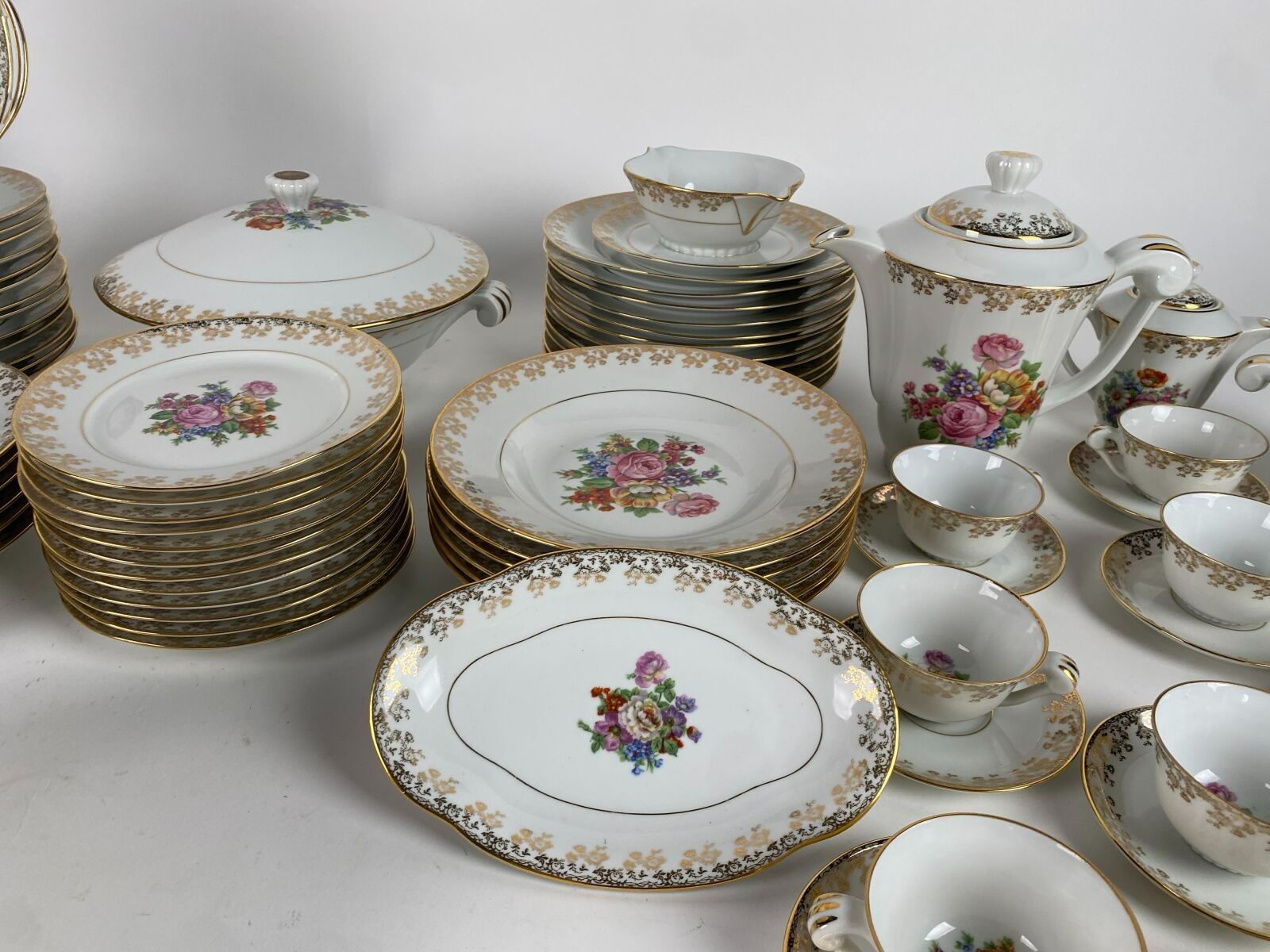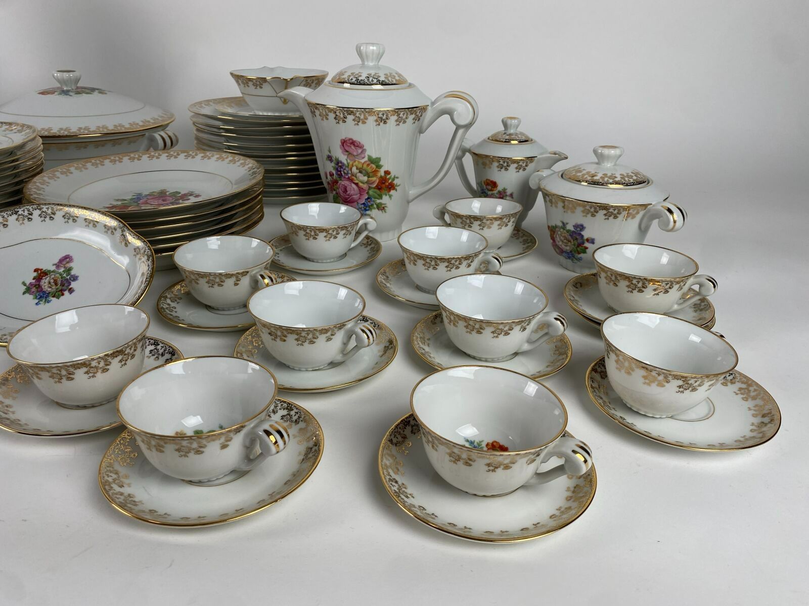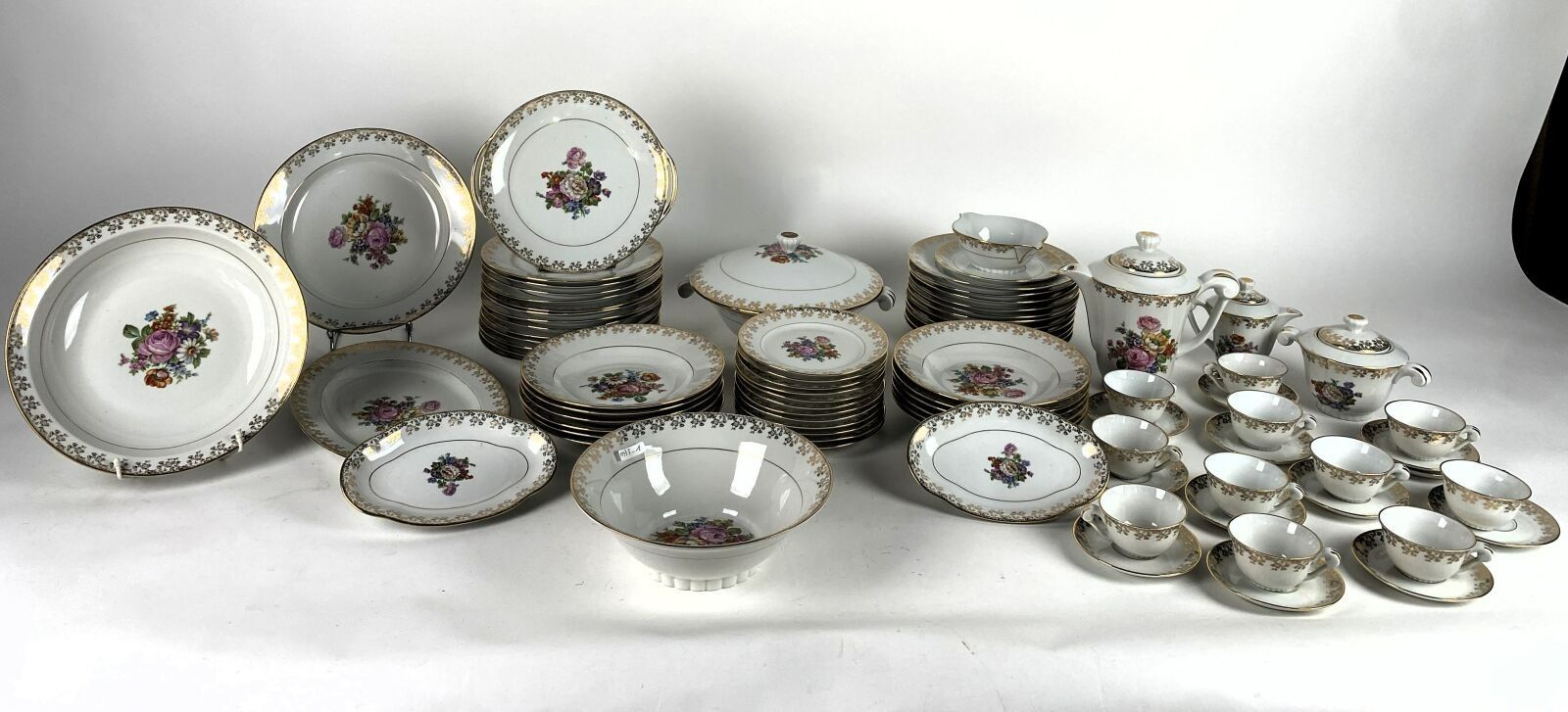 24 dinner plates, 12 soup plates, 1 coffee pot, 1 milk jug, 1 sugar bowl, 1 oval platter, 2 ravioli dishes, 1 sauce boat, 12 dessert plates, 1 tureen, 4 round dishes, 11 cups and 12 saucers. Slight chipping and slight missing gilding.