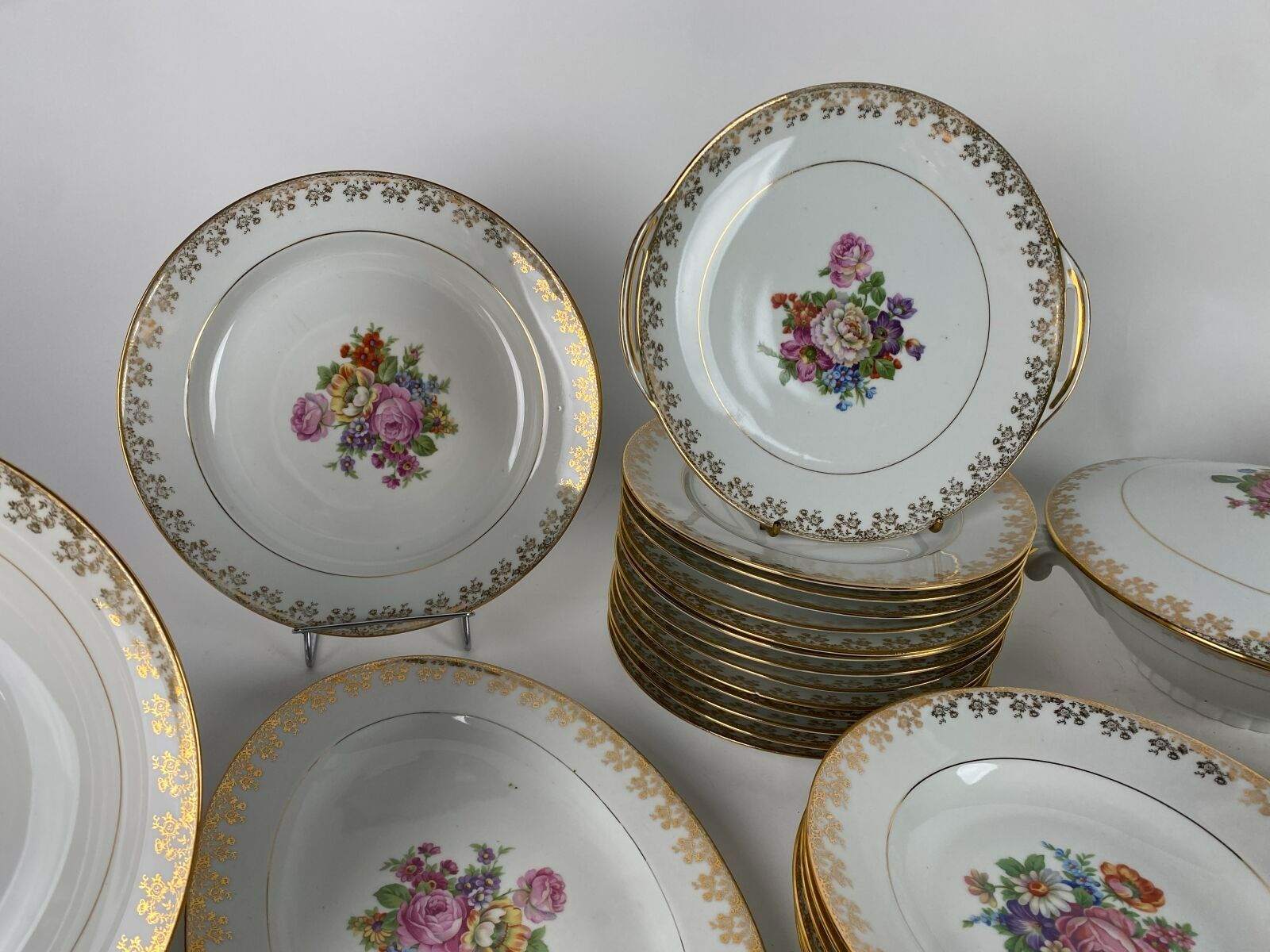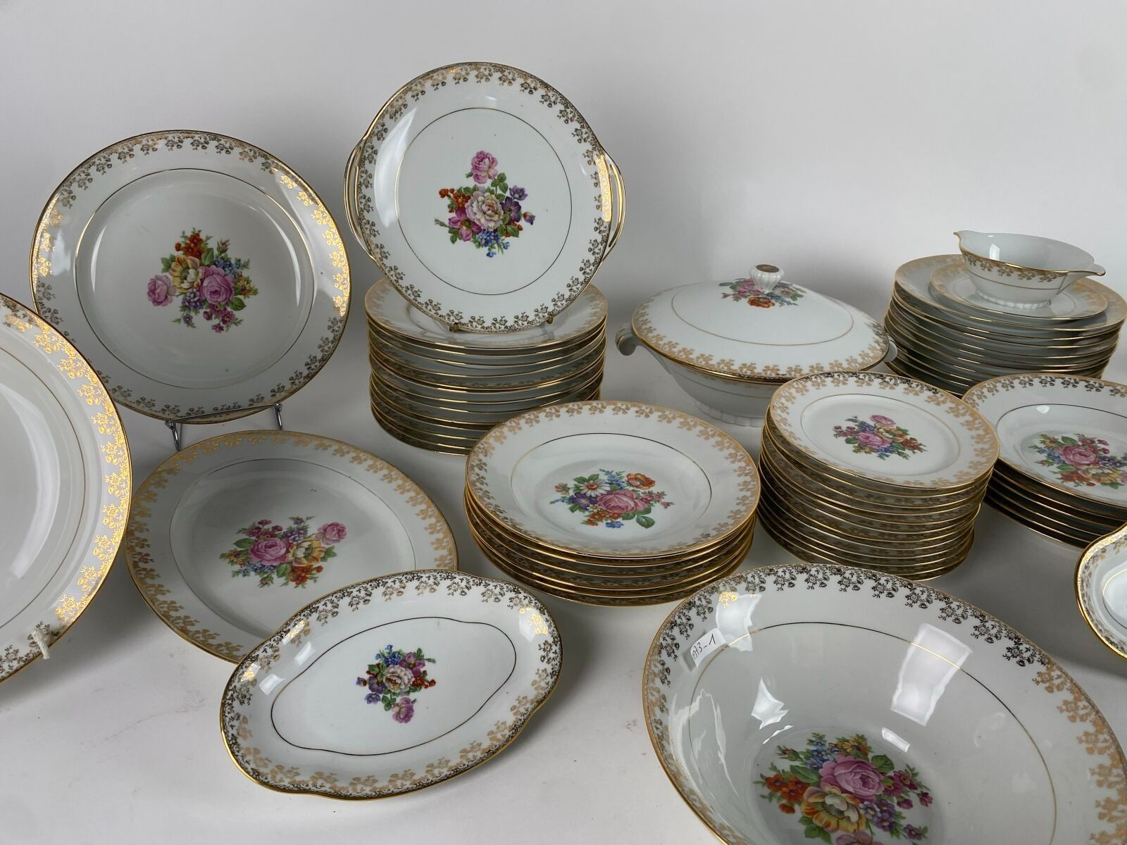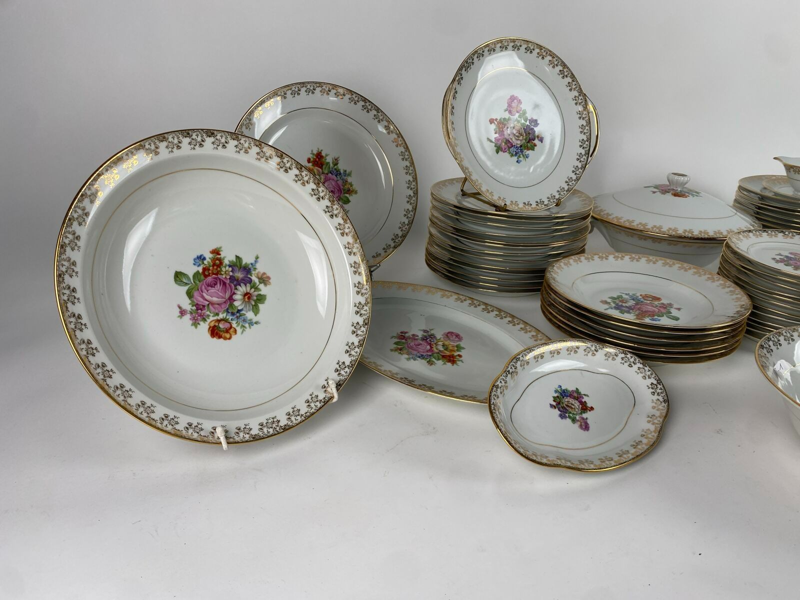 24 dinner plates, 12 soup plates, 1 coffee pot, 1 milk jug, 1 sugar bowl, 1 oval platter, 2 ravioli dishes, 1 sauce boat, 12 dessert plates, 1 tureen, 4 round dishes, 11 cups and 12 saucers. Slight chipping and slight missing gilding.
