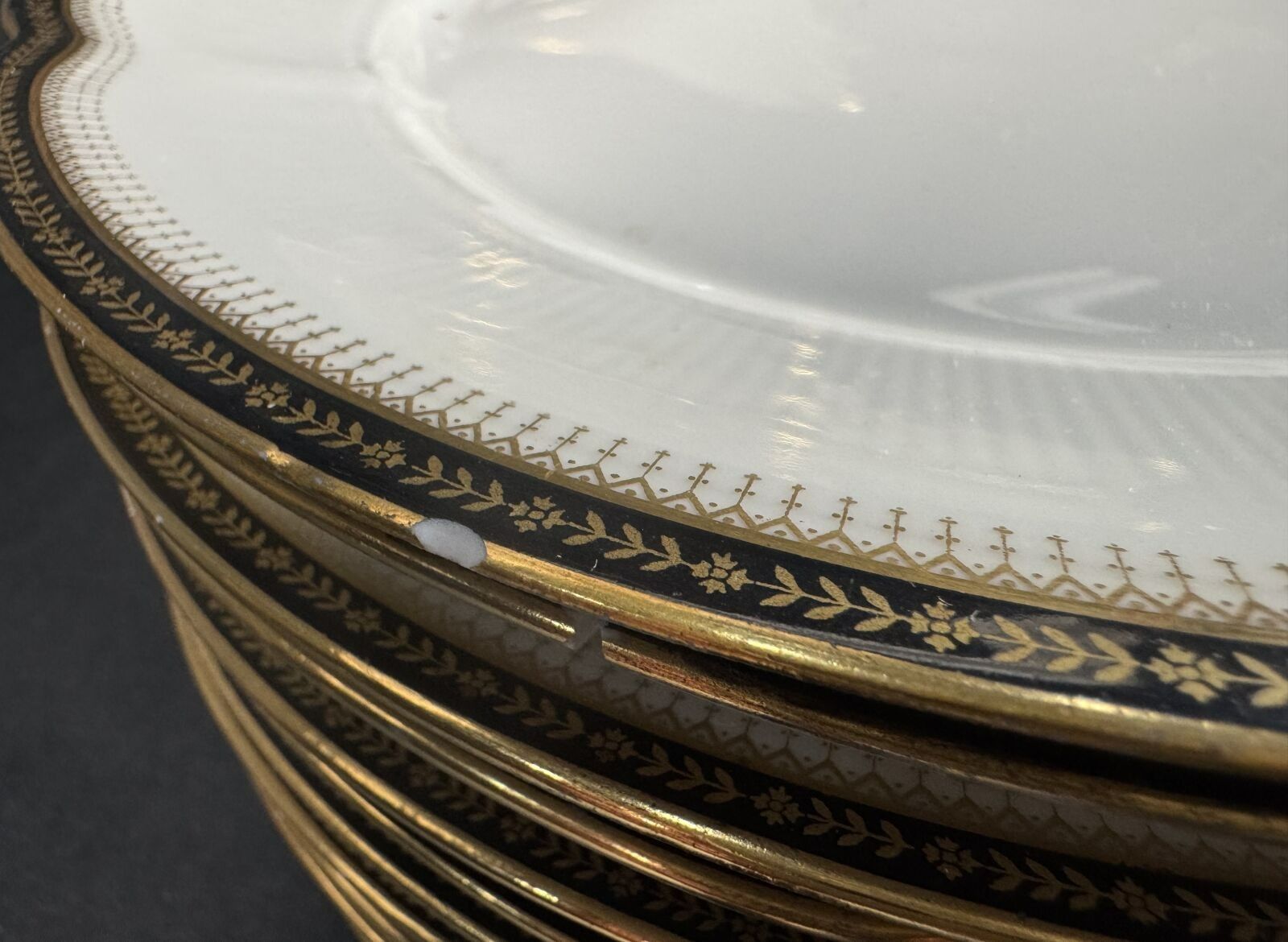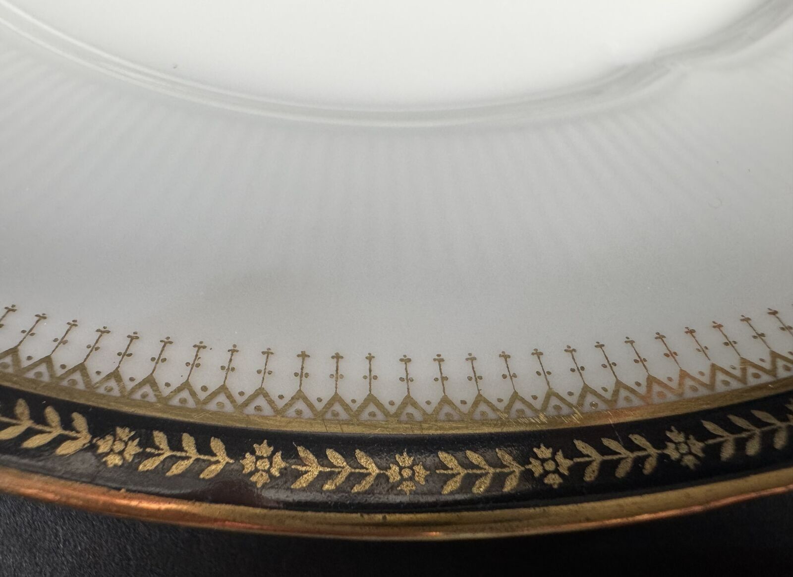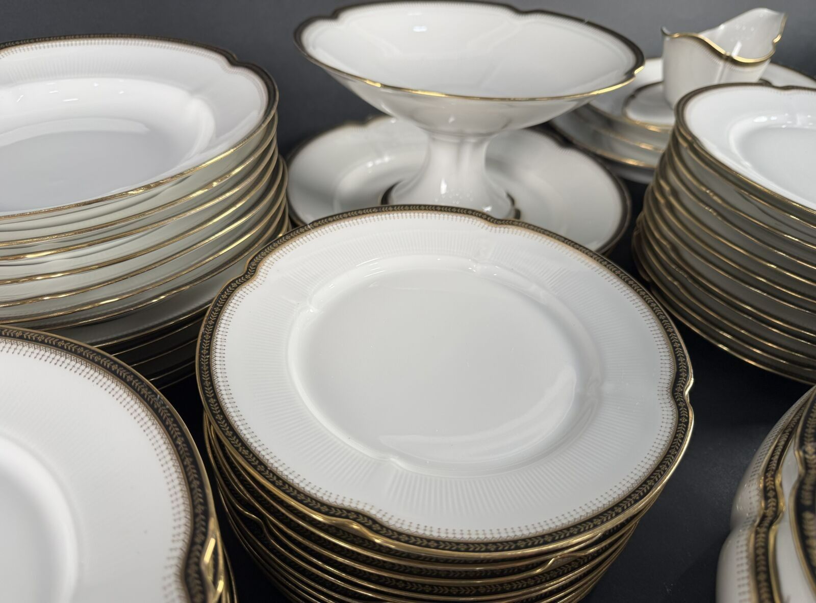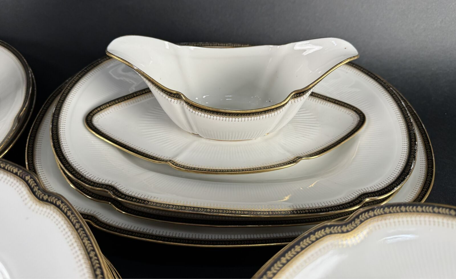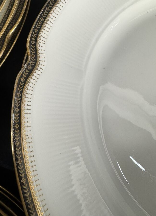 Porcelain service decorated with gold friezes on a black background comprising 35 dinner plates, 12 soup plates, 10 dessert plates, 2 round deep dishes, 3 oval dishes (2 smaller and 1 larger), 1 sauce boat, 1 soup tureen, 1 cake stand.