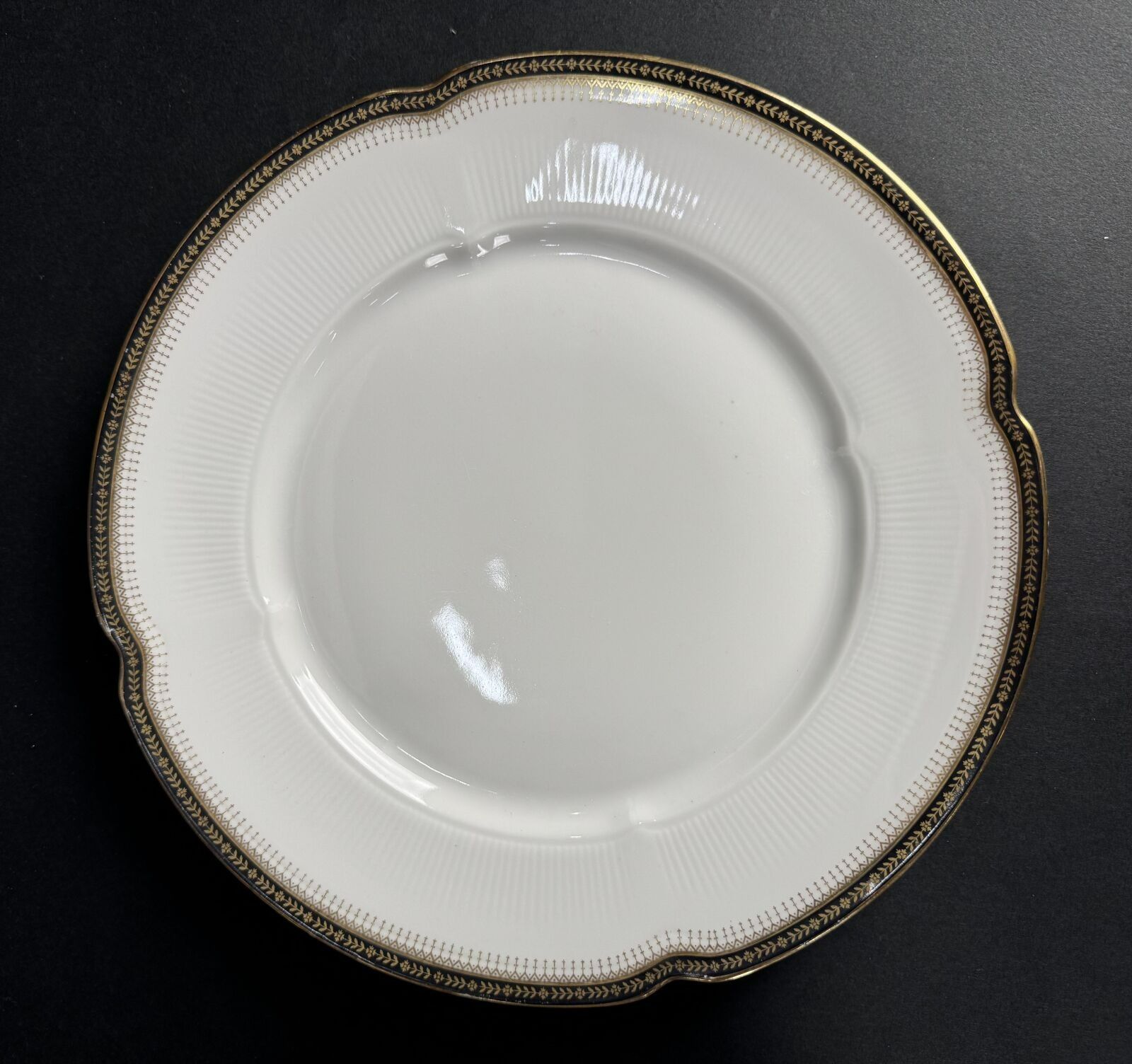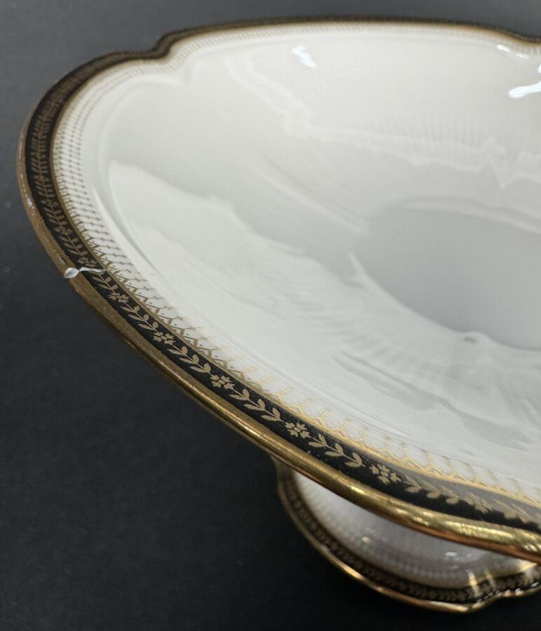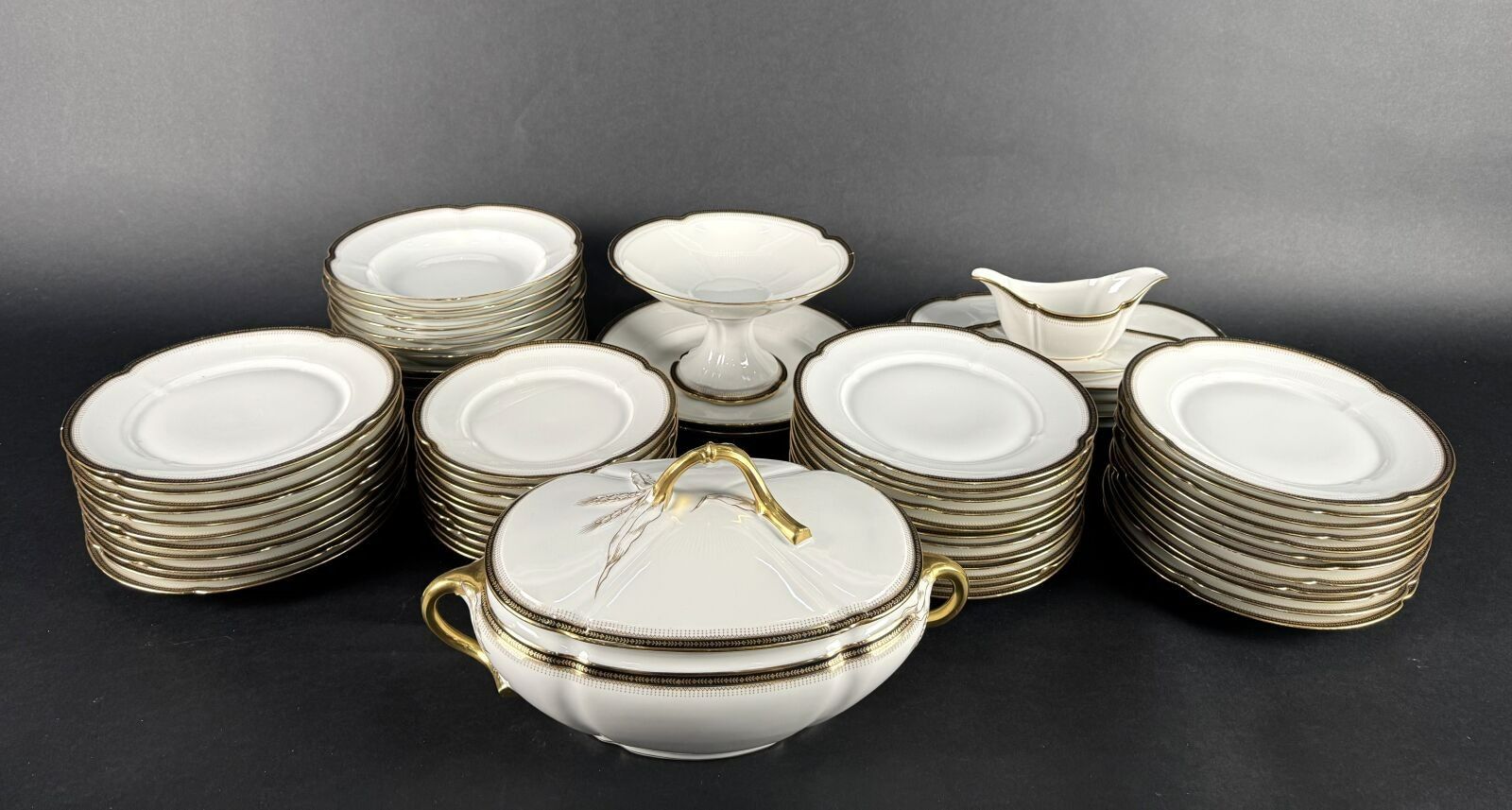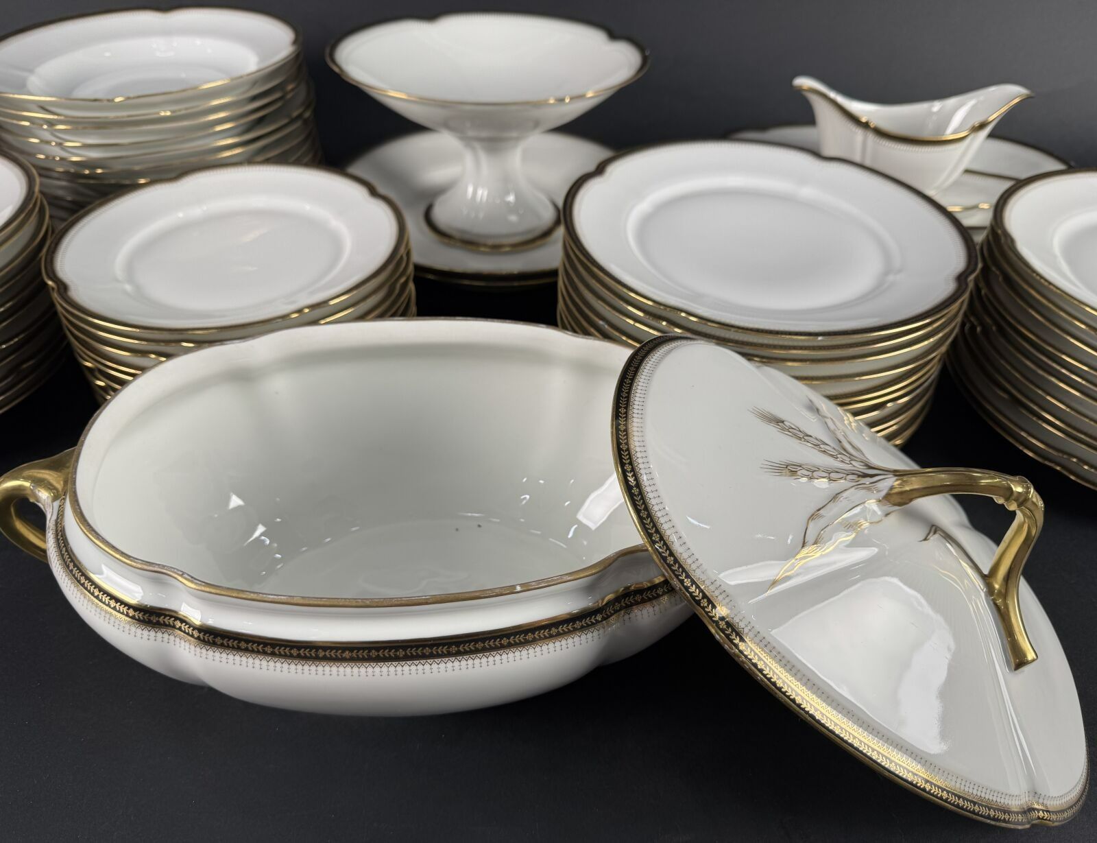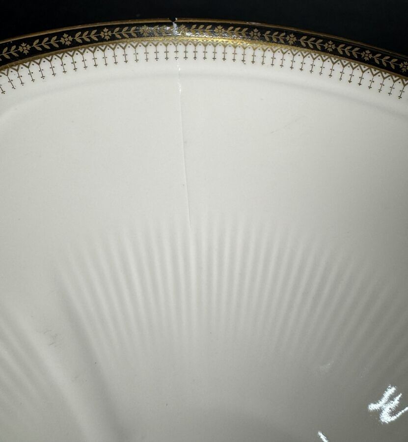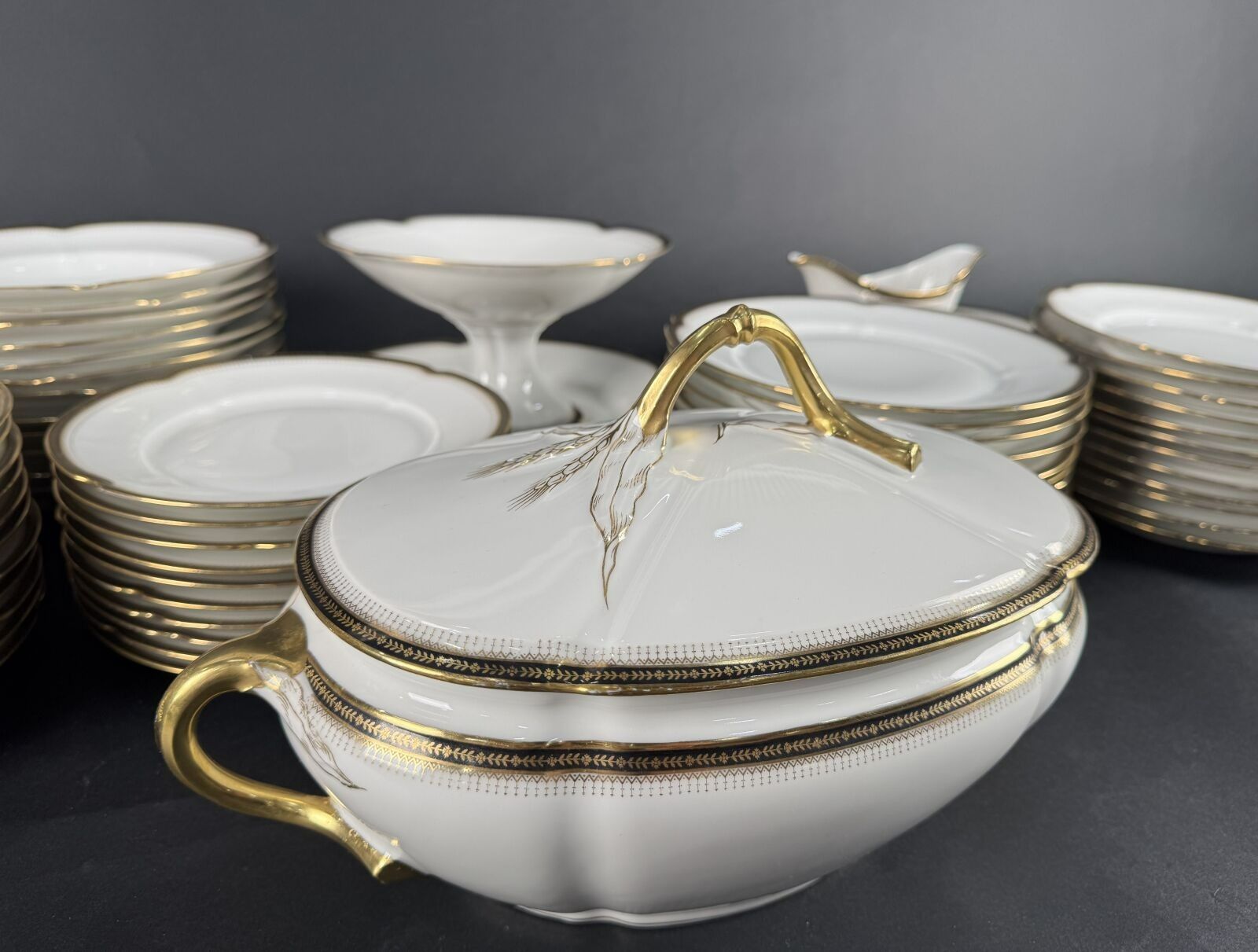 Porcelain service decorated with gold friezes on a black background comprising 35 dinner plates, 12 soup plates, 10 dessert plates, 2 round deep dishes, 3 oval dishes (2 smaller and 1 larger), 1 sauce boat, 1 soup tureen, 1 cake stand.