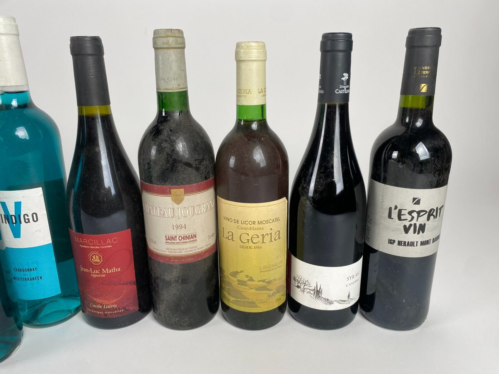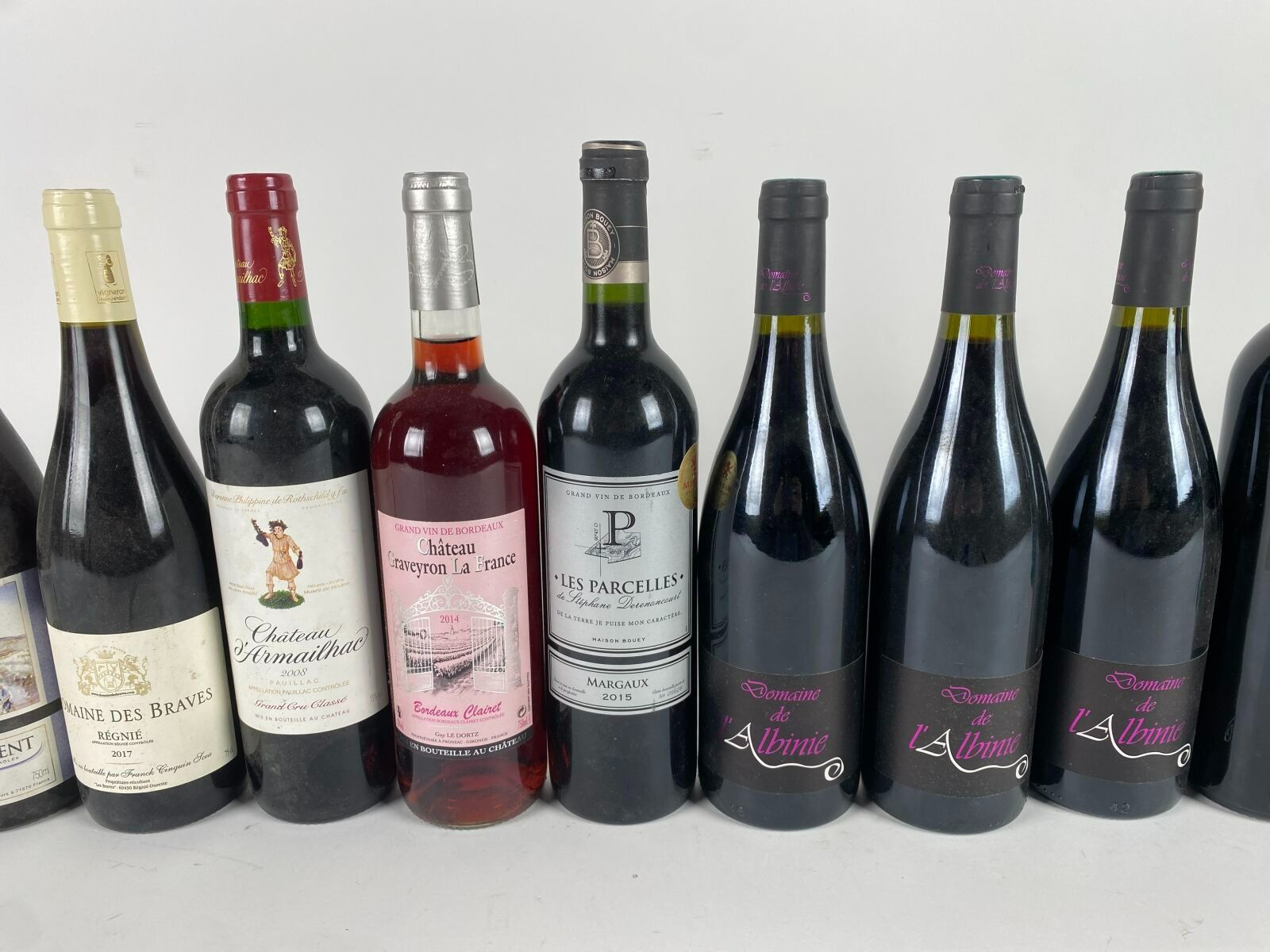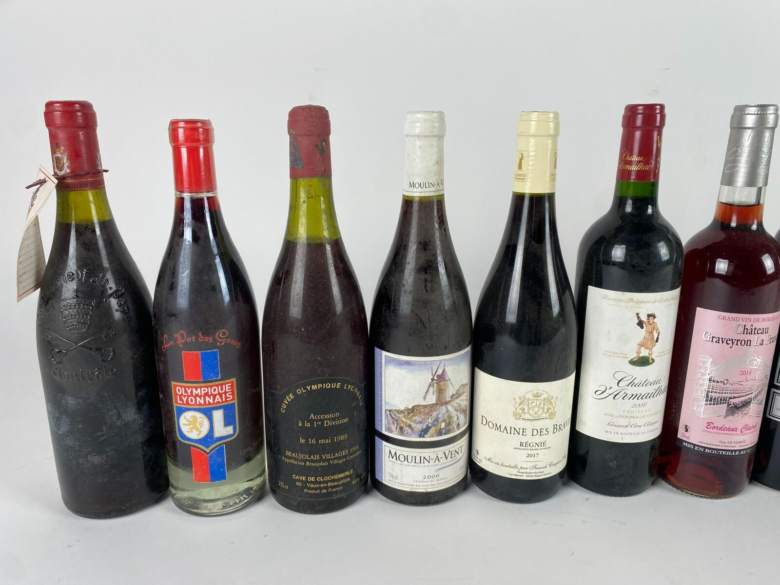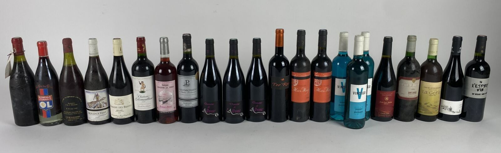 ASSORTIMENT of 22 bottles of red, white and rosé wines : [BORDEAUX] CHÂTEAU D'ARMAILHAC, Pauillac 5ème GCC, 2008 ; LES PARCELLES DE S. DERONCOURT, Margaux, 2015 : CHÂTEAU GRAVEYRON LA FRANCE, Bordeaux Clairet, 2014 [PERIGORD and AVEYRON] MARCILLAC, Domaine de l'Albinie, 3 bottles, 2014; MARCILLAC, Cuvée Laïris, 2012; PERIGORD, Ter'Raz [BEAUJOLAIS, LYONNAIS and CÔTES DU RHONE] CHÂTEAUNEUF-DU-PAPE, Domain de Beaurenard, 1990 (front label missing); MOULIN-A-VENT, 2000; RÉGNIÉ, Domaine des Braves, 2017 ; BEAUJOLAIS VILLAGE, 1998 and CÔTEAUX DU LYONNAIS [SOUTHERN WINE] SAINT-CHINIAN, Château Jougrand, 1994 ; IGP HERAULT MONT BAUDILE, L'Esprit vin, 2018 ; PAYS D'OC, Domaine de Castelneau, Cayenne, 2018 ; VINDIGO CHARDONNAY, 3 bottles ; IGP D'OC, Domaine Mas Neuf, 2 bottles, 2010 [SPAIN] LA GERIA, Vino de Licor Moscatel
