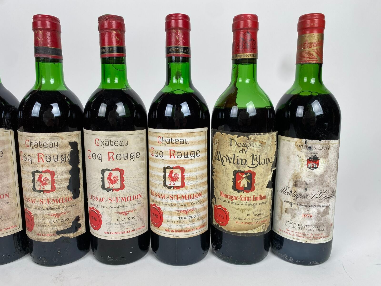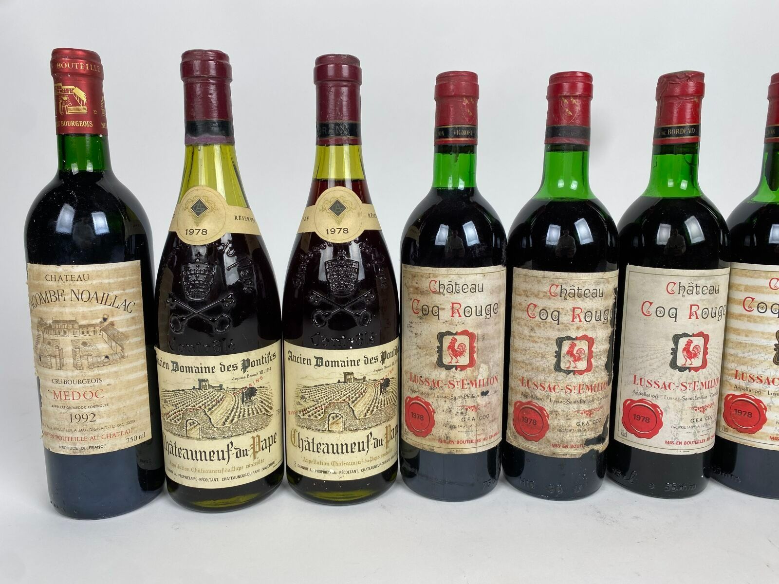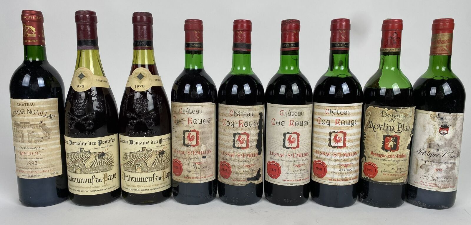 ASSORTIMENT of nine bottles: CHATEAUNEUF DU PAPE. Ancien Domaine des Pontifes, two bottles, 1978; MEDOC. Cru Bourgeois, Château Lacombe Noaillac, one bottle, 1992; LUSSAC SAINT EMILION. Château Coq Rouge, four bottles, 1978; MONTAGNE SAINT EMILION. Vieilles Caves, one bottle, 1976 & Domaine du Moulin Blanc, 1976.