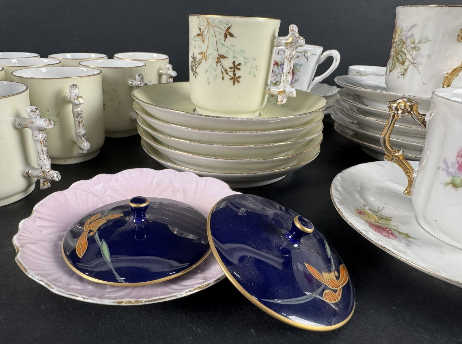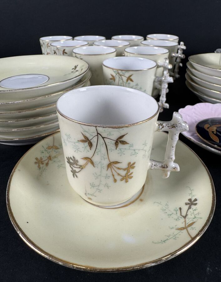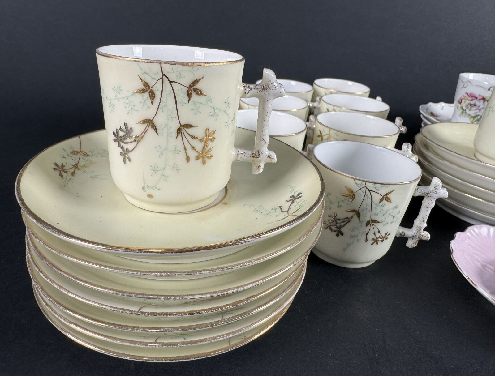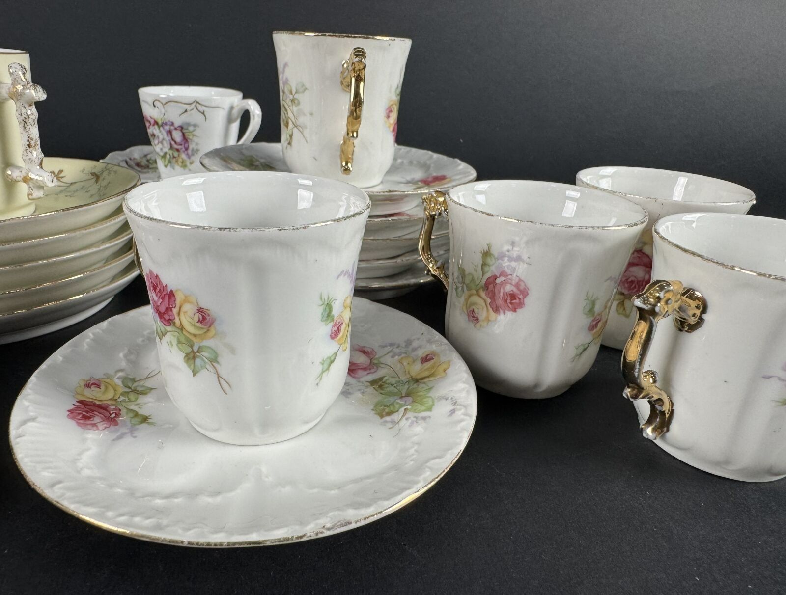 There is a set of 5 cups and 6 saucers with floral design and gilded handles, 2 cups and 3 saucers with floral design, 1 pale pink saucer and two lids.