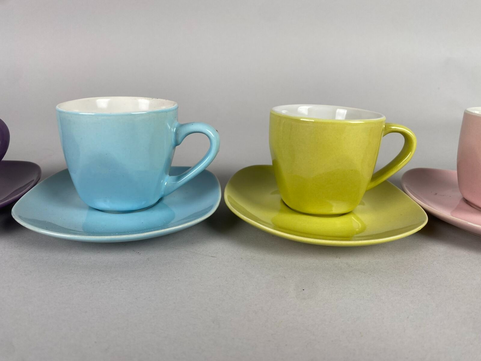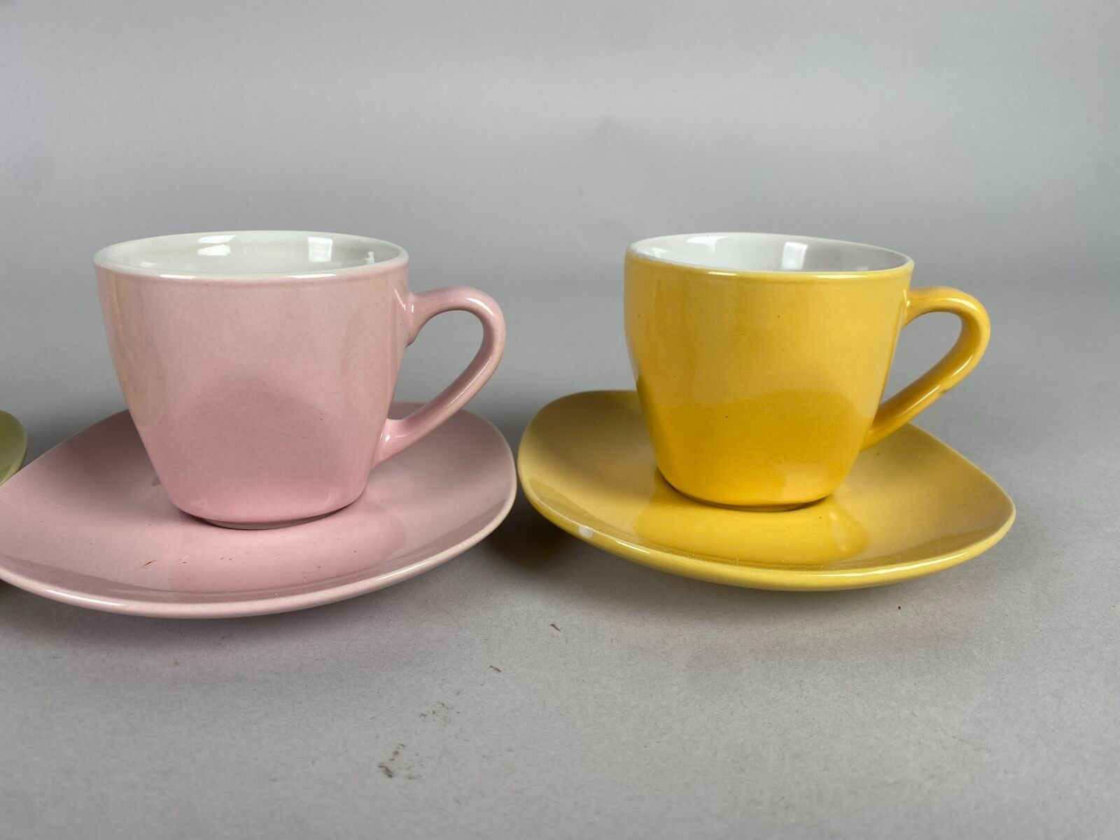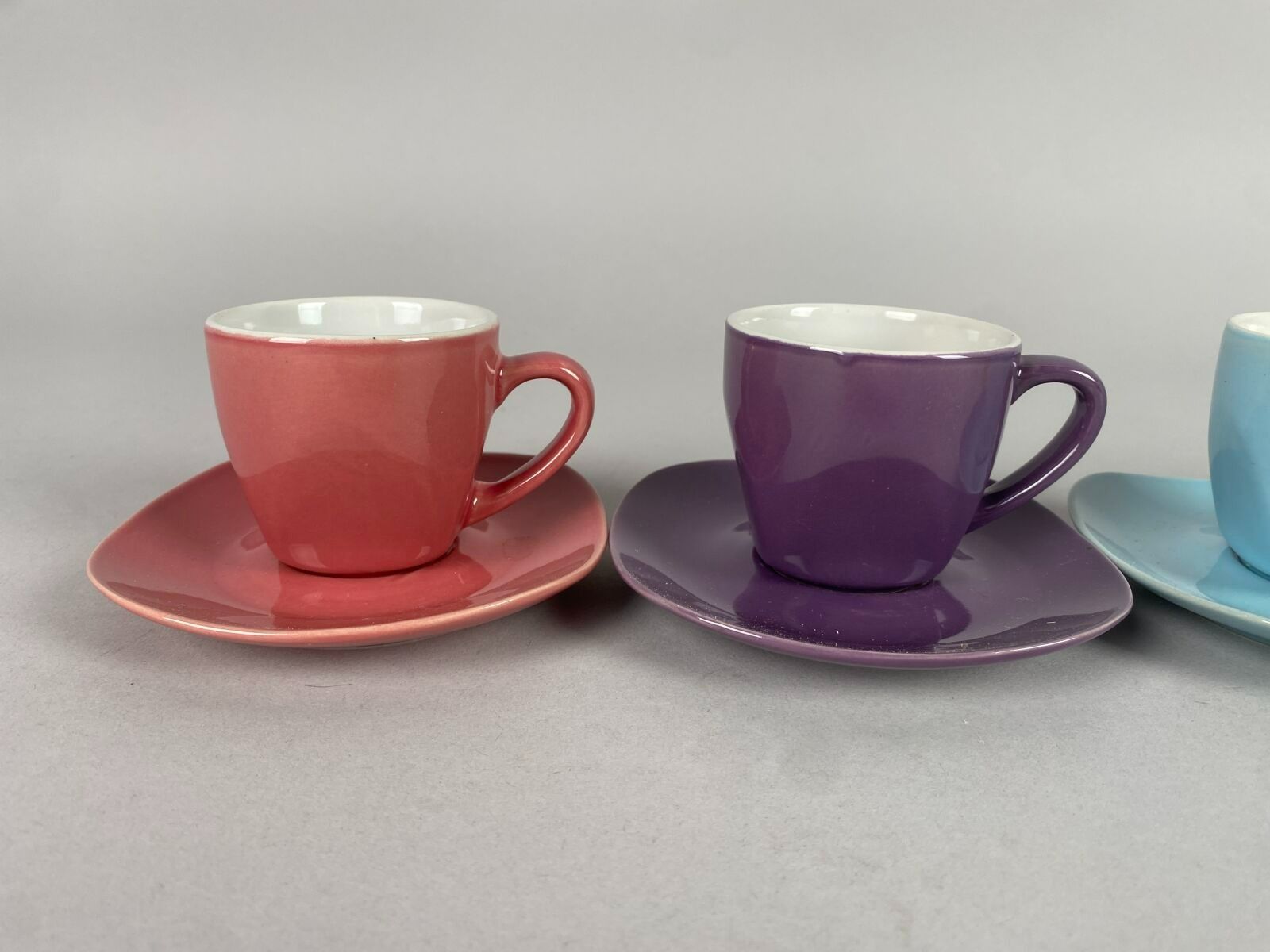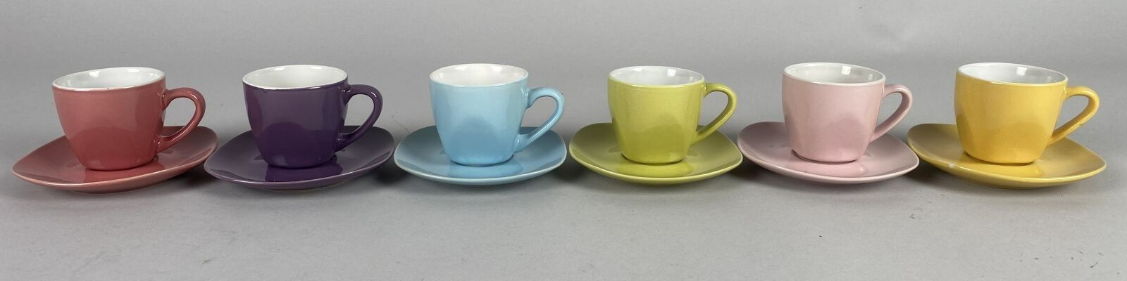 A multicoloured porcelain coffee set comprising six cups and six saucers.