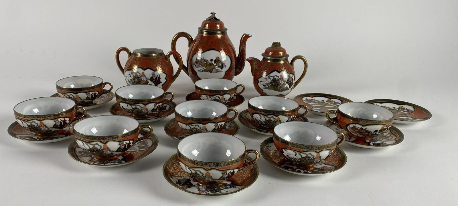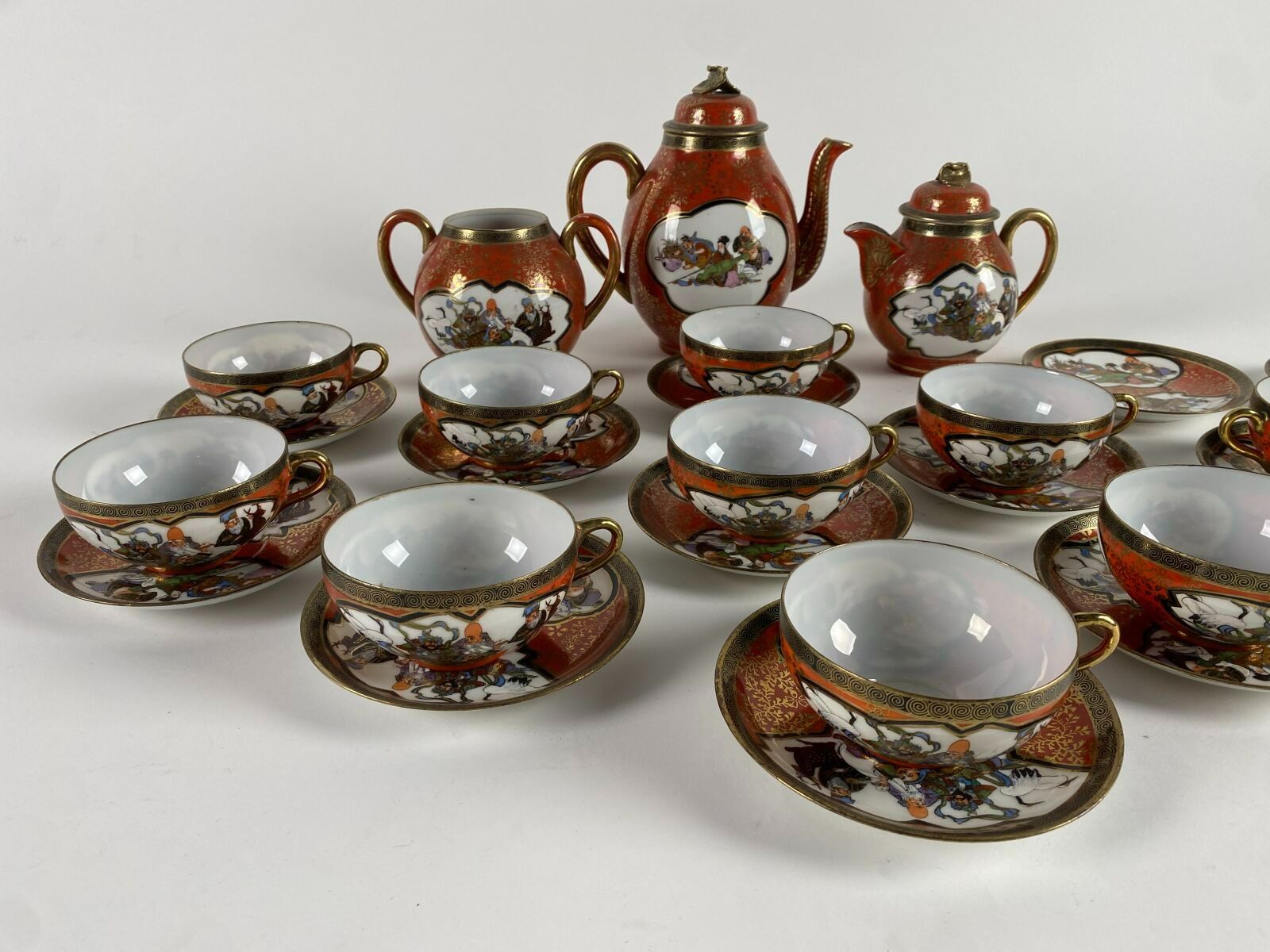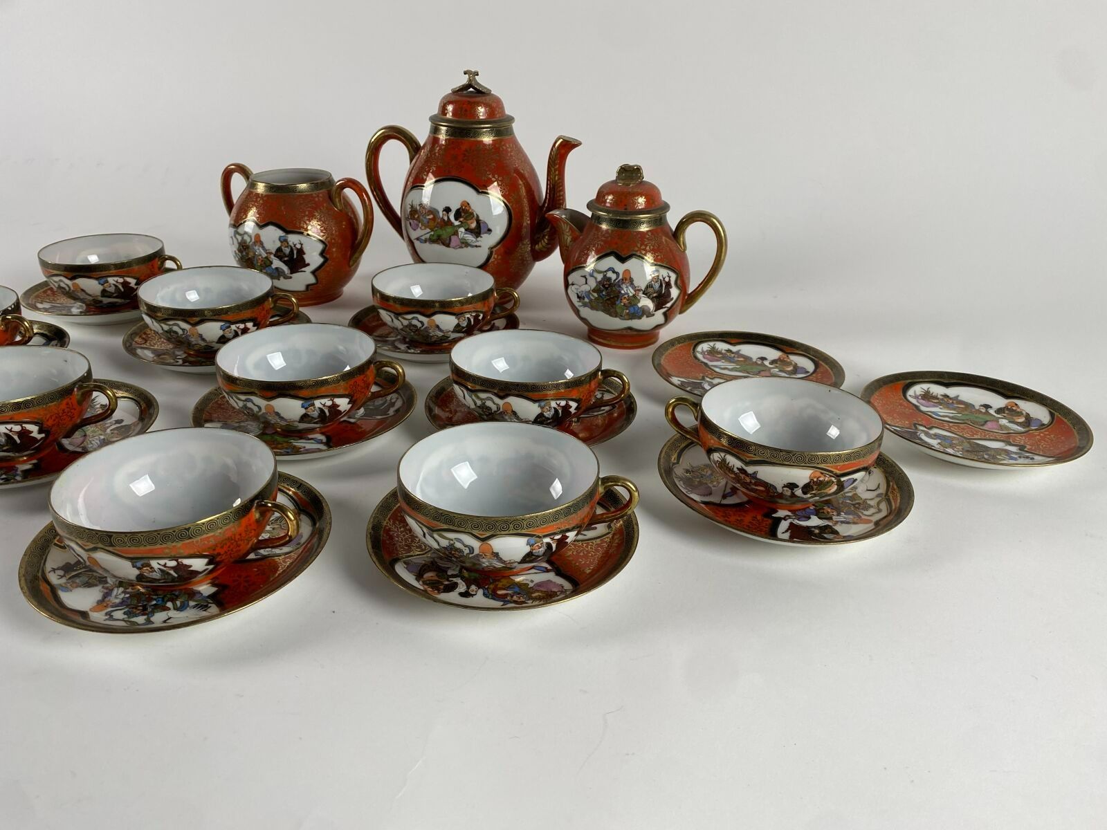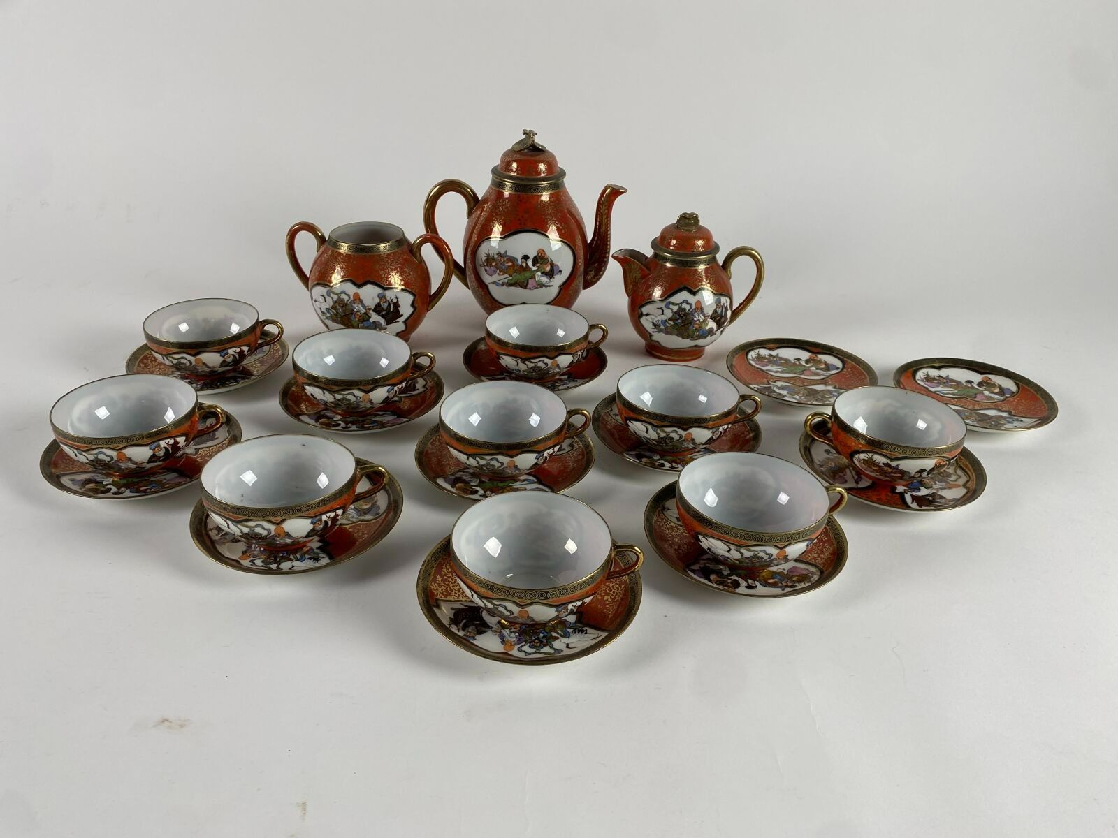 Part of a fine Japanese porcelain tea service comprising ten cups, eleven saucers, a teapot, a milk jug and a sugar bowl (the lid is missing).