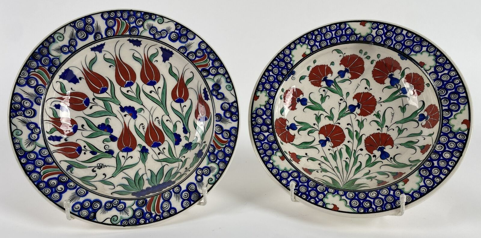 KUTAHYA - TURKEY. A pair of Iznik-style earthenware plates with hand-painted floral decoration and stylised foliage.