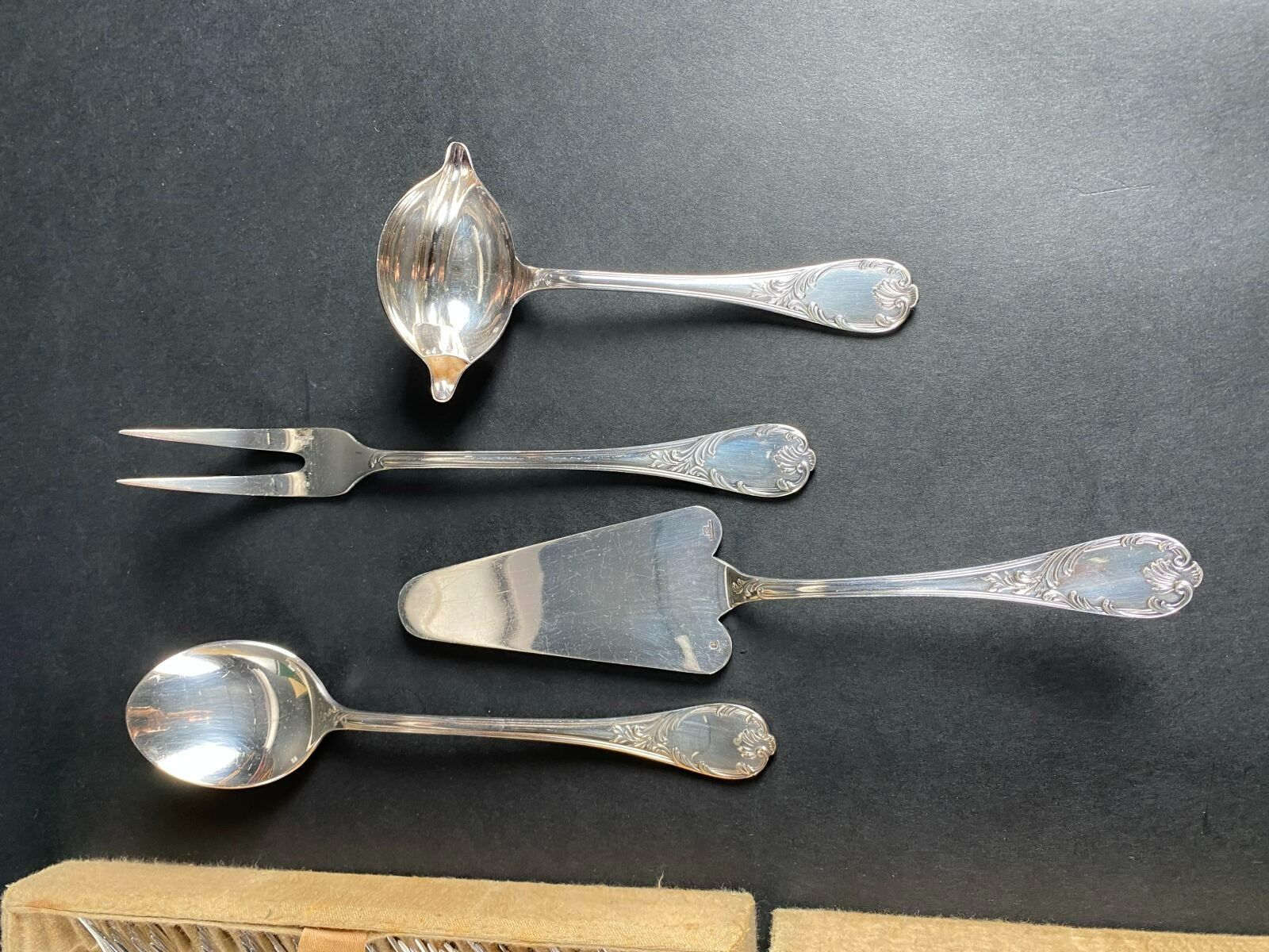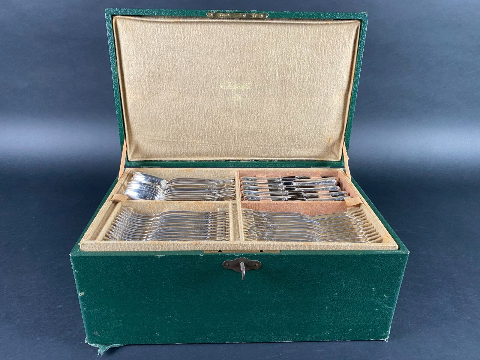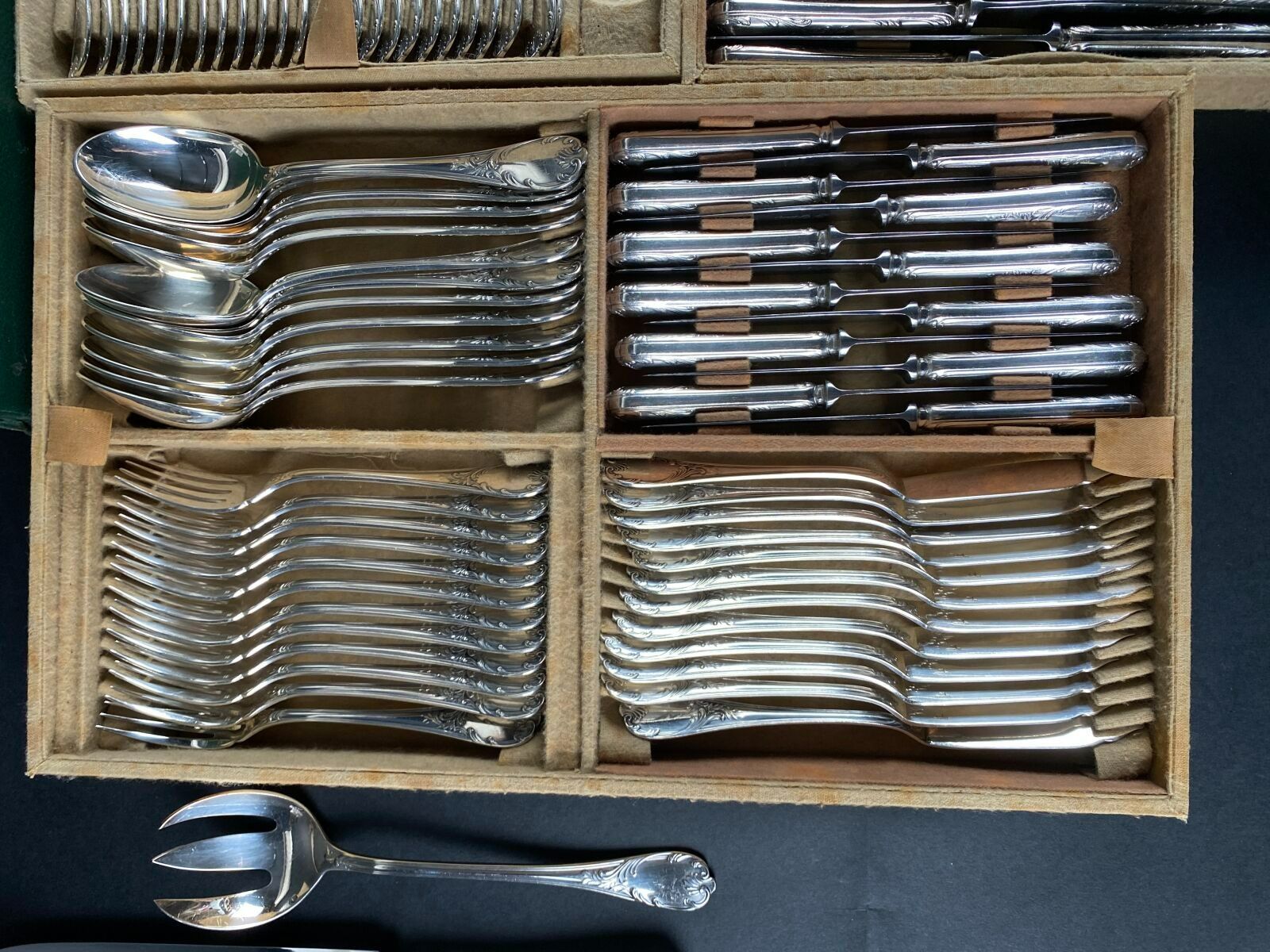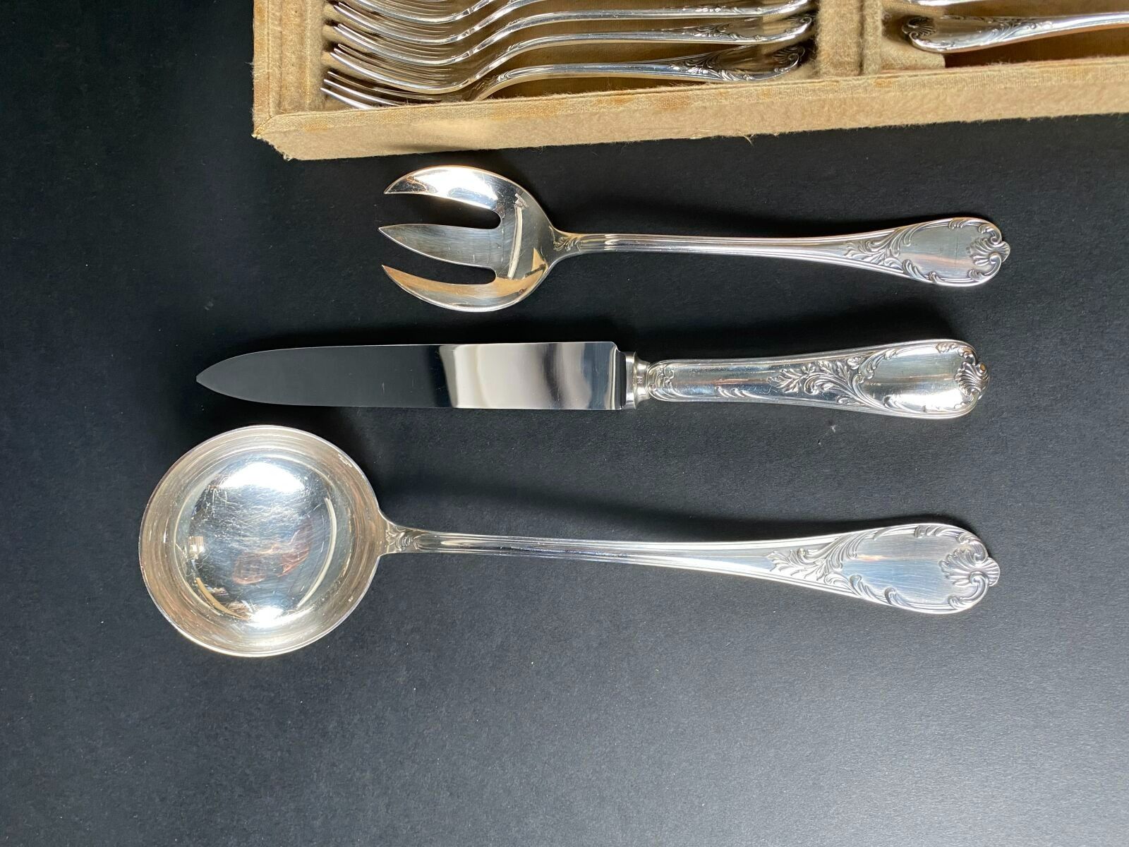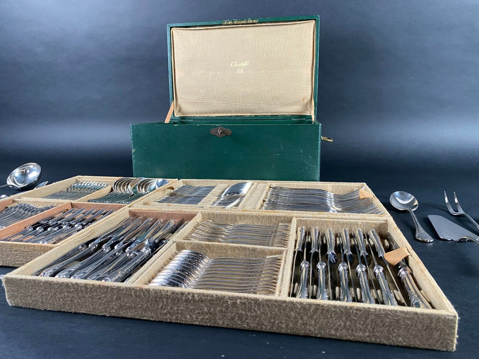 CHRISTOFLE. A Rocaille-style "Marly" menagère comprising approximately 150 pieces: twenty-four large forks, twelve knives and twelve fish forks, twelve spoons, twelve forks, twelve large spoons, twelve knives, twenty-four large knives, eleven dessert forks, twelve small spoons, a cutlery set, a ladle, a pie server, a sauce spoon and a sugar tong. All in a gift box.