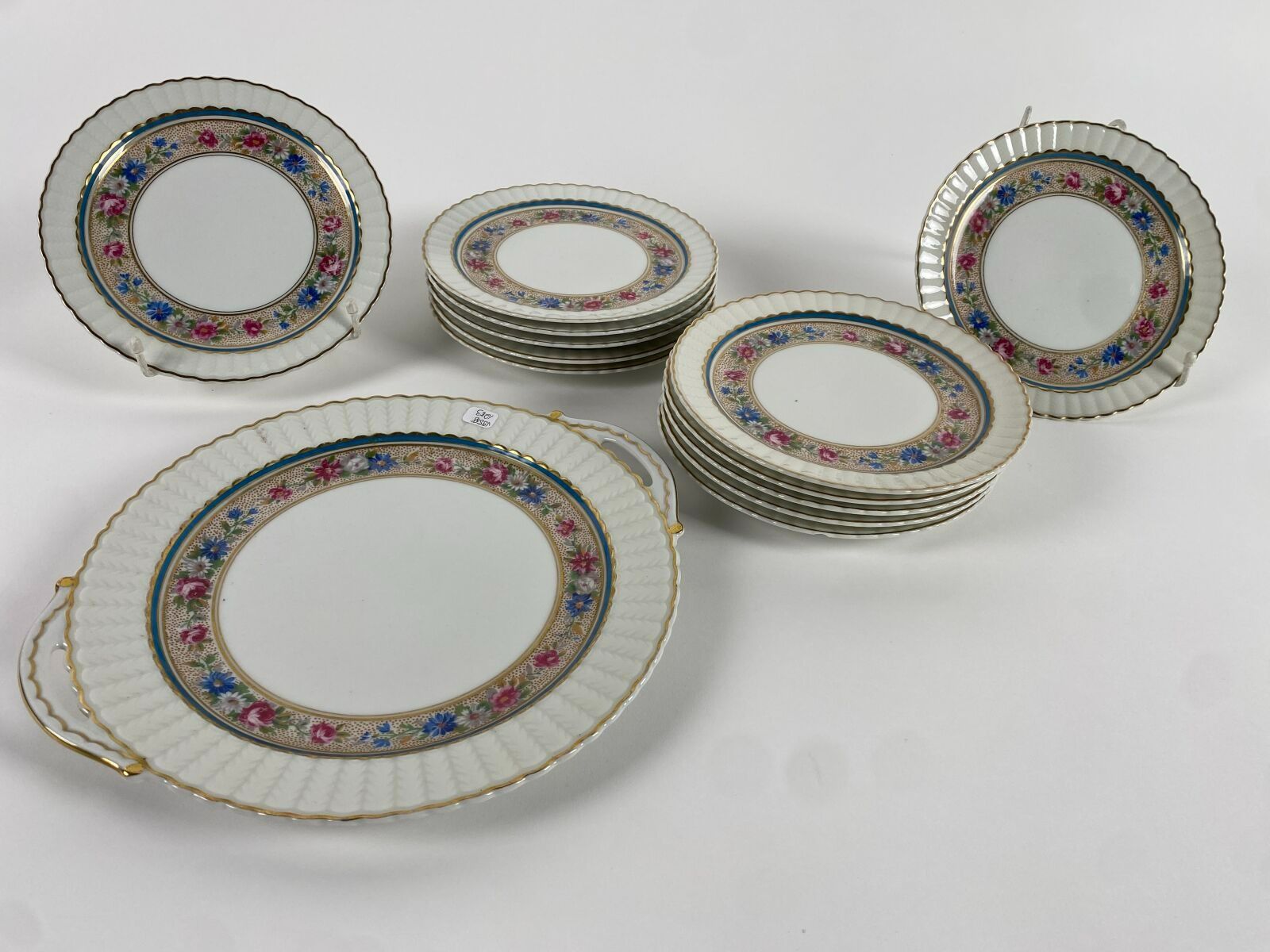 BERNARDEAU & CO in LIMOGES. Part of a white porcelain cake service decorated with a floral band and gilded fillet, comprising 12 dessert plates and 1 round dish with two handles.