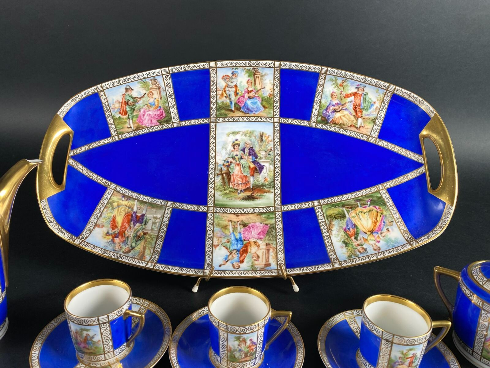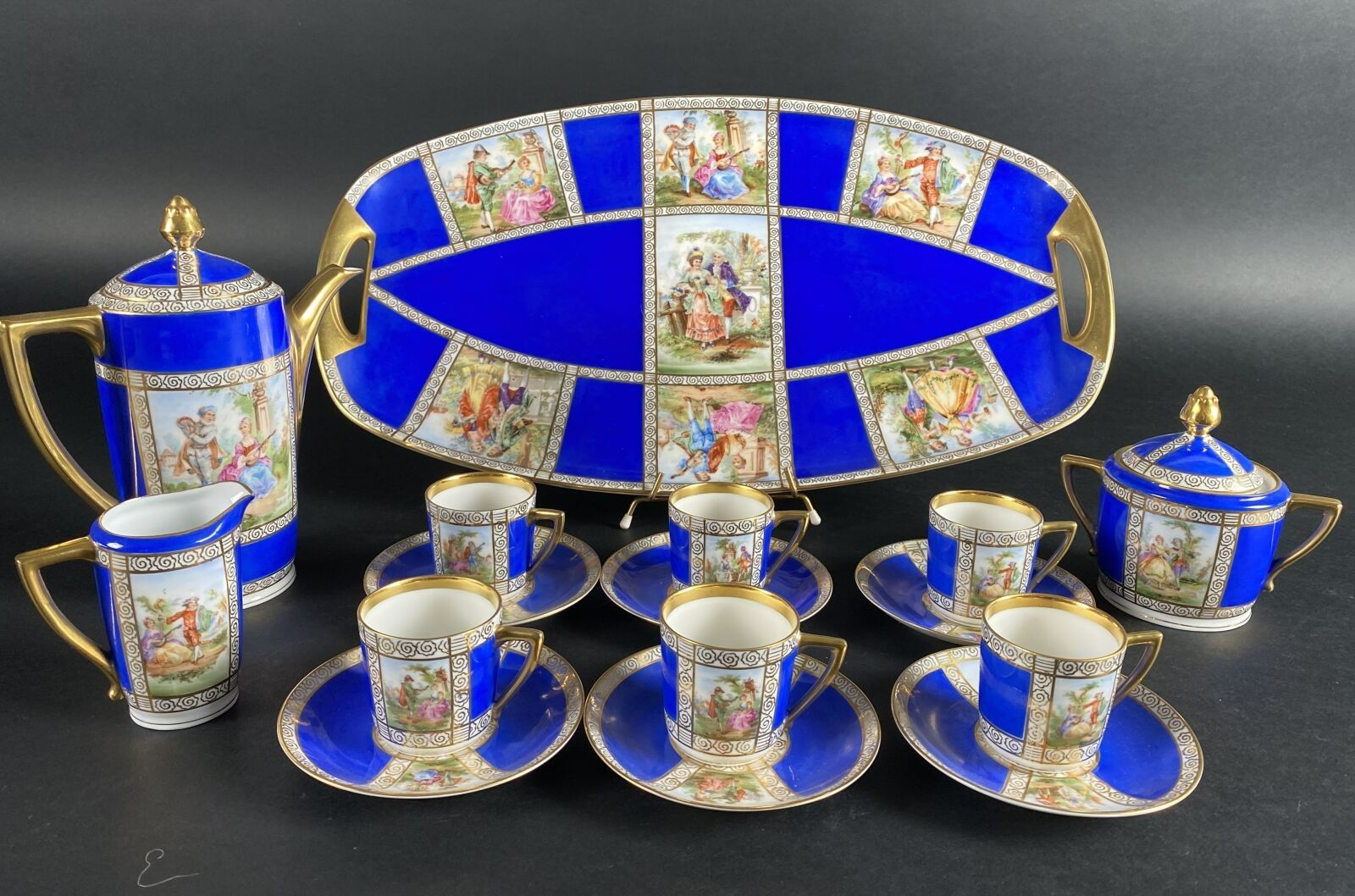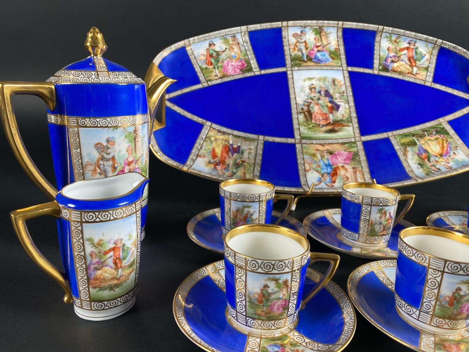 PIRKEN HAMMER. Part of a porcelain coffee service decorated with gallant scenes on a blue and gilt background, comprising six cups, six saucers, a sugar bowl, a coffee pot, a milk jug and a tray.