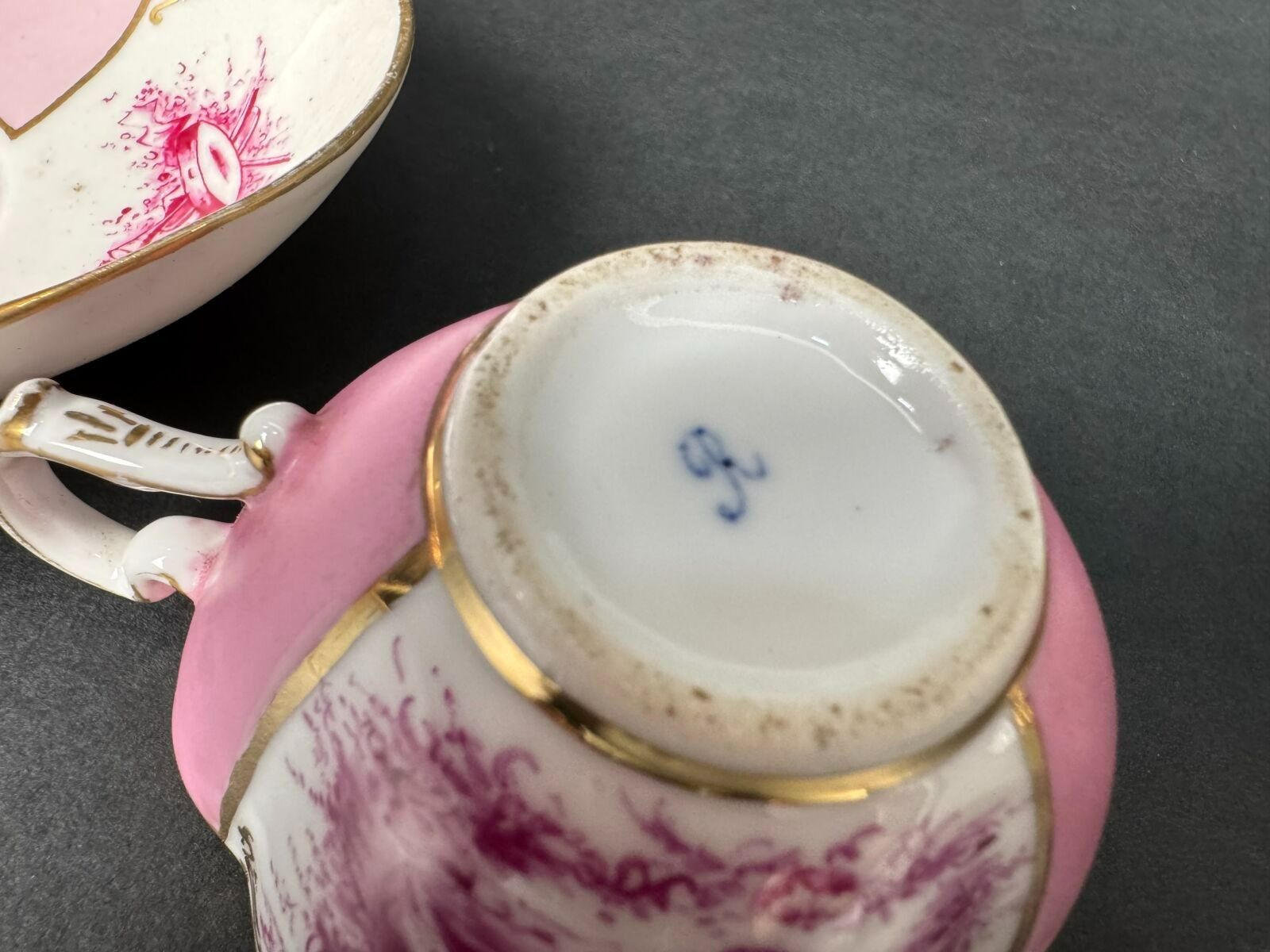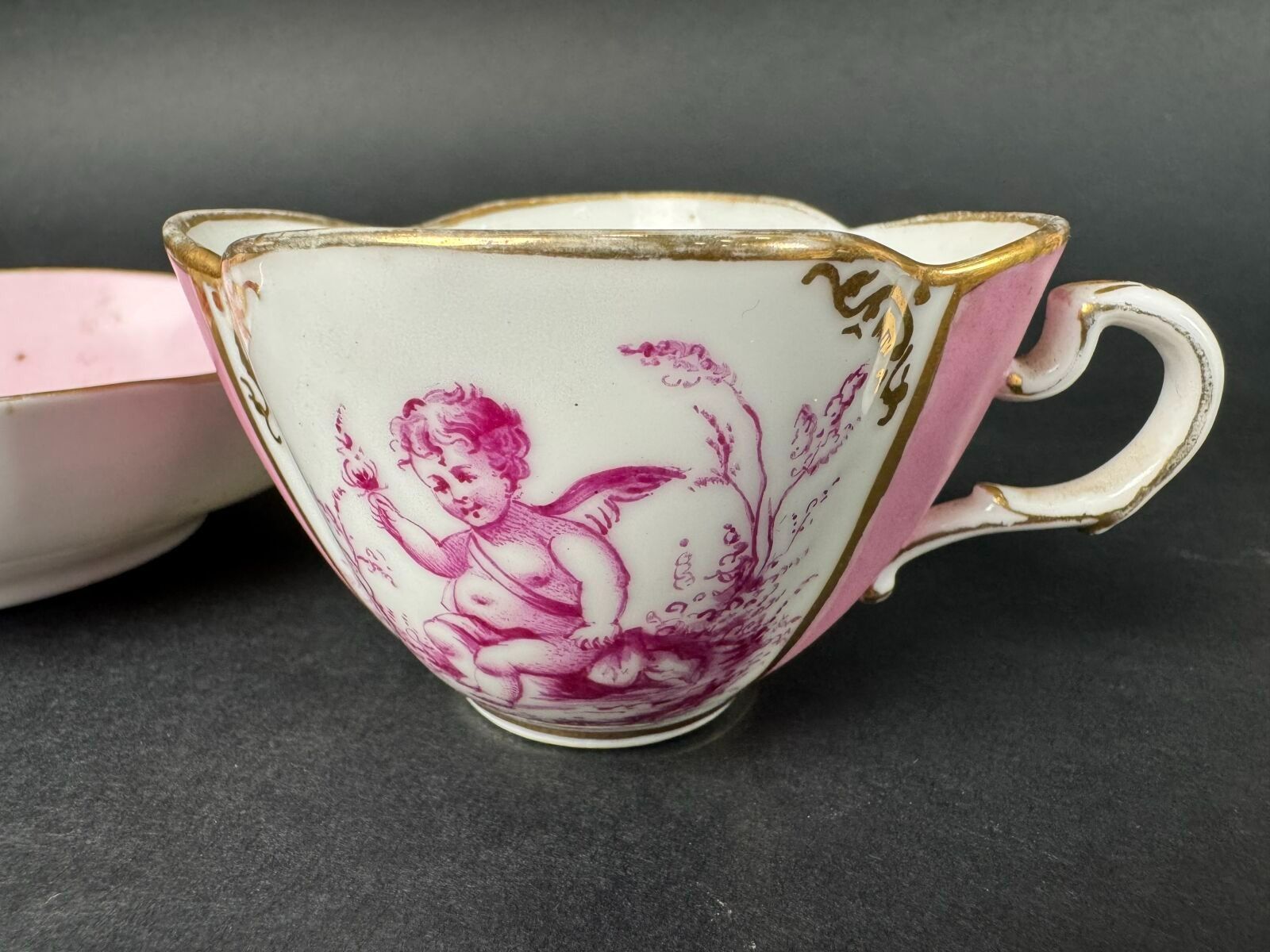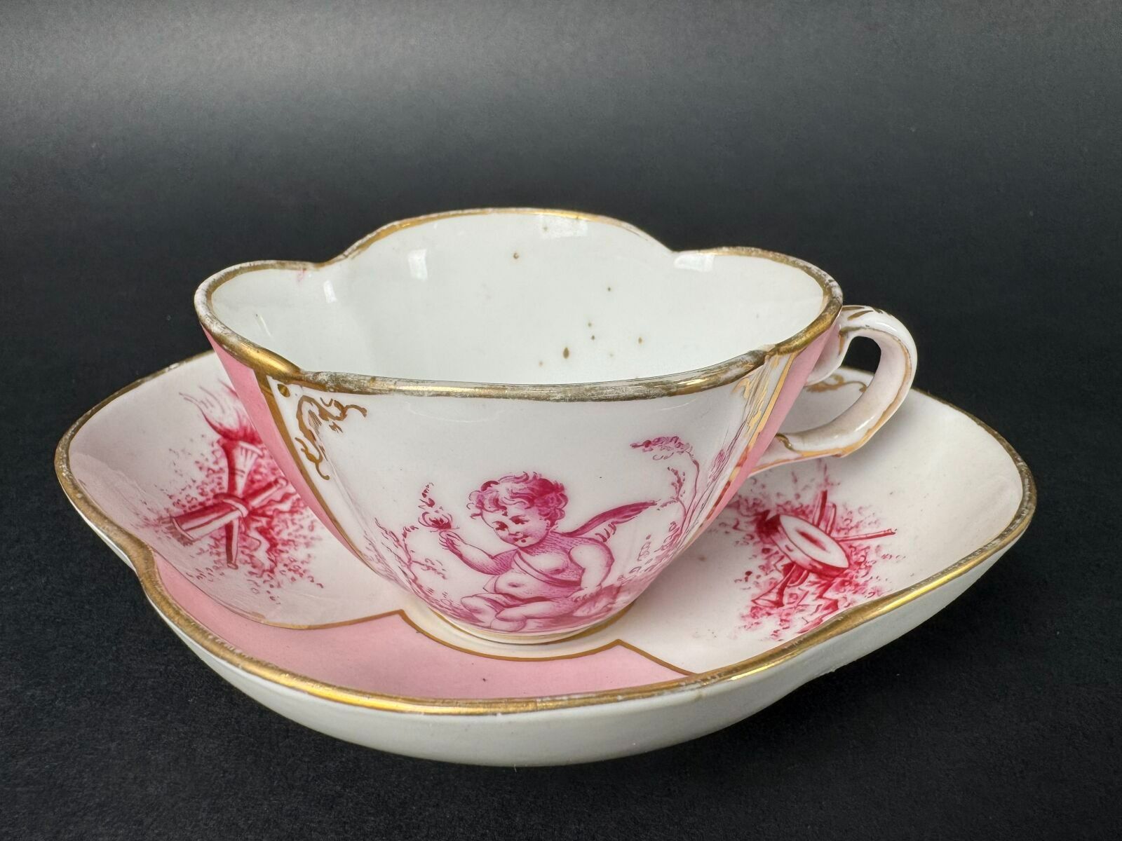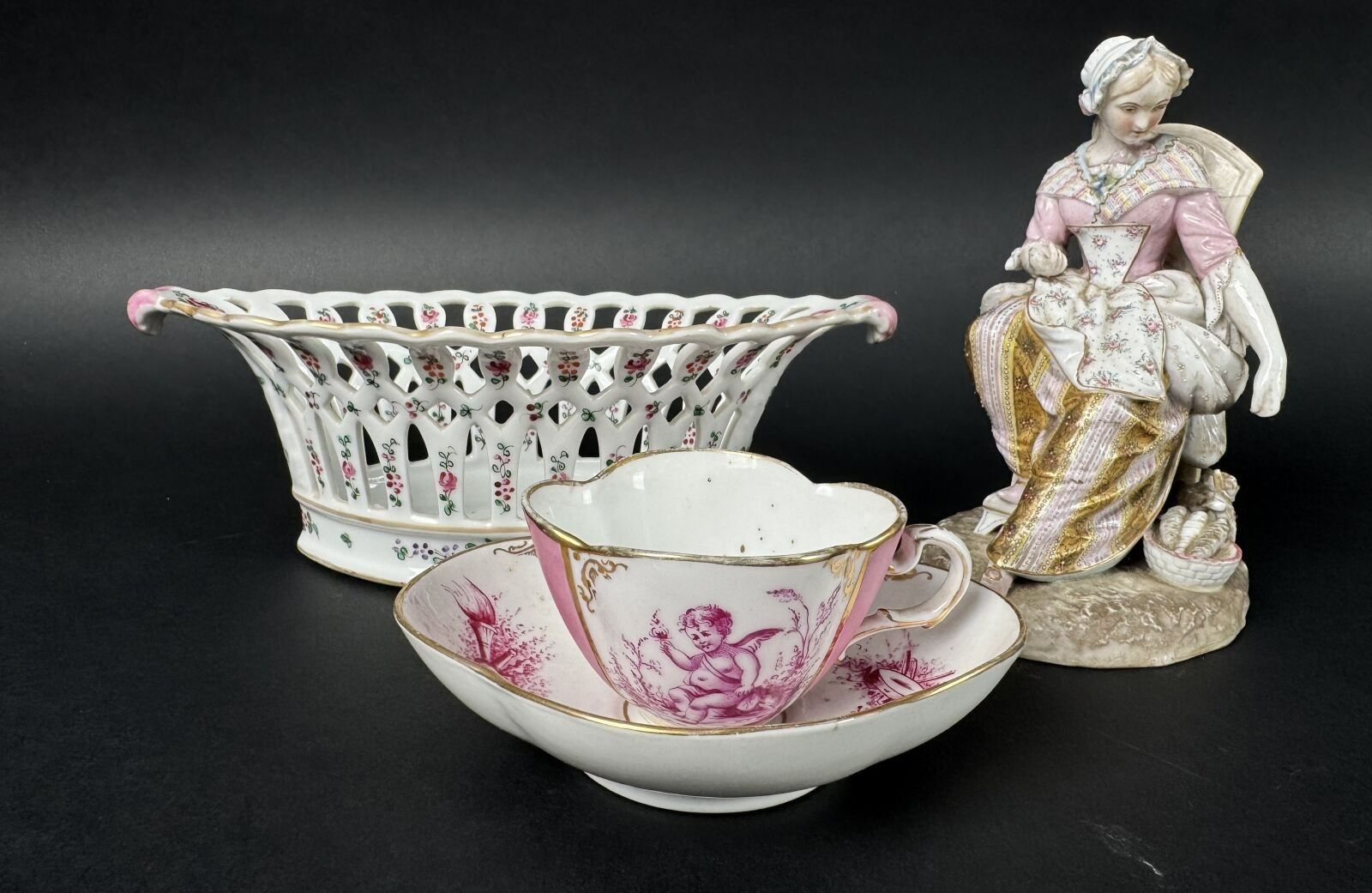 Sanson? An openwork earthenware basket, a biscuit subject (damaged, missing and restored), a porcelain cup and saucer decorated with putto and gardening attributes. Mark under the base