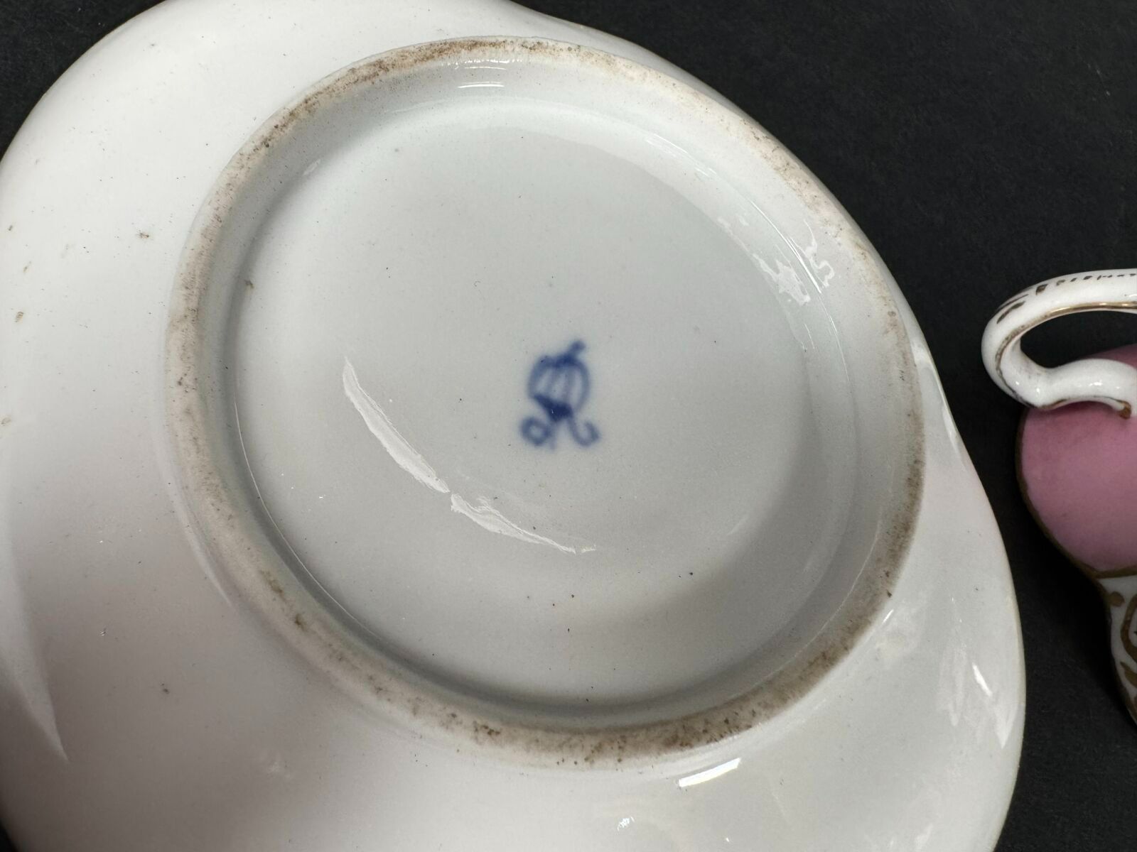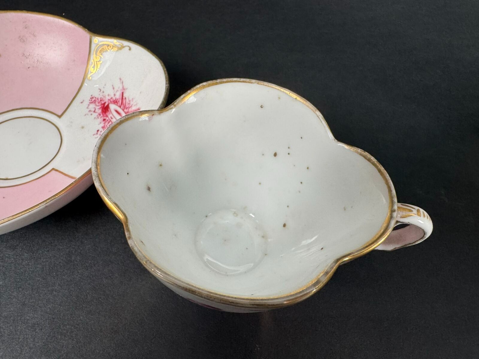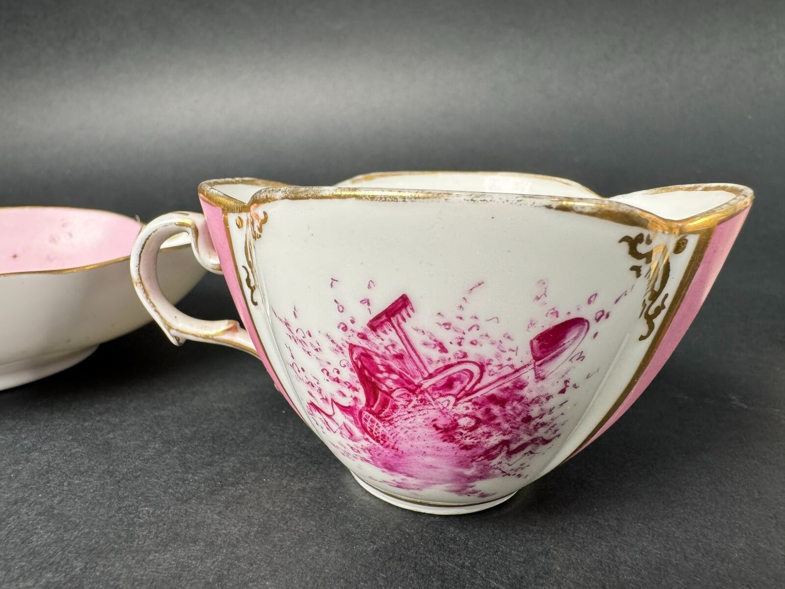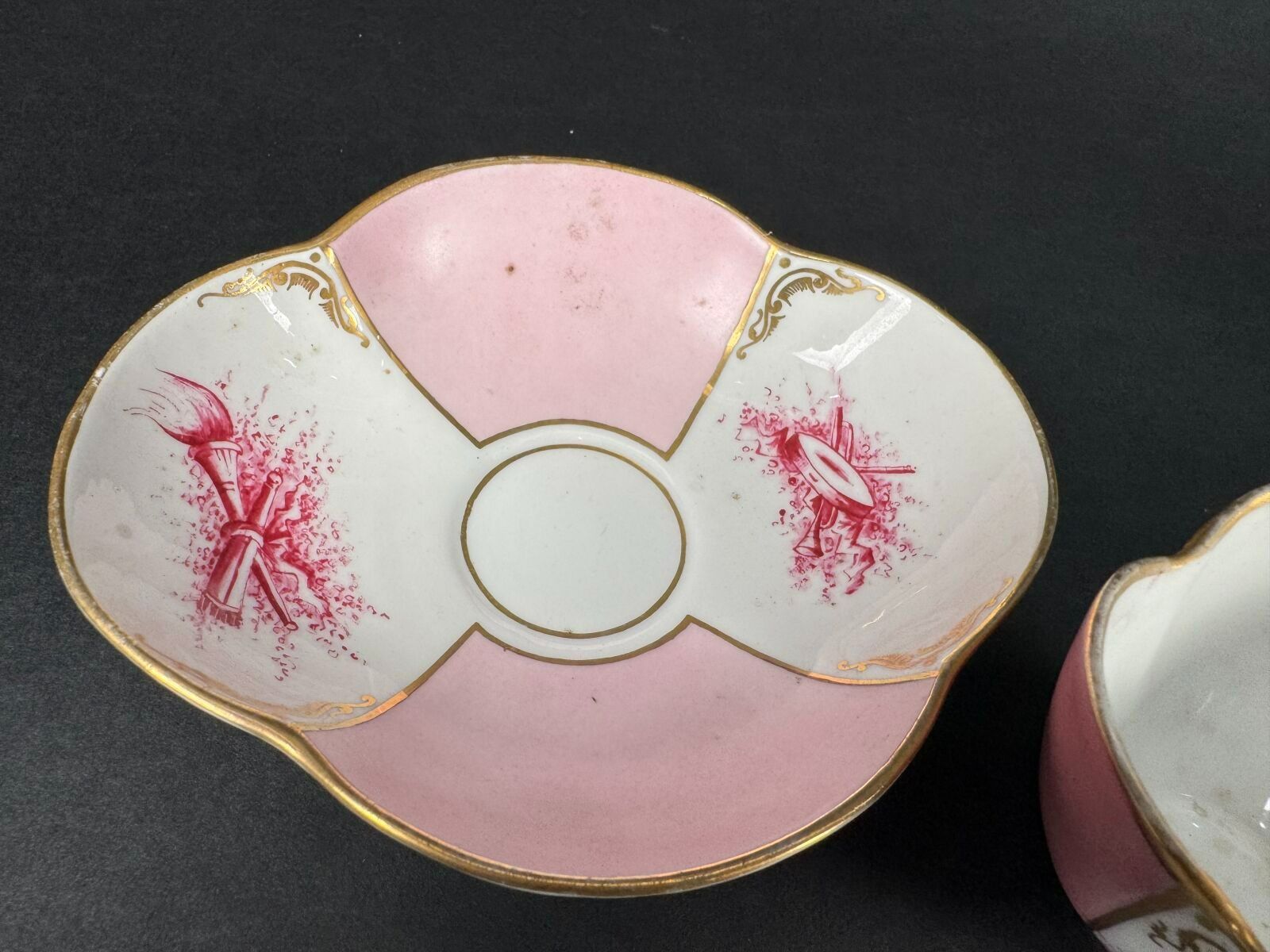 Sanson? An openwork earthenware basket, a biscuit subject (damaged, missing and restored), a porcelain cup and saucer decorated with putto and gardening attributes. Mark under the base