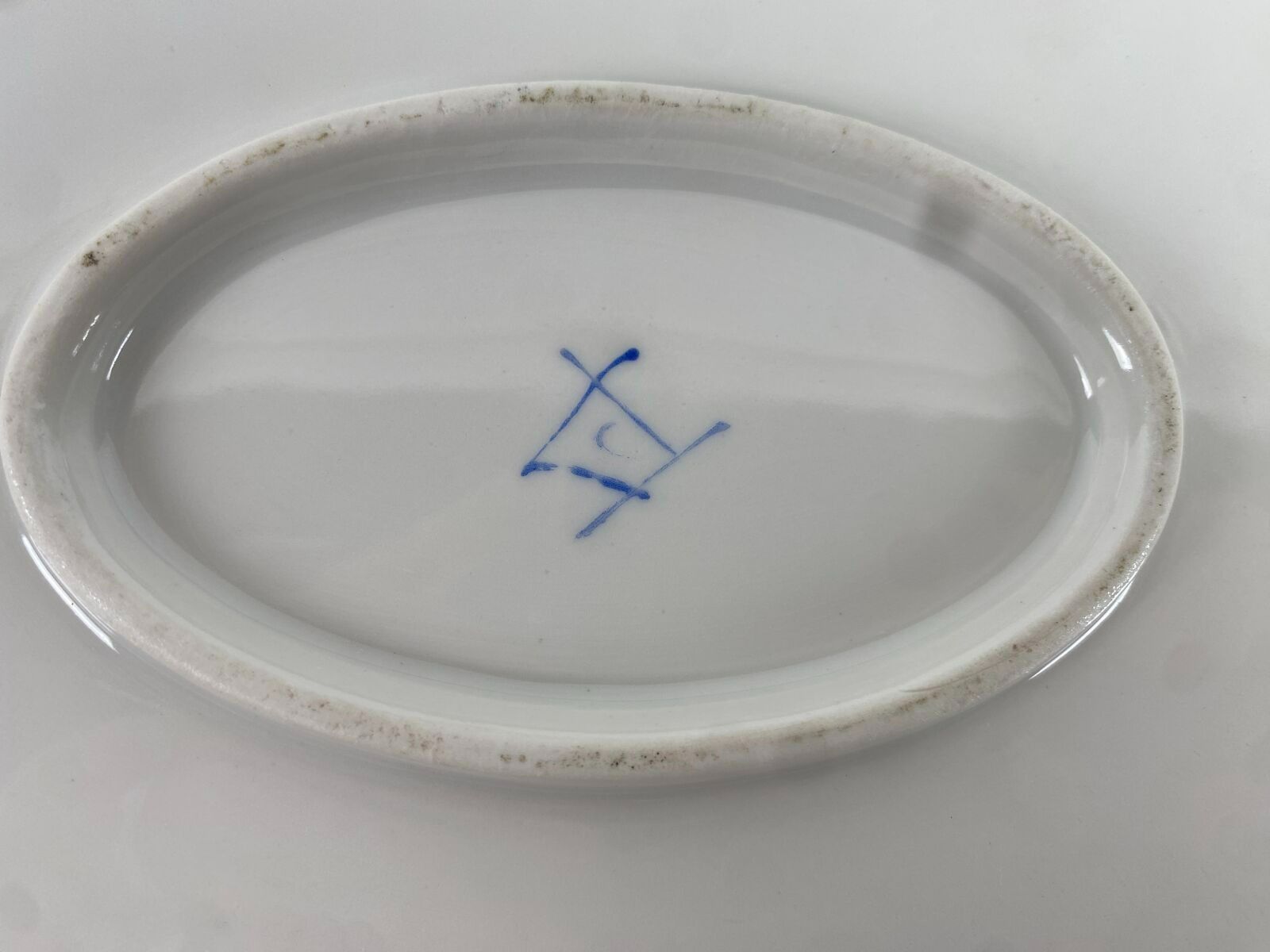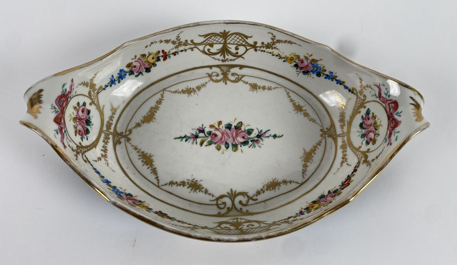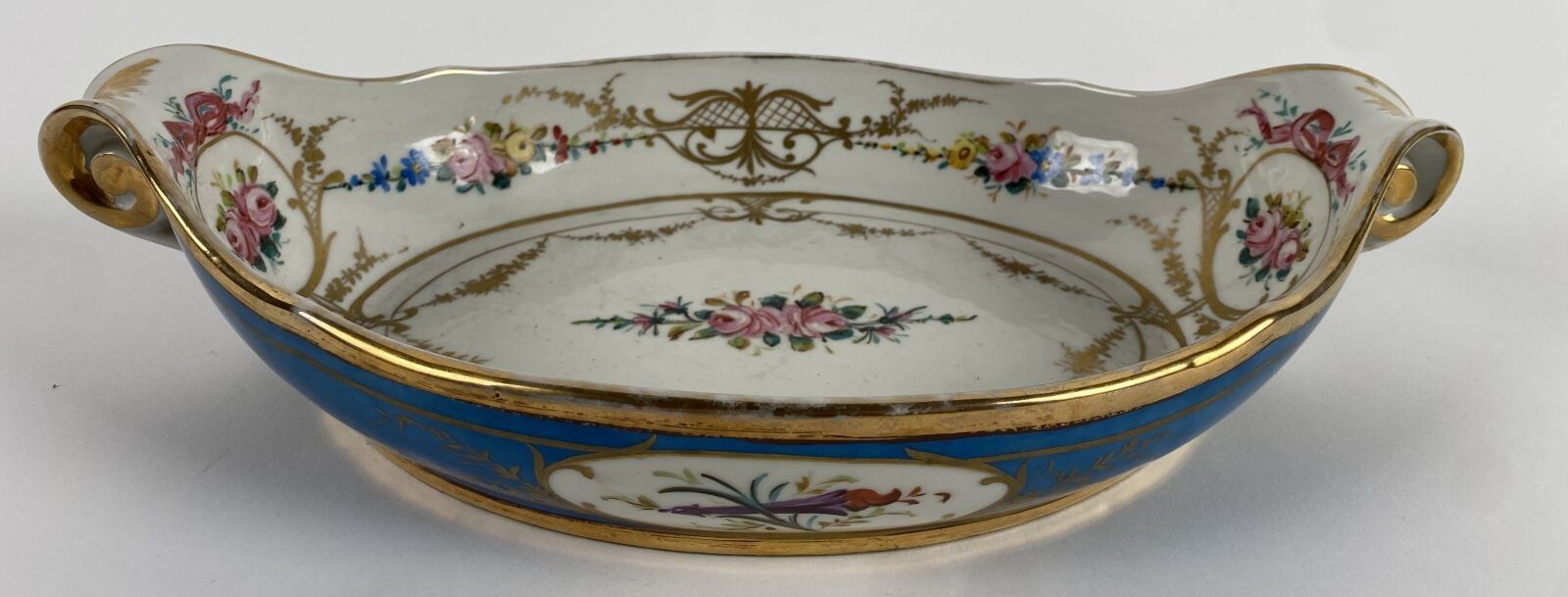 Bowl decorated with roses, truquoise blue border, gilded garland. Letter date C