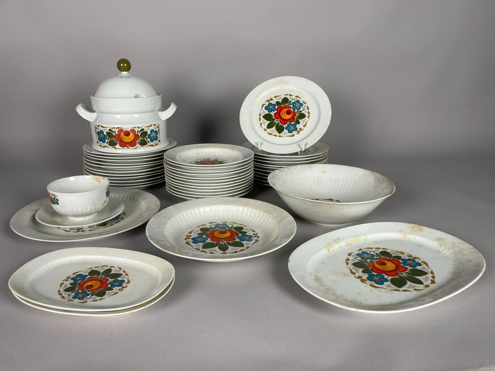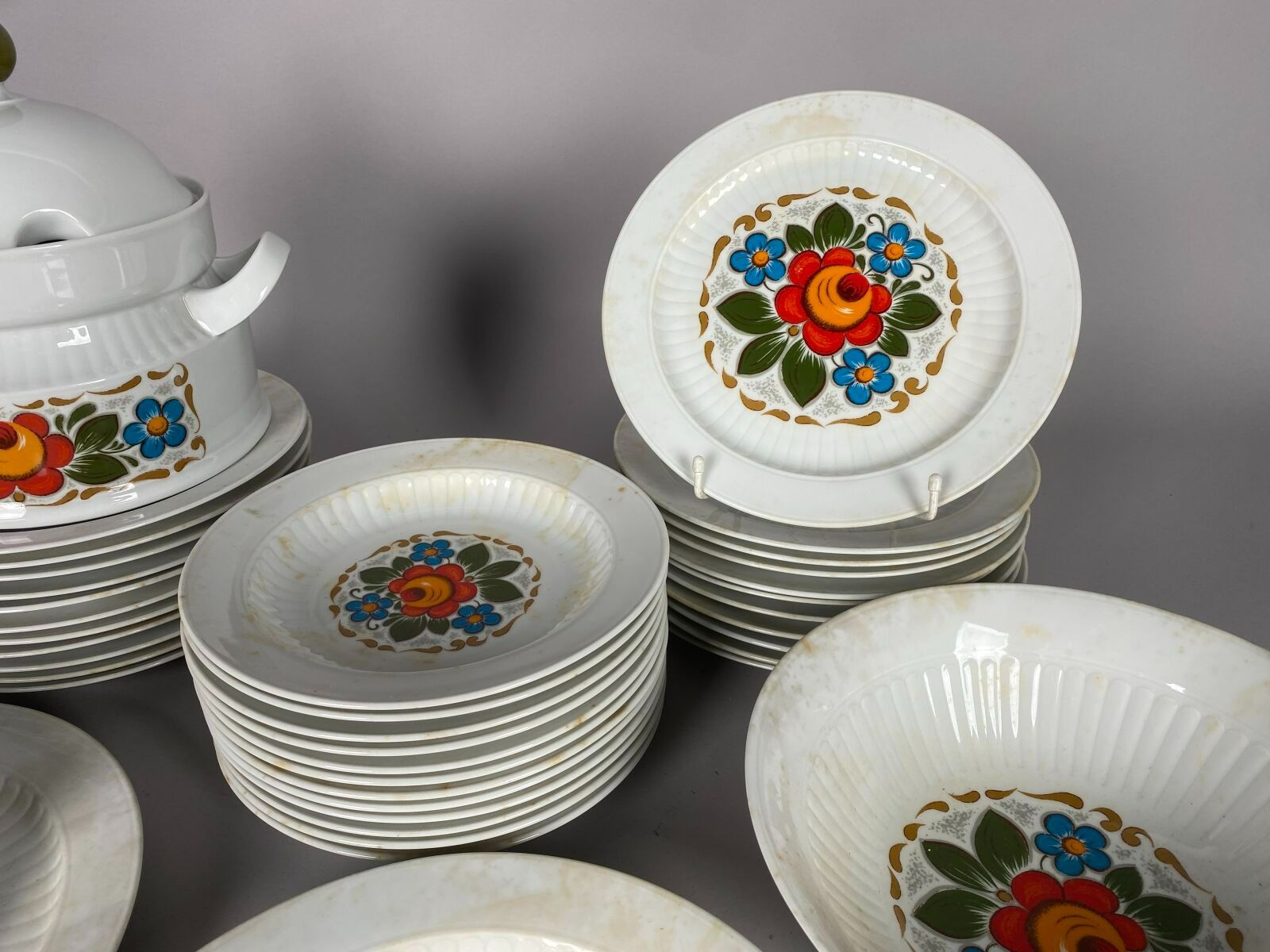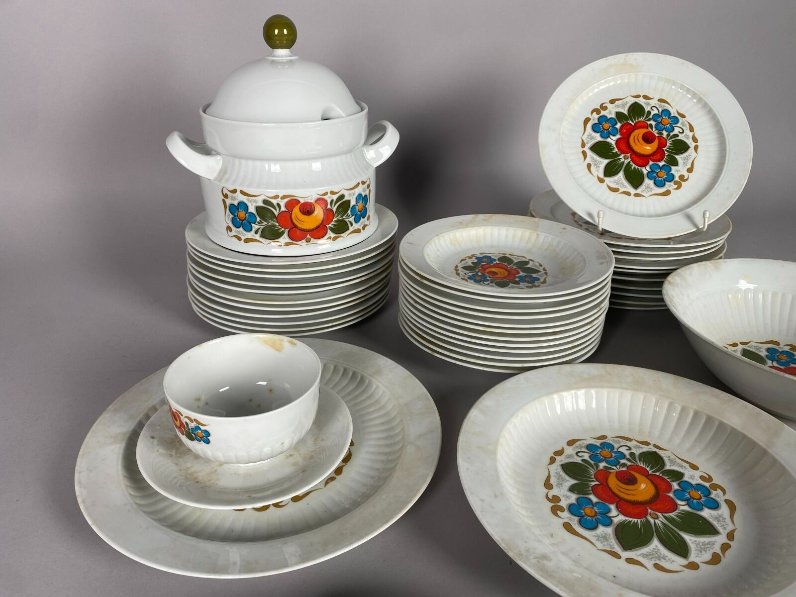 Part of a Winterling Bavaria dinner service (1950s) with floral decoration, comprising 22 dinner plates, 1 round flat dish, 1 round deep dish, 1 salad bowl, 2 ravioli dishes, 1 oval dish, 12 soup plates, 1 tureen and 1 sauceboat.