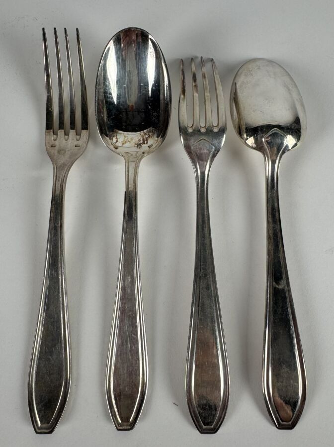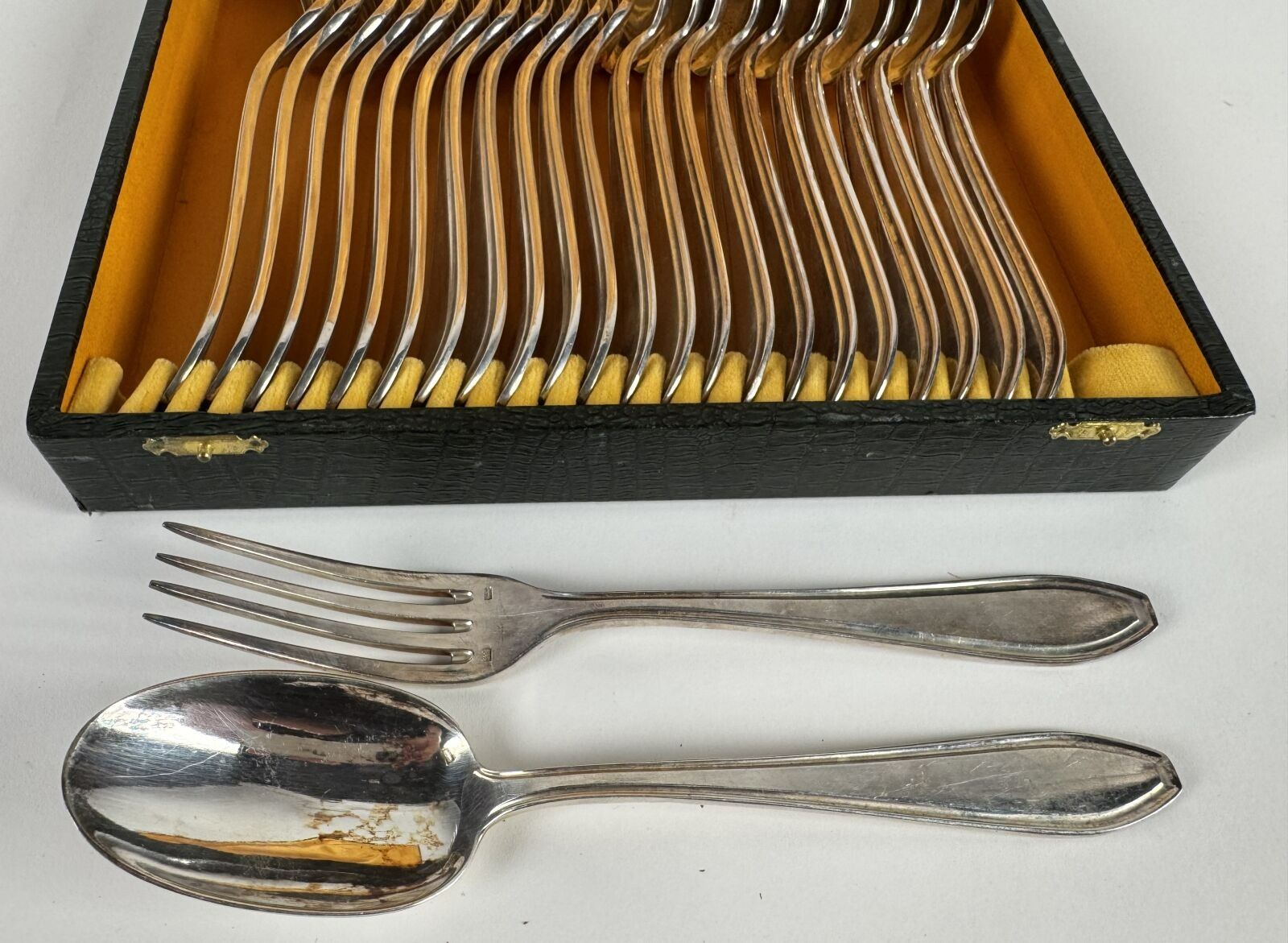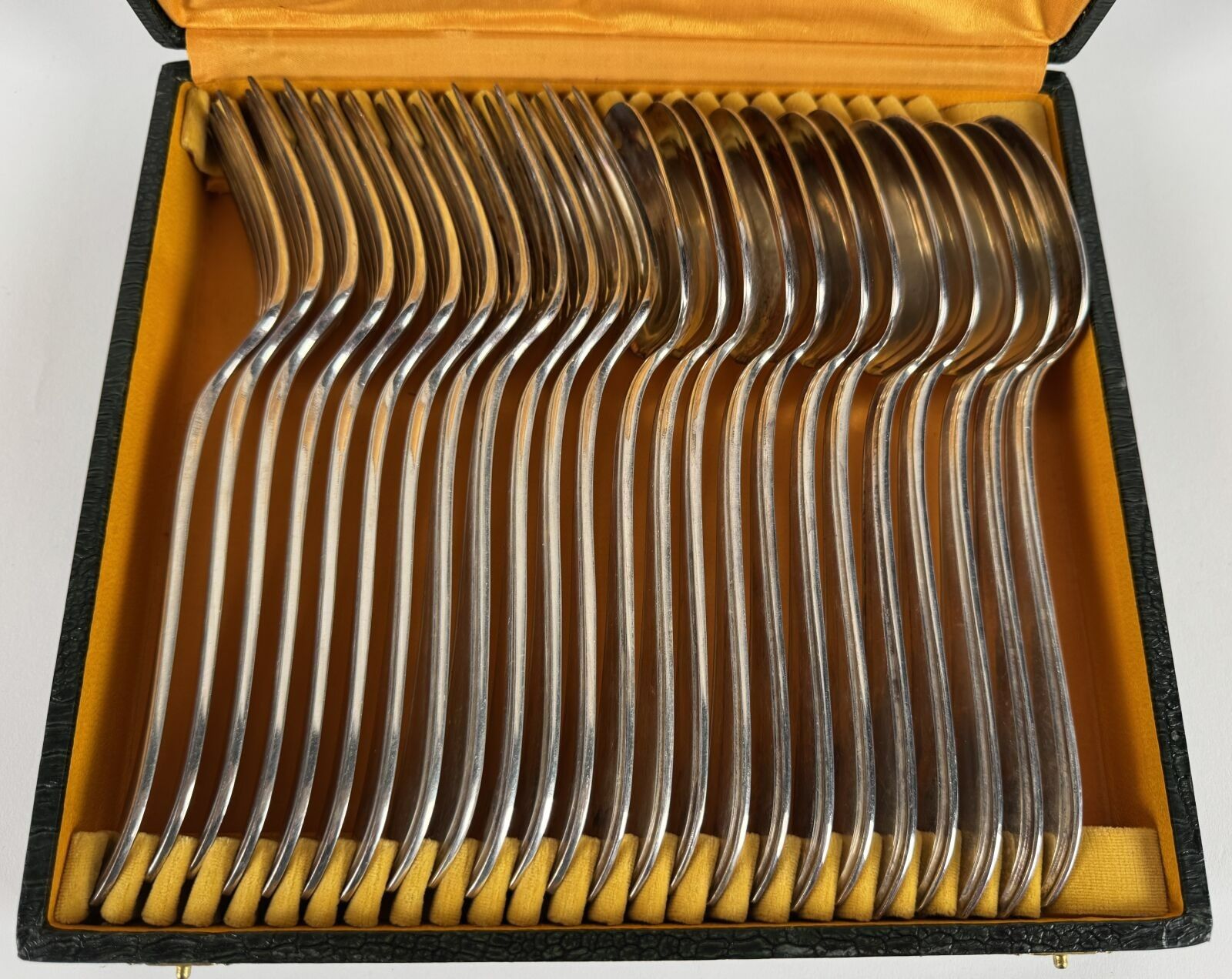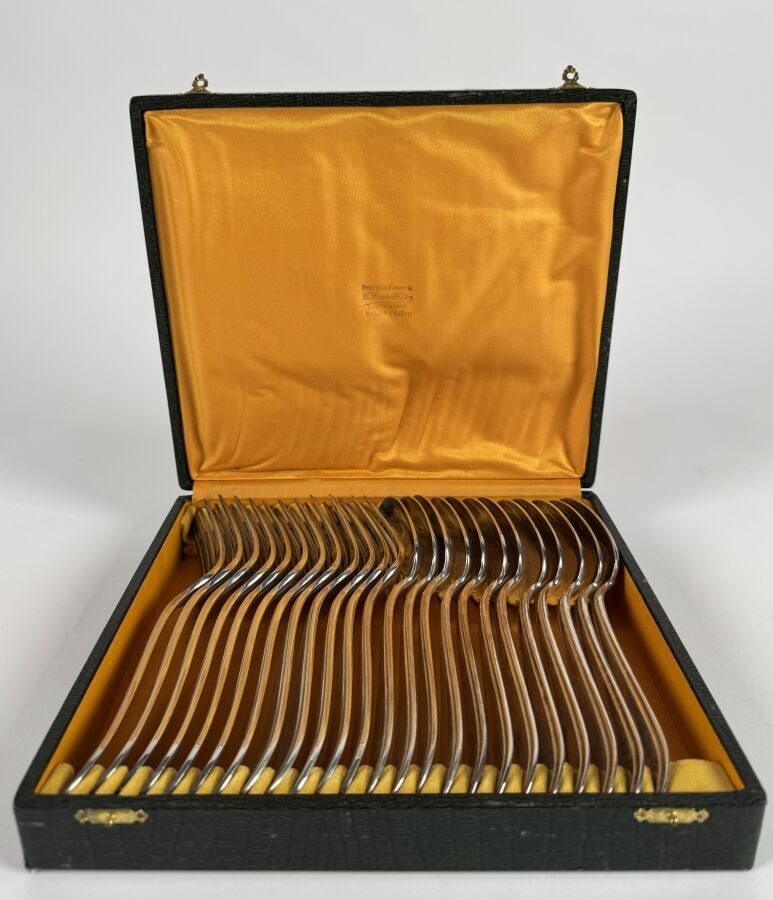 A case (Demillière, Chalon sur Saône) containing 12 large silver-plated flatware sets.