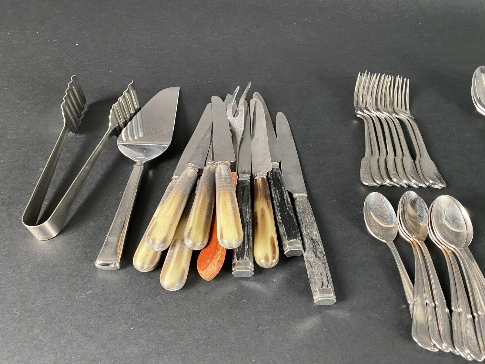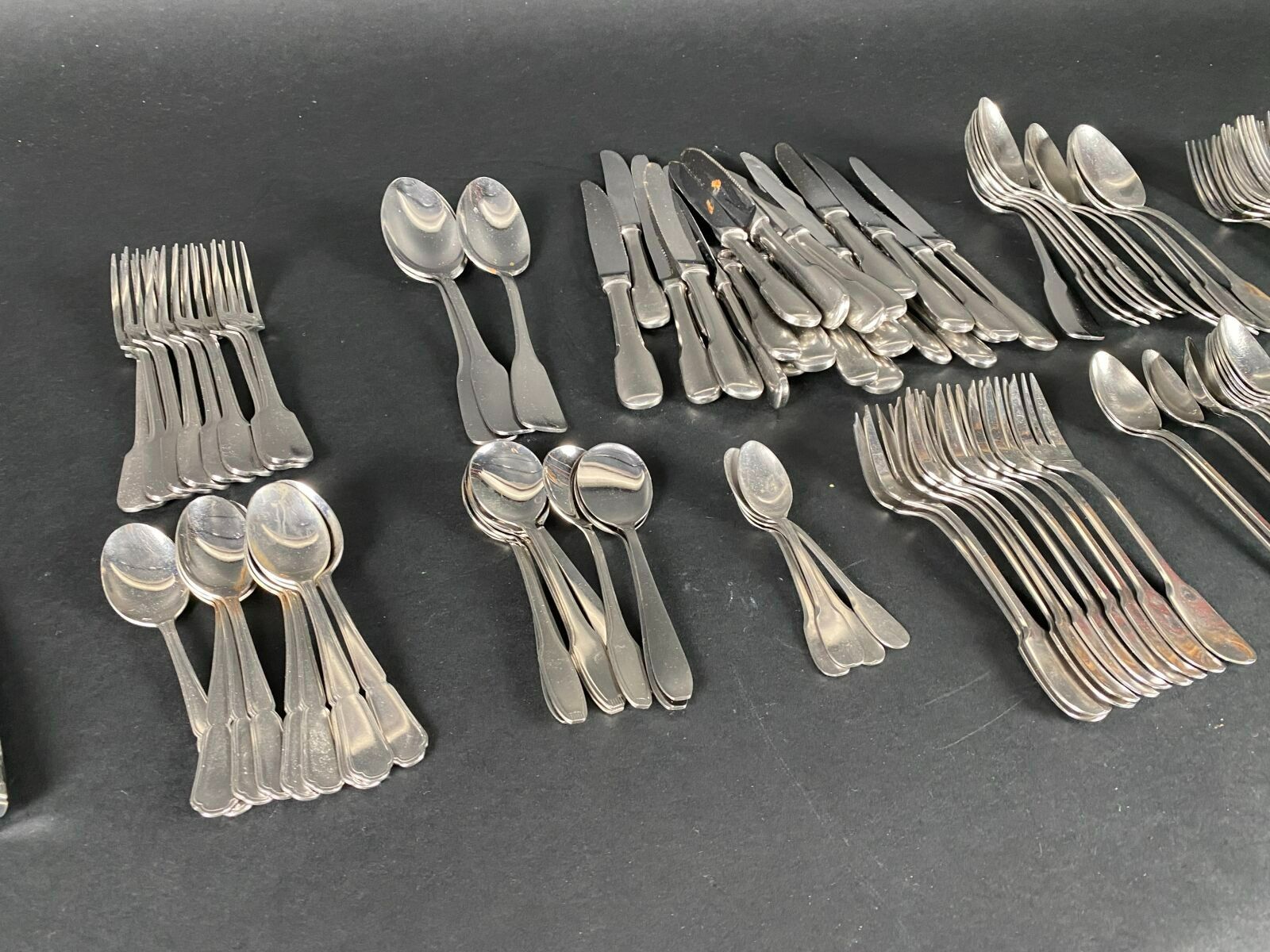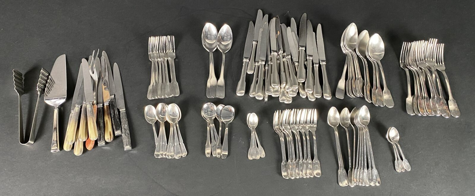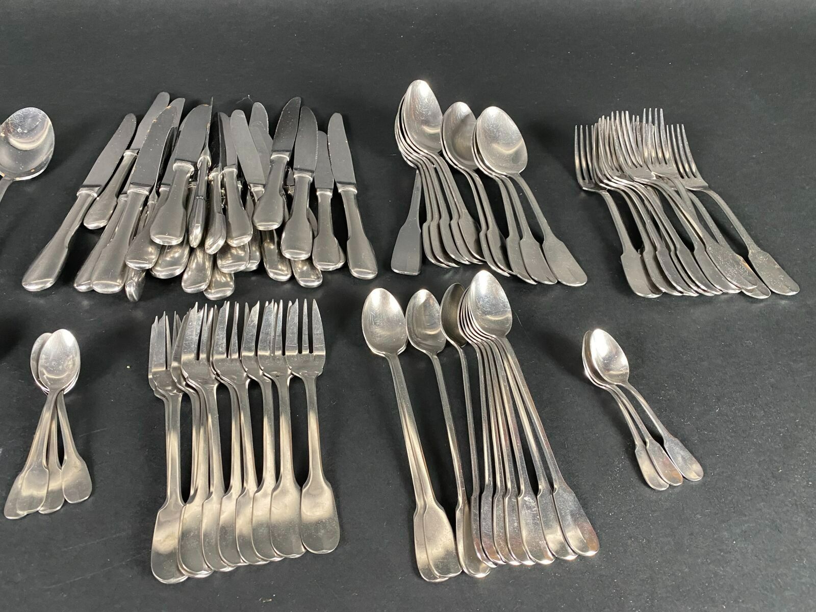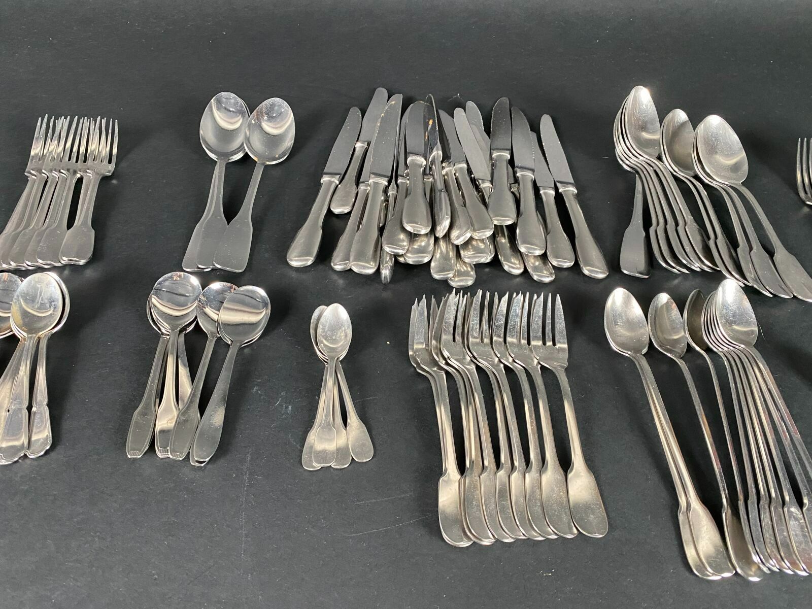 A ROYAL BB stainless steel cutlery set comprising eleven large place settings, ten ice cream spoons, three moka spoons, ten fish ladles, twenty-two JEAN COUZON (and some GUY DEGRENNE) knives, four JEAN COUZON moka spoons, three GUY DEGRENNE large spoons, eight dessert spoons, eight CHRISTOFLE forks, nine silvered metal spoons