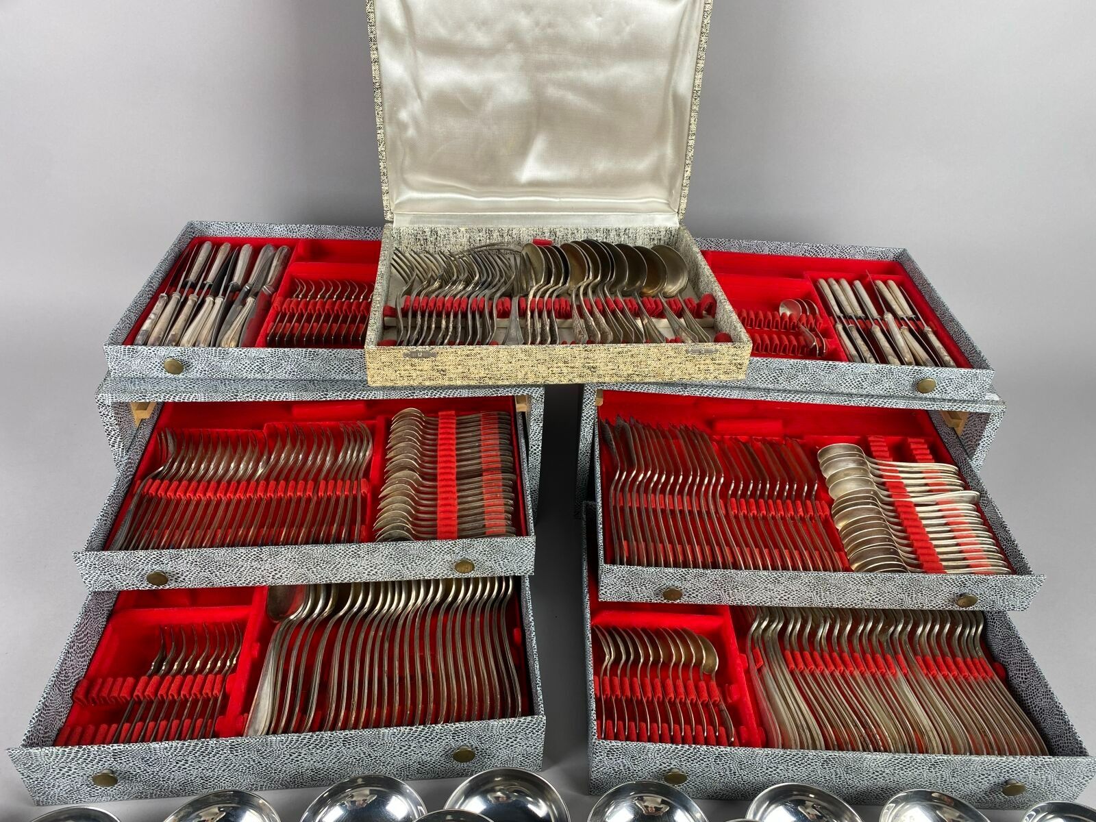 LOT OF SILVER METAL: a case containing large cutlery and a meat fork (two different models); two incomplete cases containing large cutlery, fish and meat cutlery, etc... filet contour model.