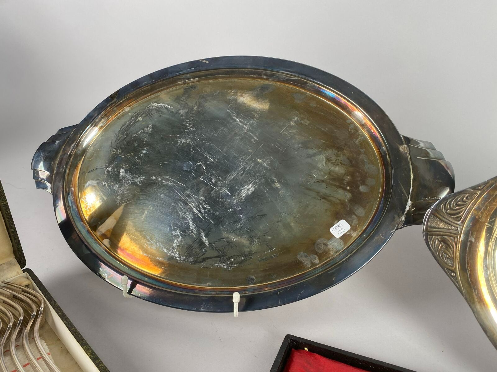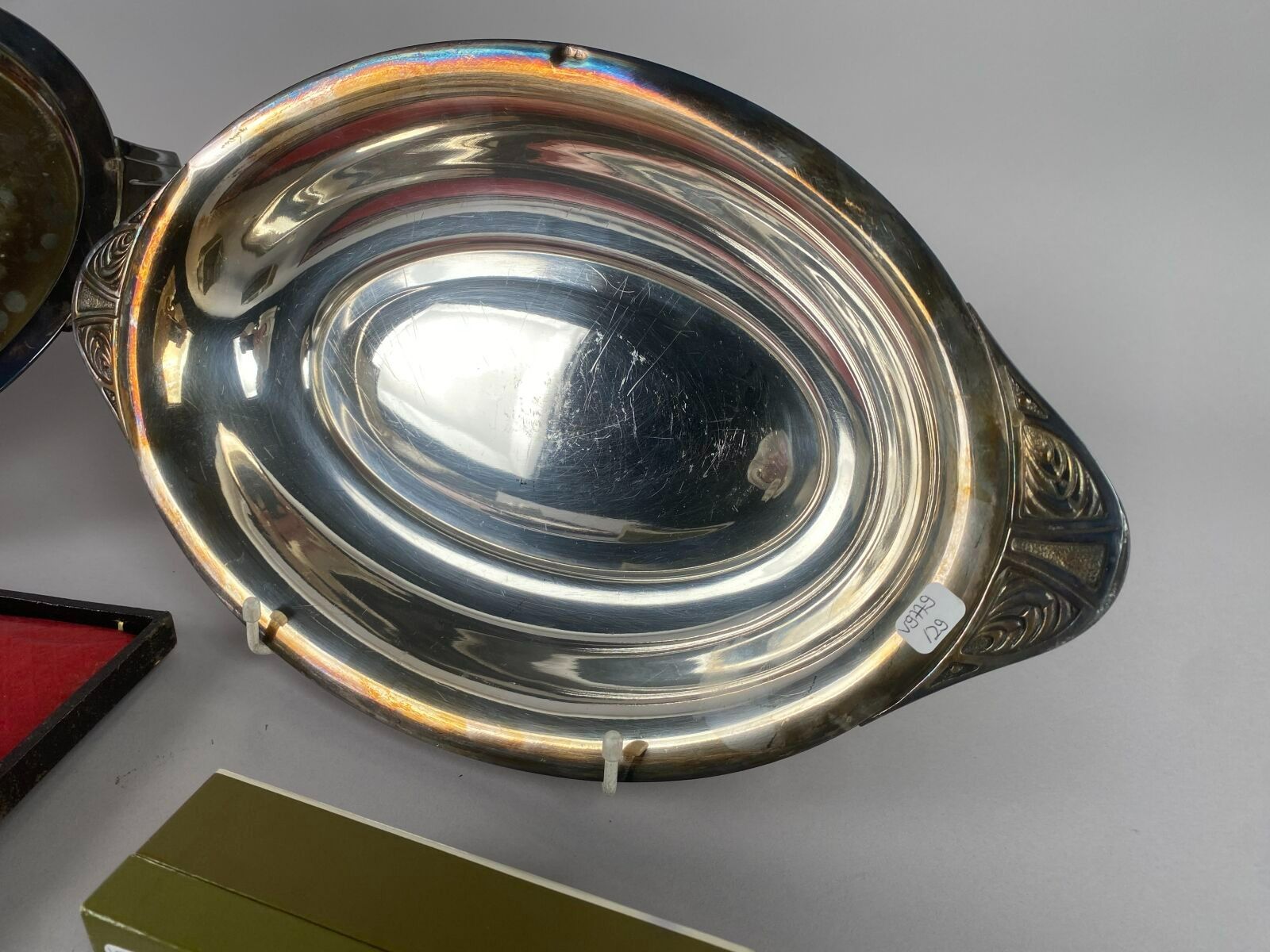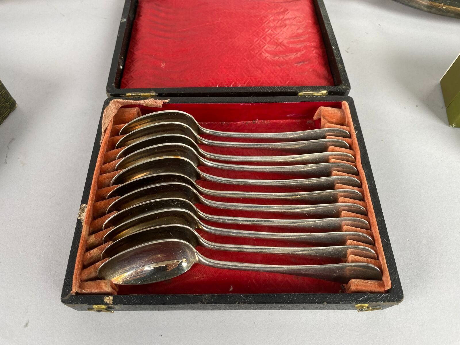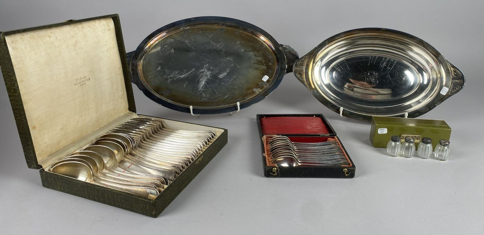 Two silver plated dishes, 4 Christofle saltcellars, 11 silver plated spoons in a case, 12 large silver plated flatware set with filets.