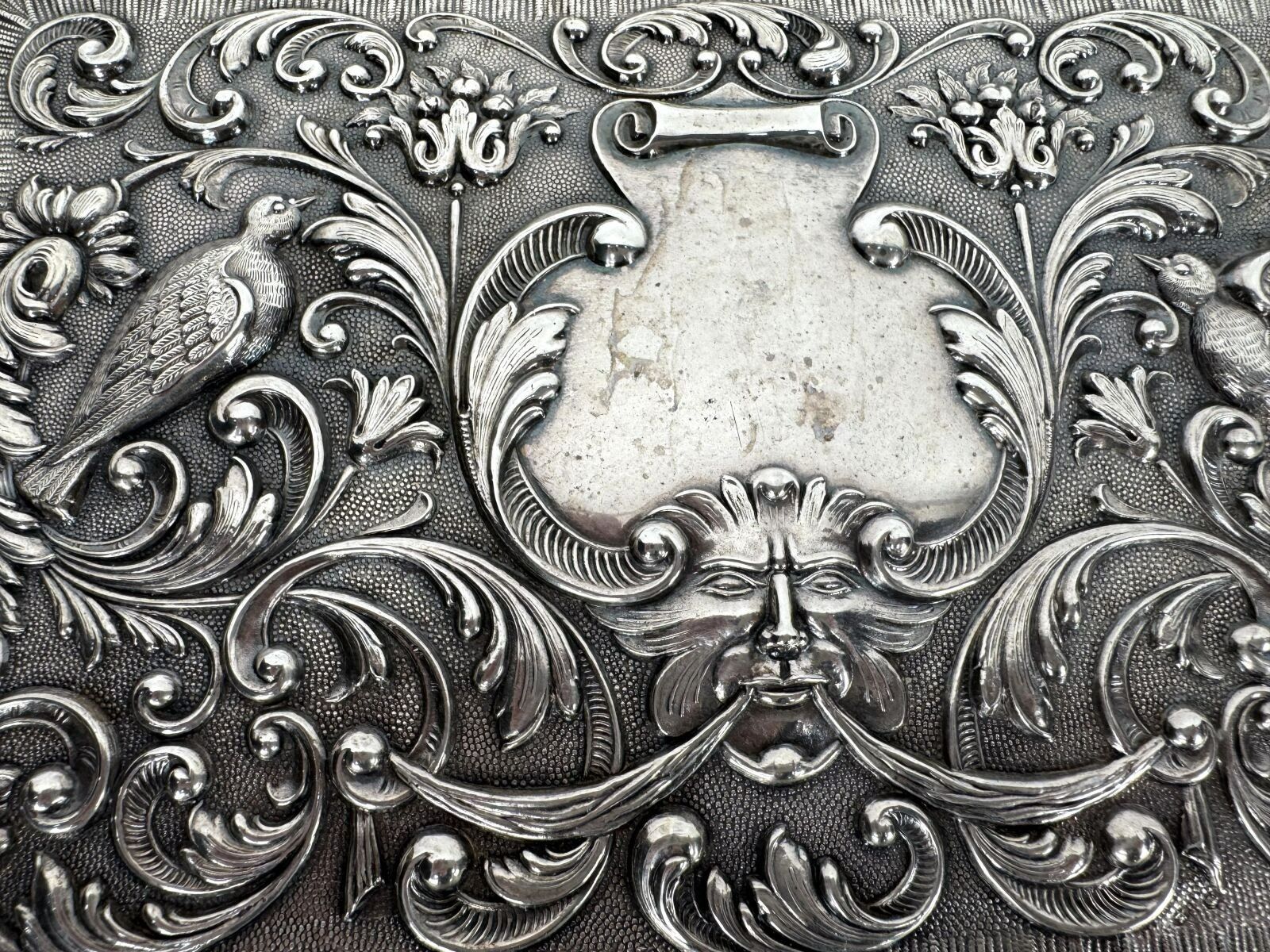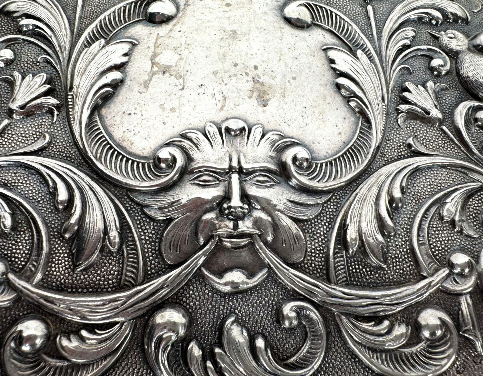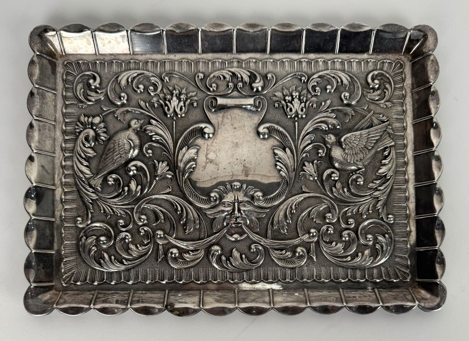 Solid repoussé silver tray showing birds in flight on either side of a cartouche supported by a mascaron, 30cm x 21.5cm