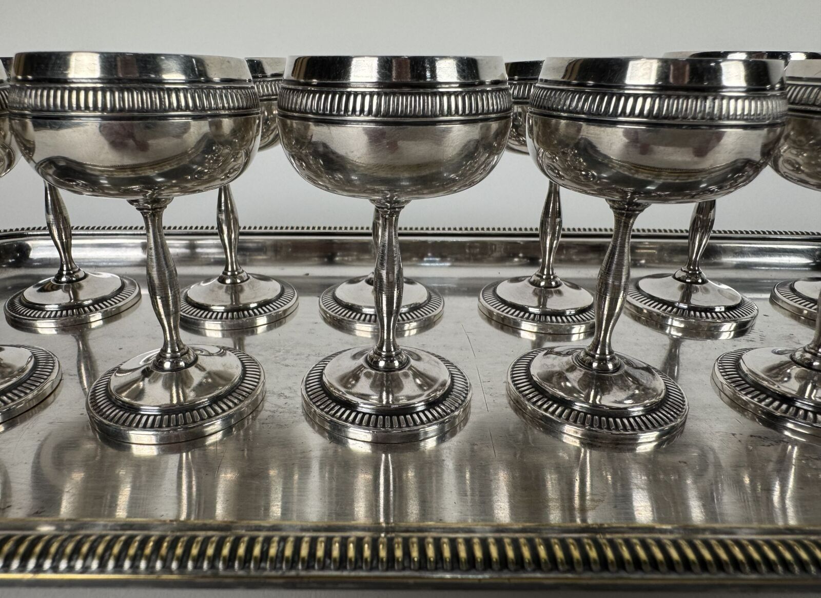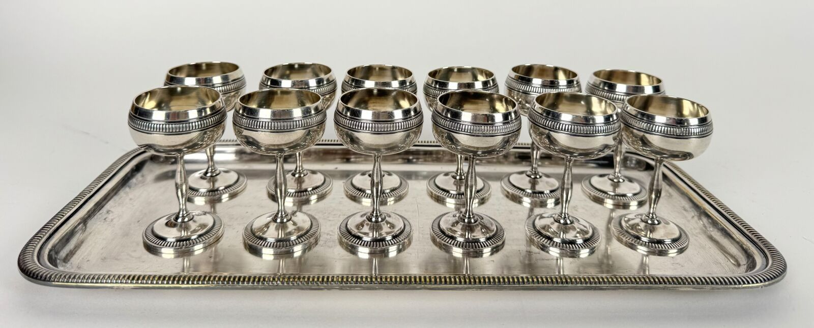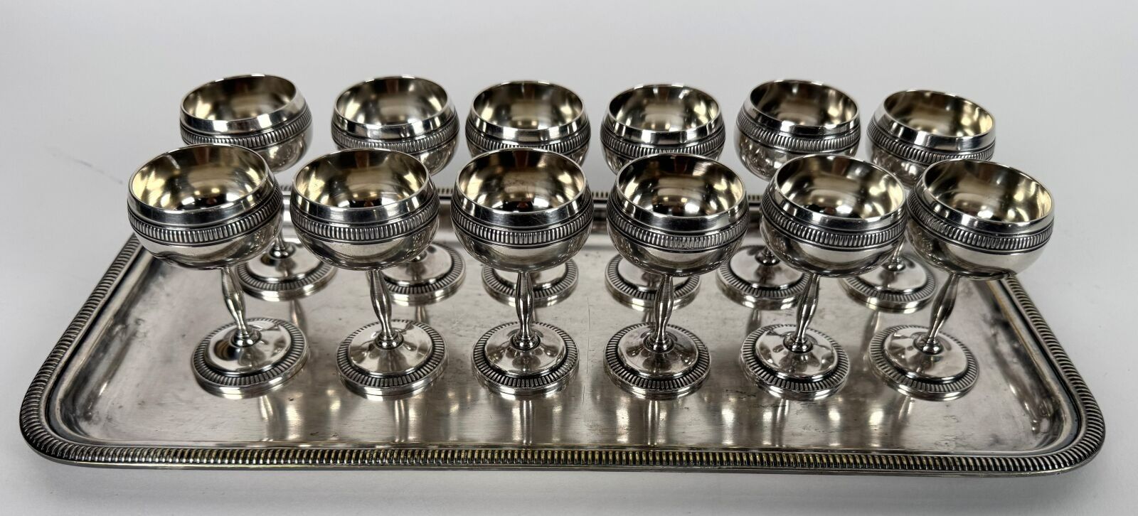 Silver-plated metal tray with twelve liqueur glasses that ca…