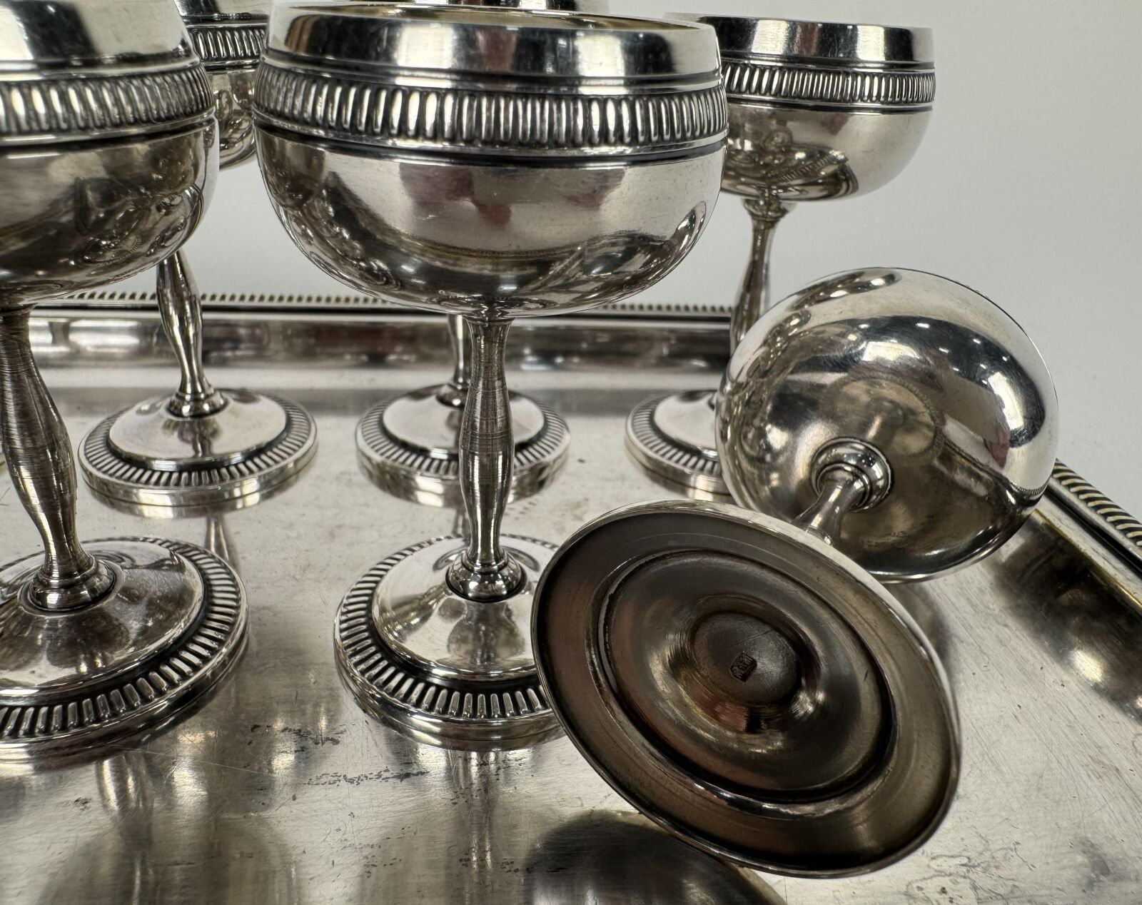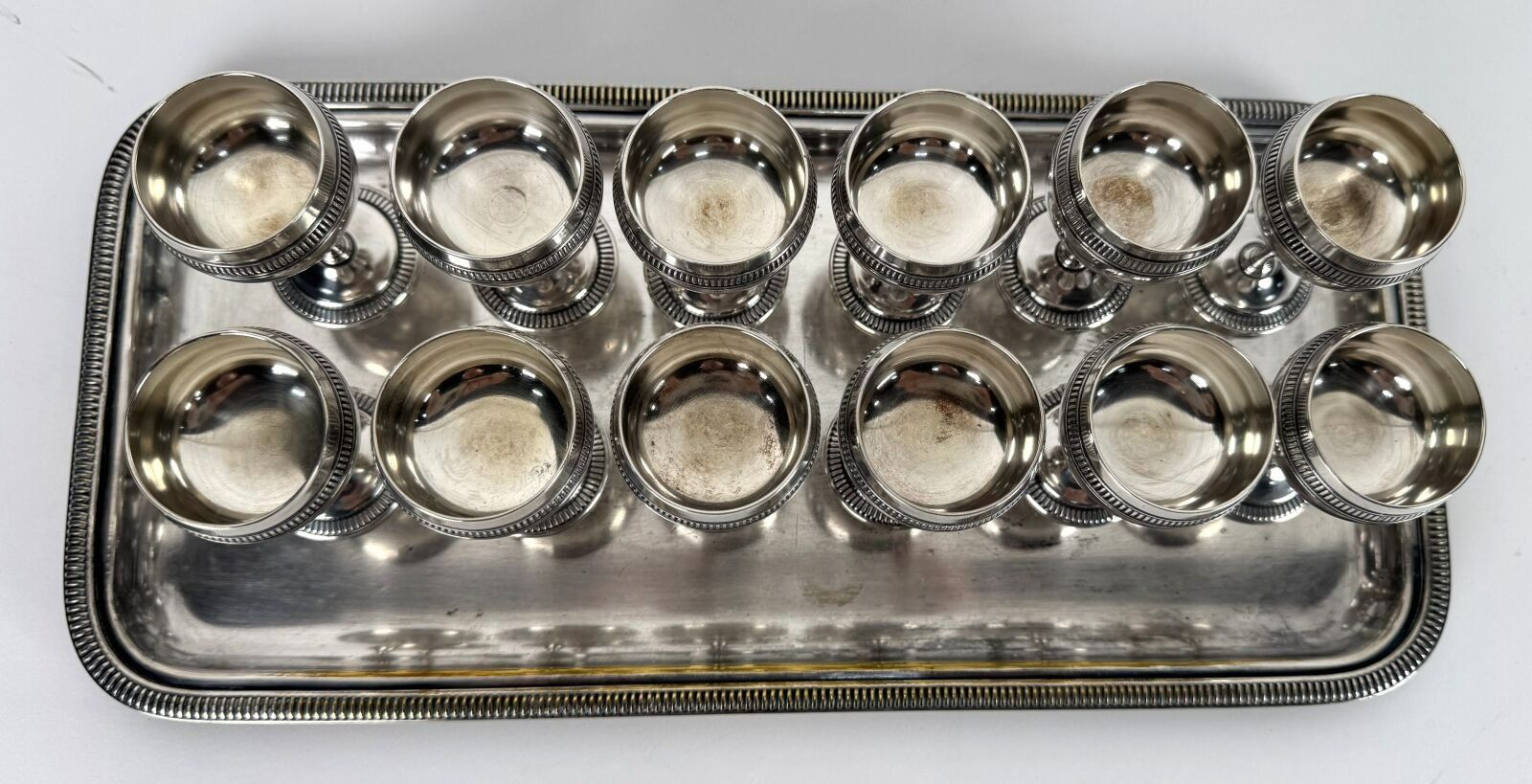 Silver-plated metal tray with twelve liqueur glasses that can be used as egg cups or floral table decorations.