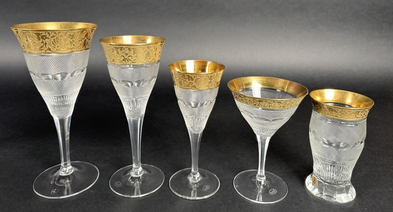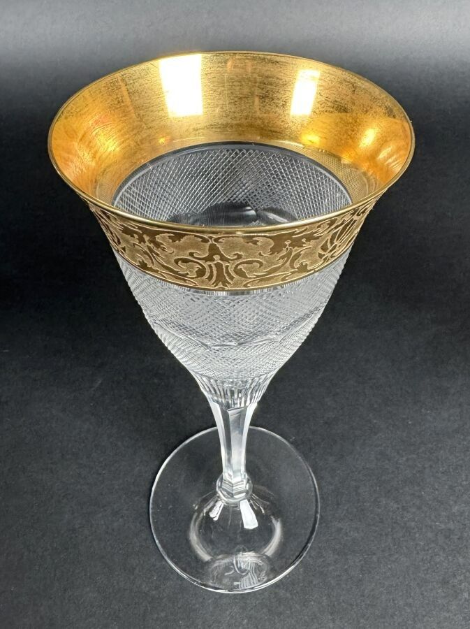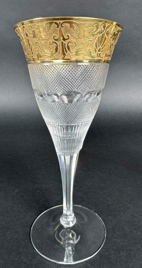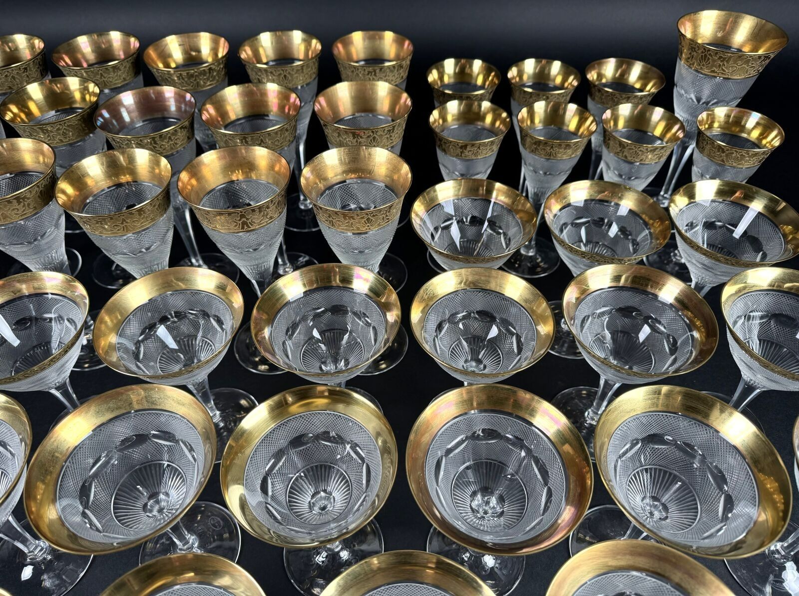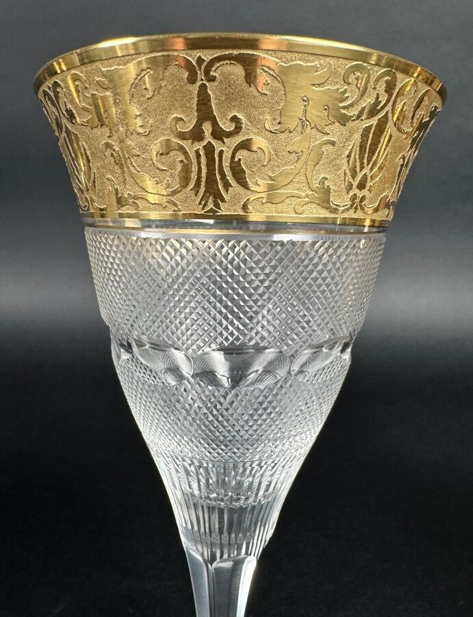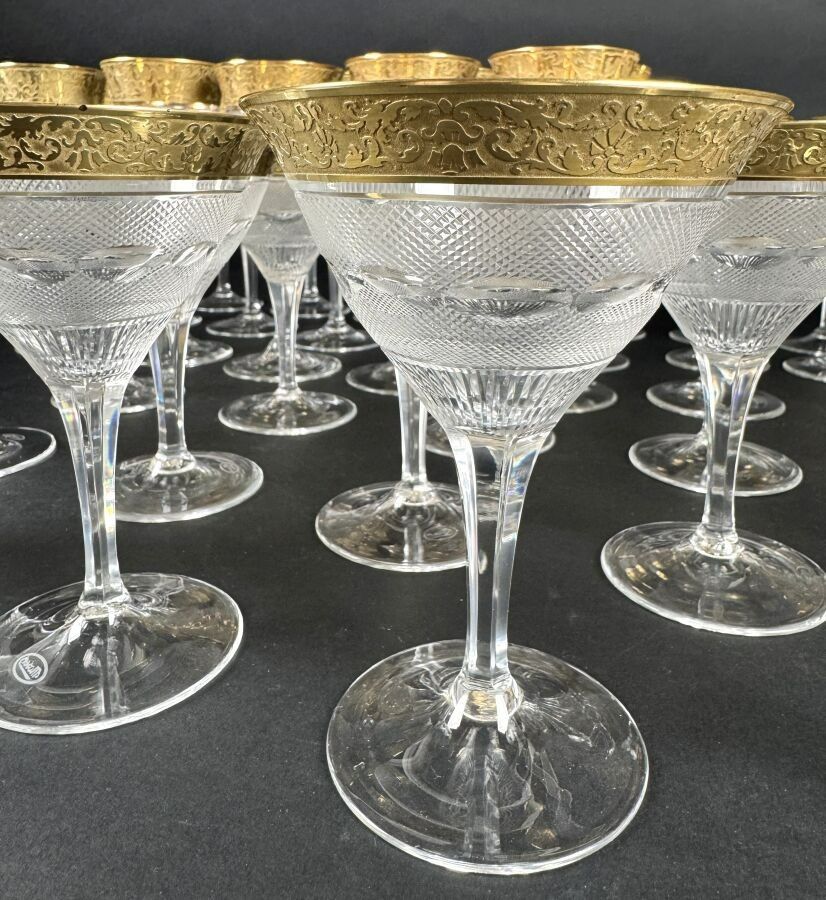 Suite of 42 stemmed glasses in diamond-point cut crystal, necks engraved with interlacing foliage and gilding.