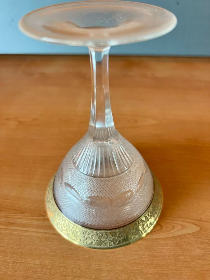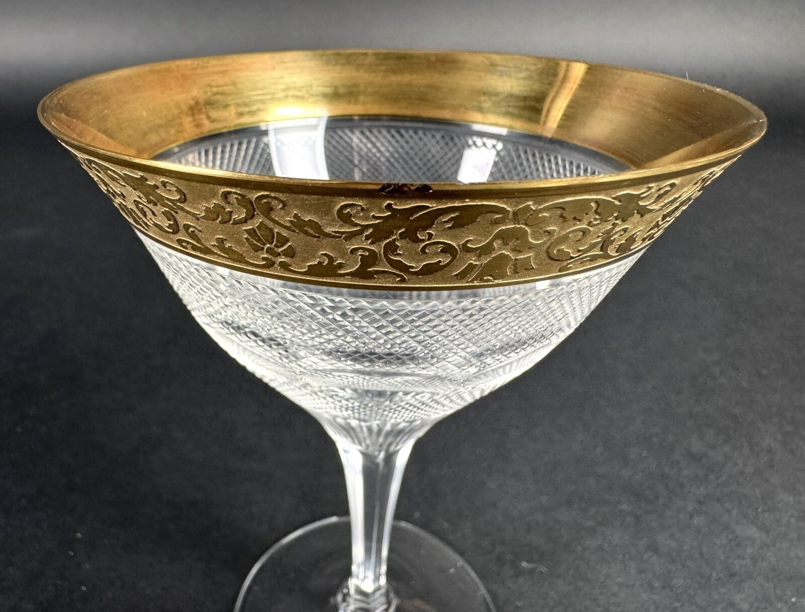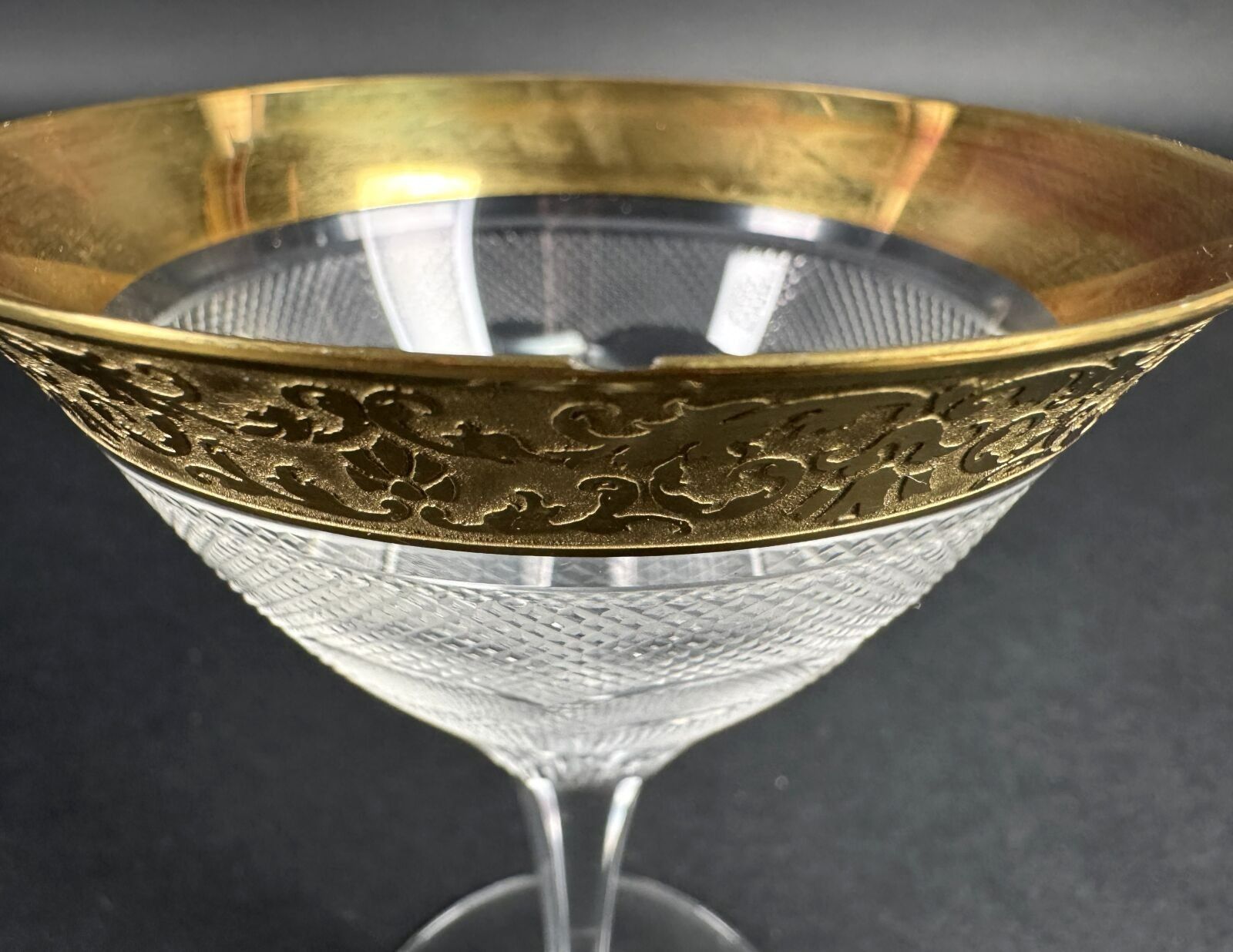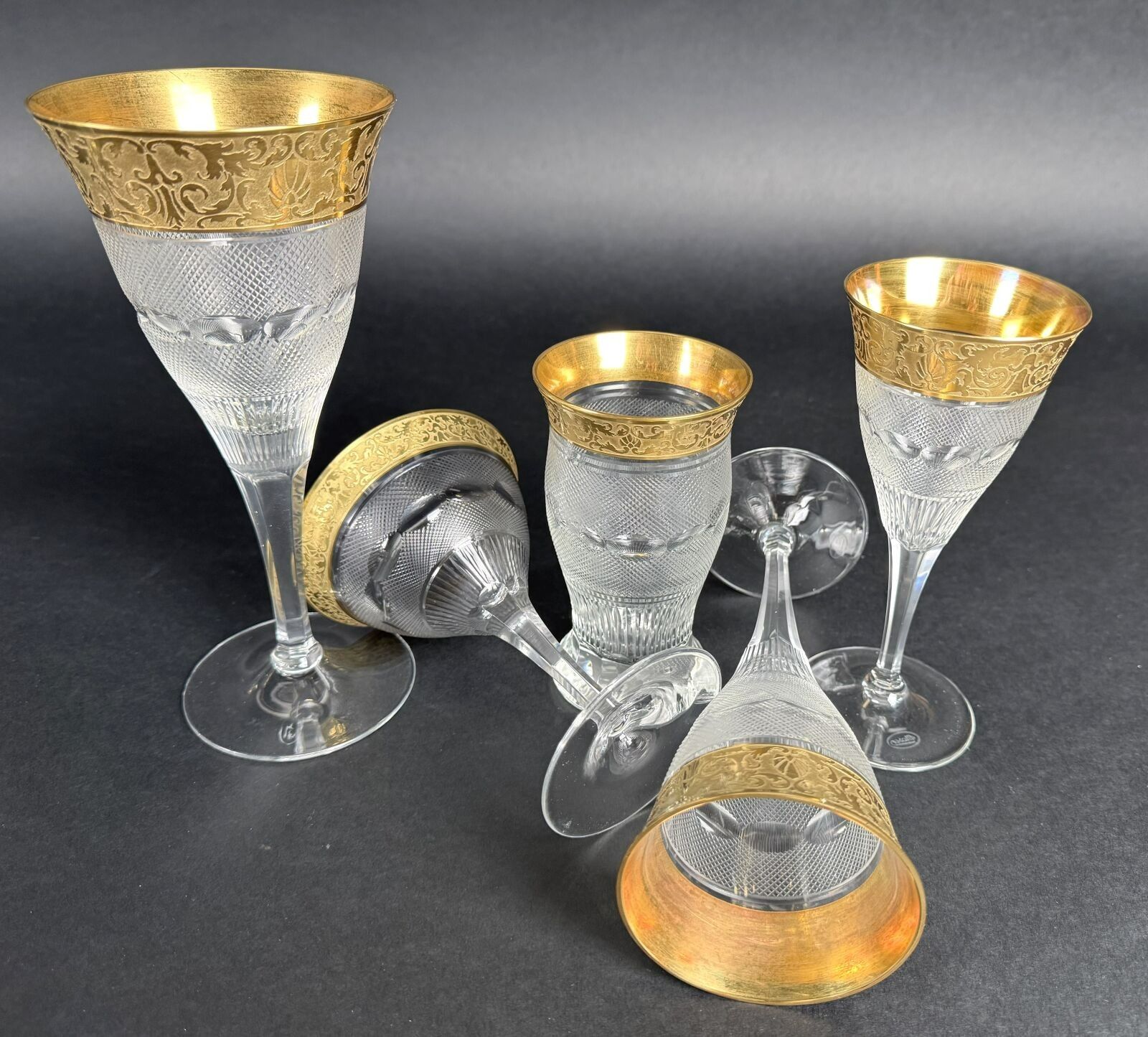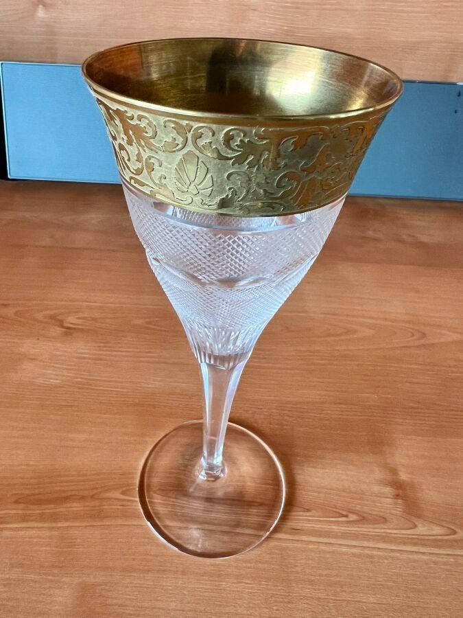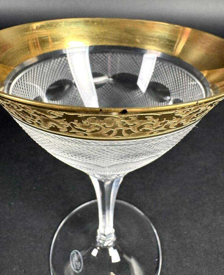 Suite of 42 stemmed glasses in diamond-point cut crystal, necks engraved with interlacing foliage and gilding.