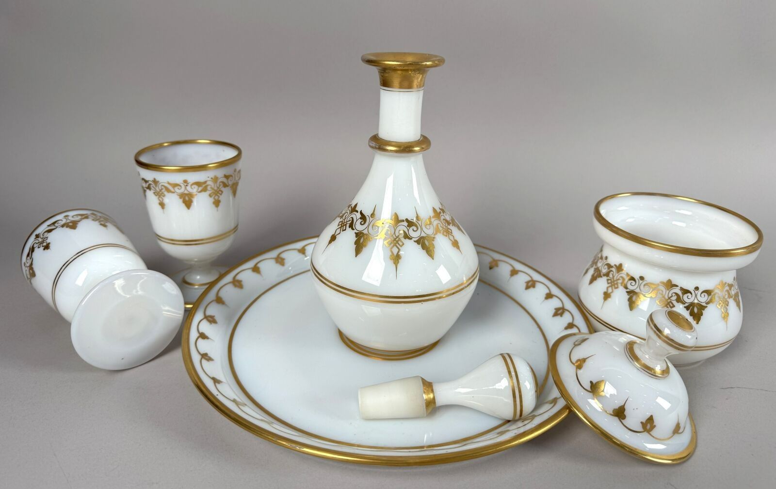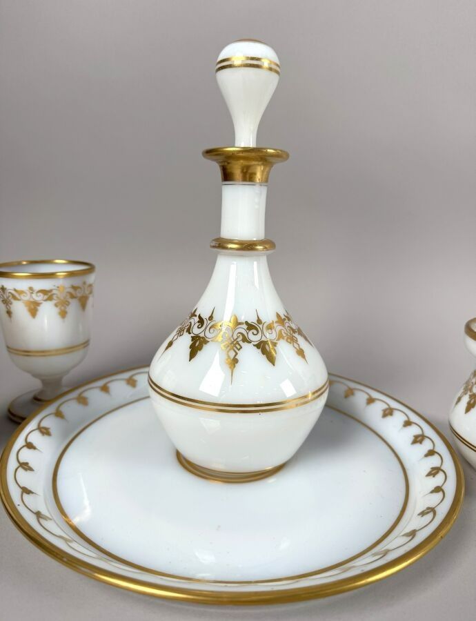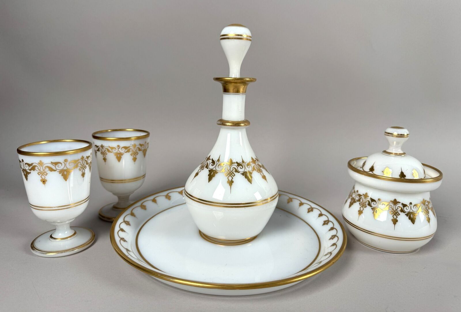 A white opaline set decorated with gold garlands comprising a bottle, a bonbonnière, two glasses and the tray