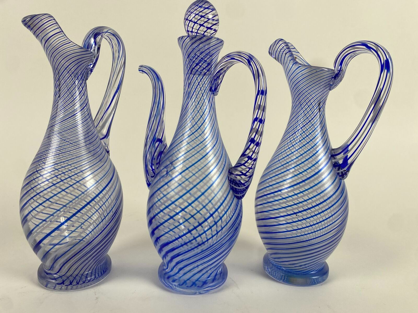 MURANO. 3 glass carafes with blue and white twisted lines (small accident to one of the carafes)