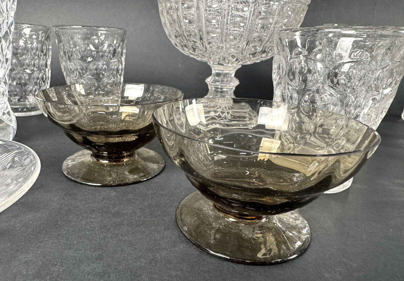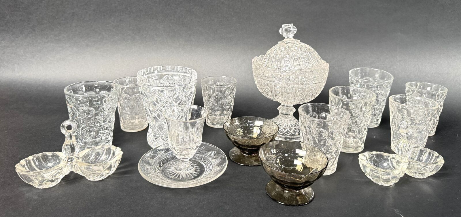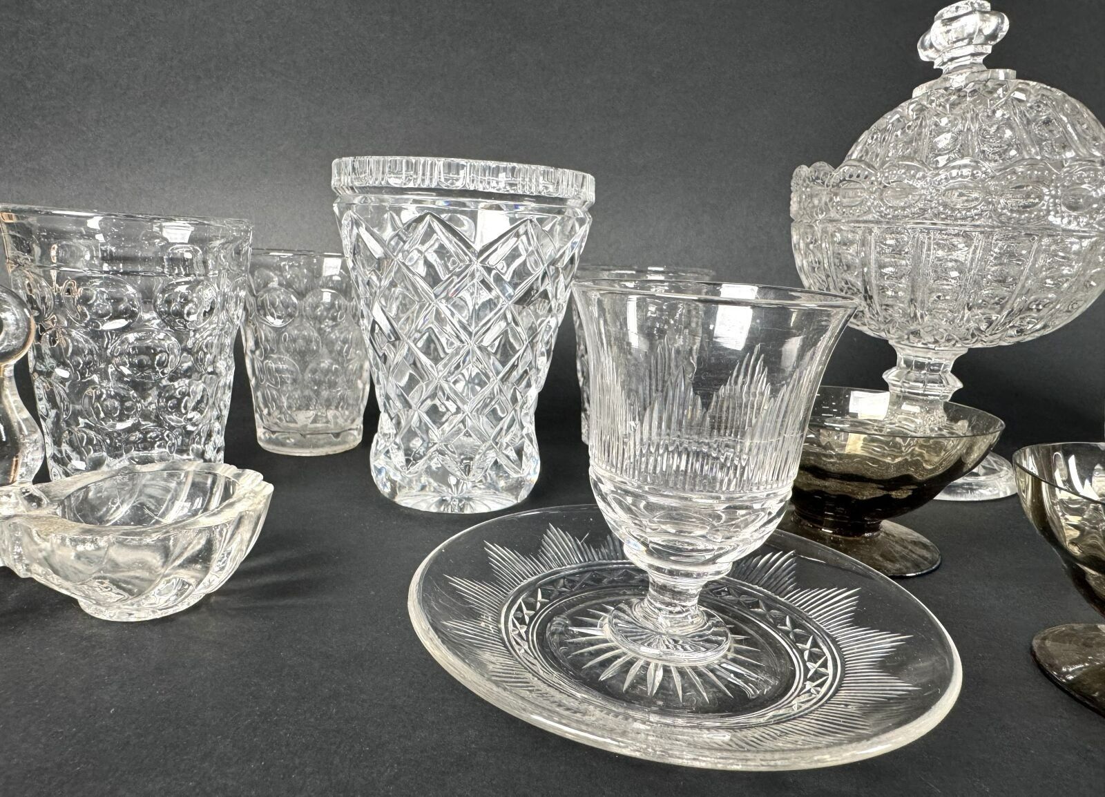 A lot composed of a crystal absinthe glass with radiant decoration, two DAUM smoked glass dishes, a moulded crystal ice bucket, 9 crystal glasses with pastille decoration of different sizes (small chips), 2 moulded glass salad bowls (small chips), a glass drageur (small chip).