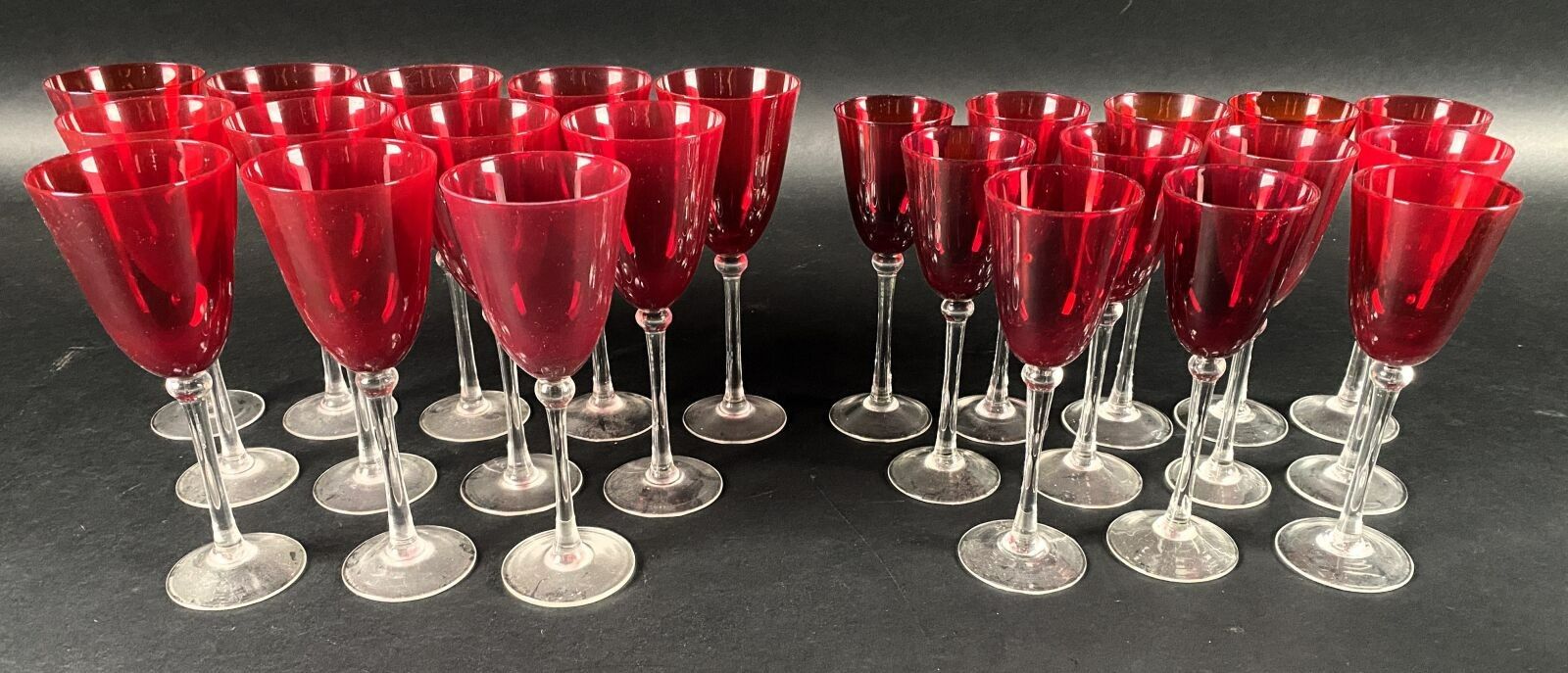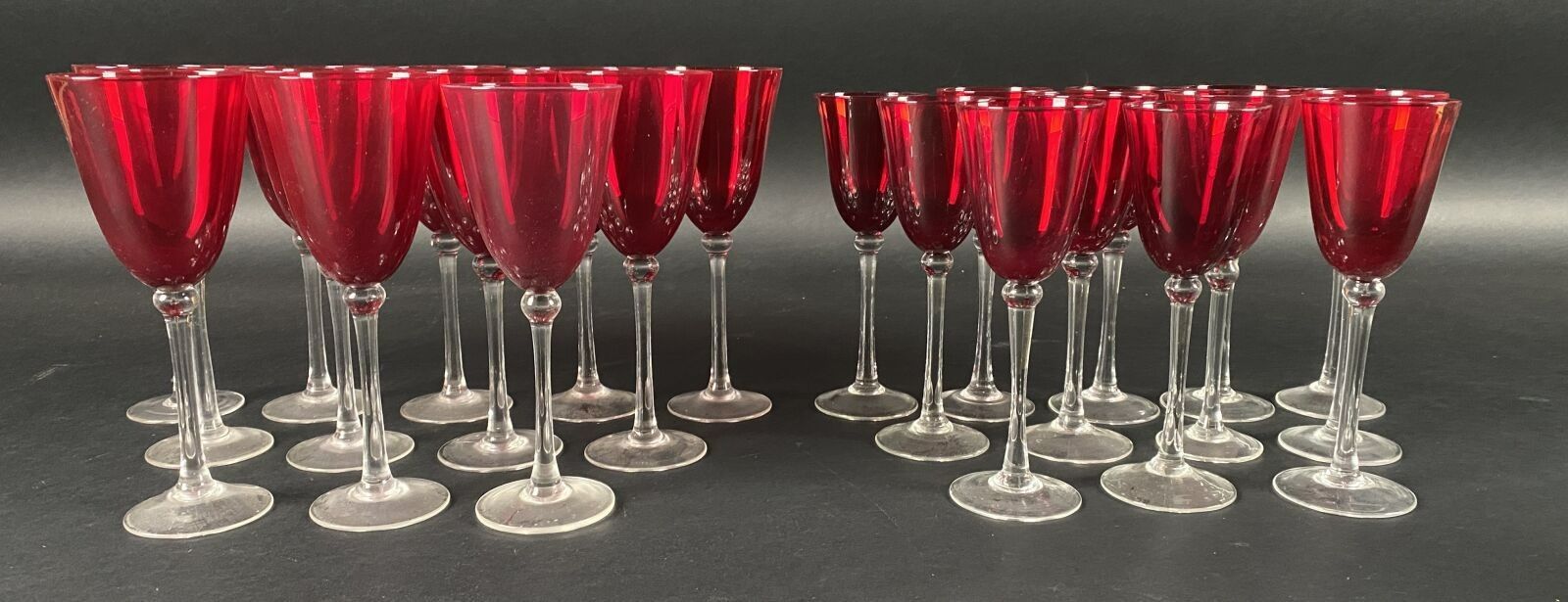 A set of twelve red-tinted crystal water glasses and twelve red-tinted crystal wine glasses