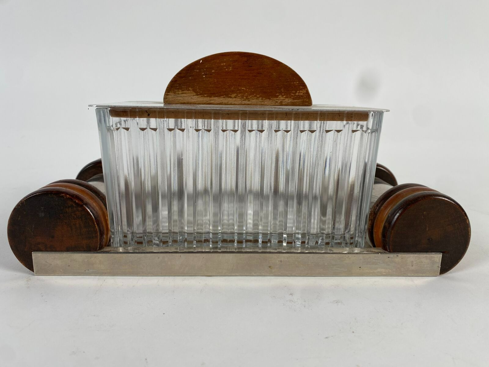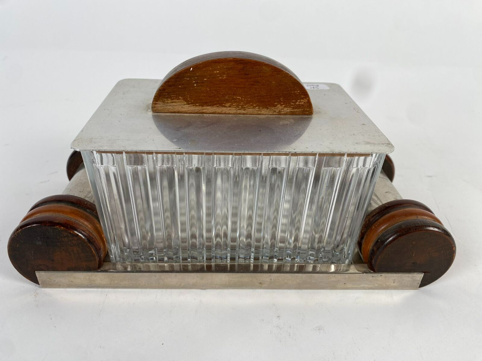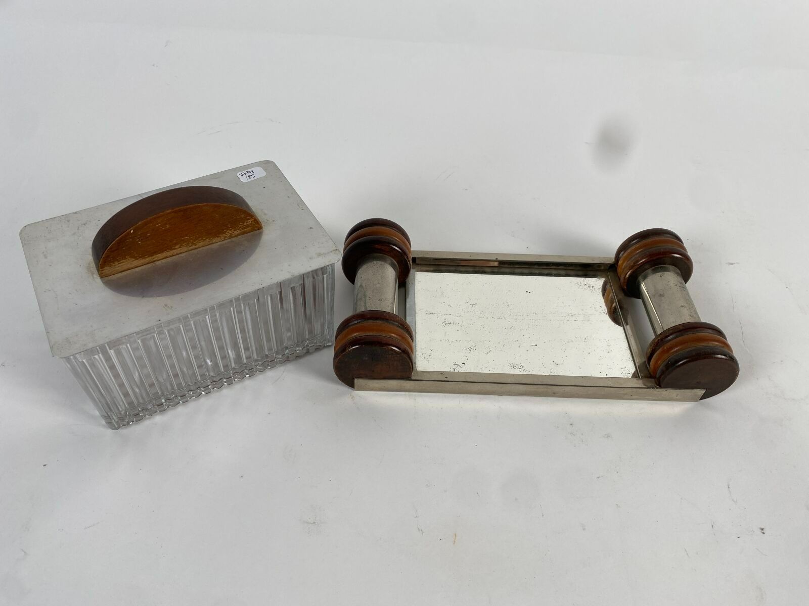 Art Deco glass, wood and aluminium biscuit tin with mirrored tray.