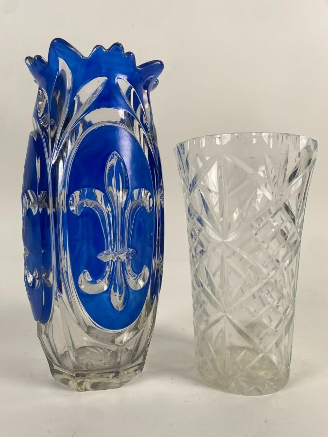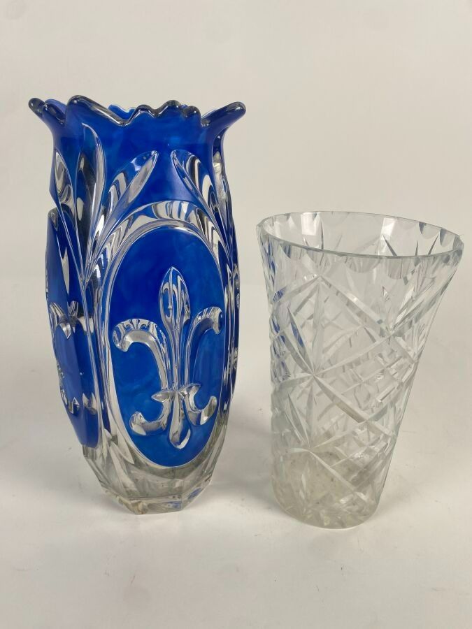 Two cut crystal vases, one blue-tinted with fleur-de-lys dec…