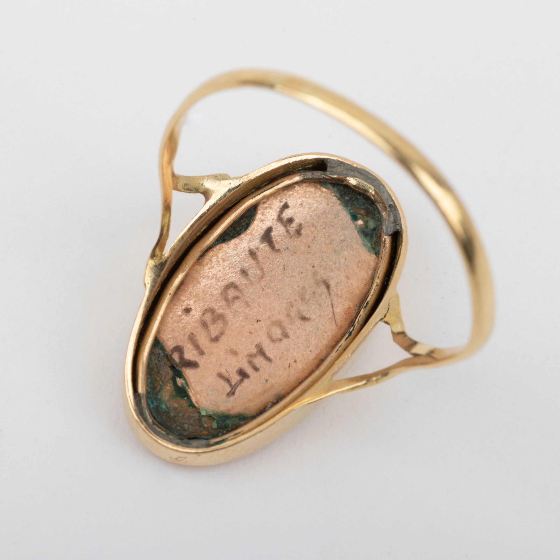Shuttle ring, decorated with a young woman, polychrome enamel, set in 18K gold
