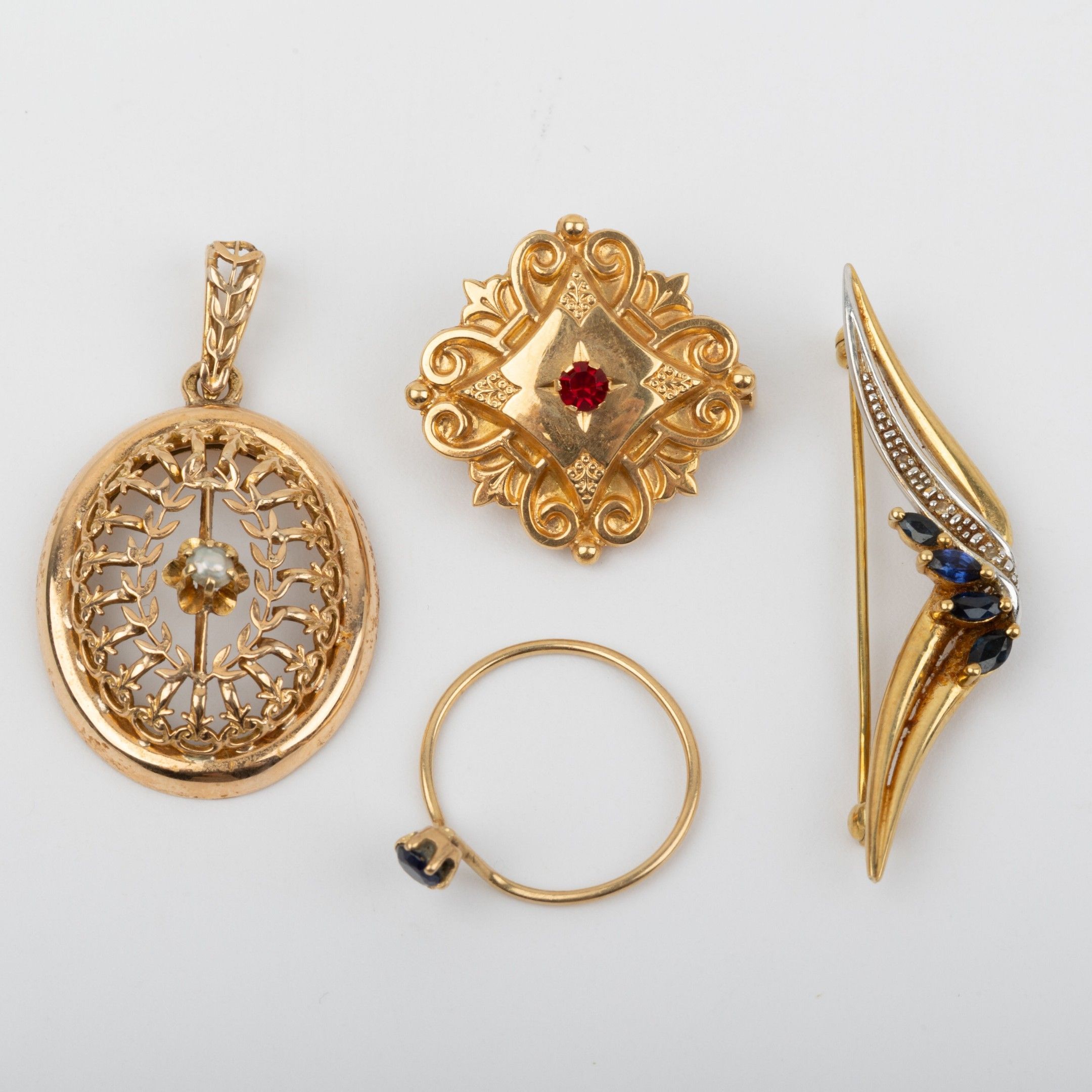 Set of 18K gold and coloured stone jewellery - pendant, broo…