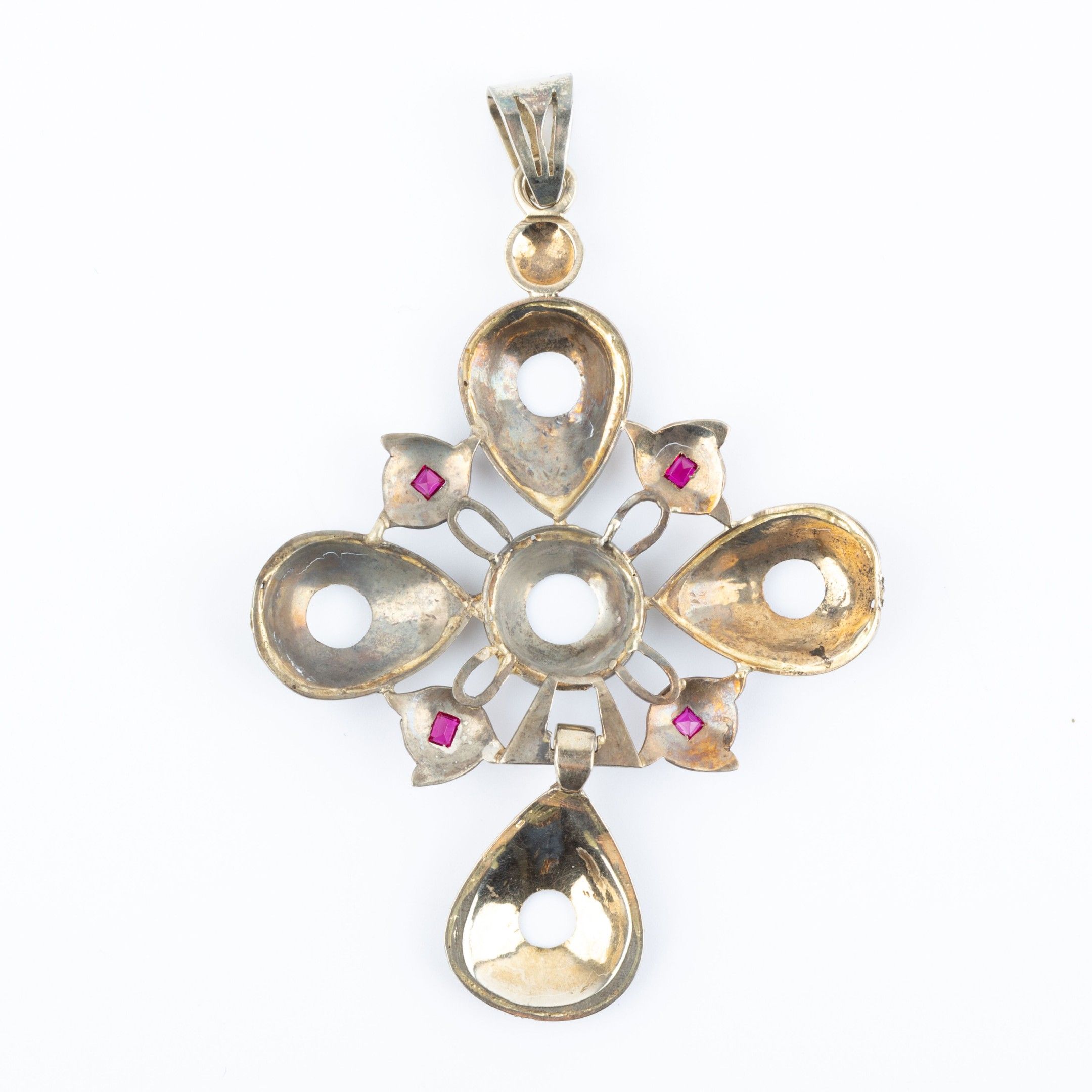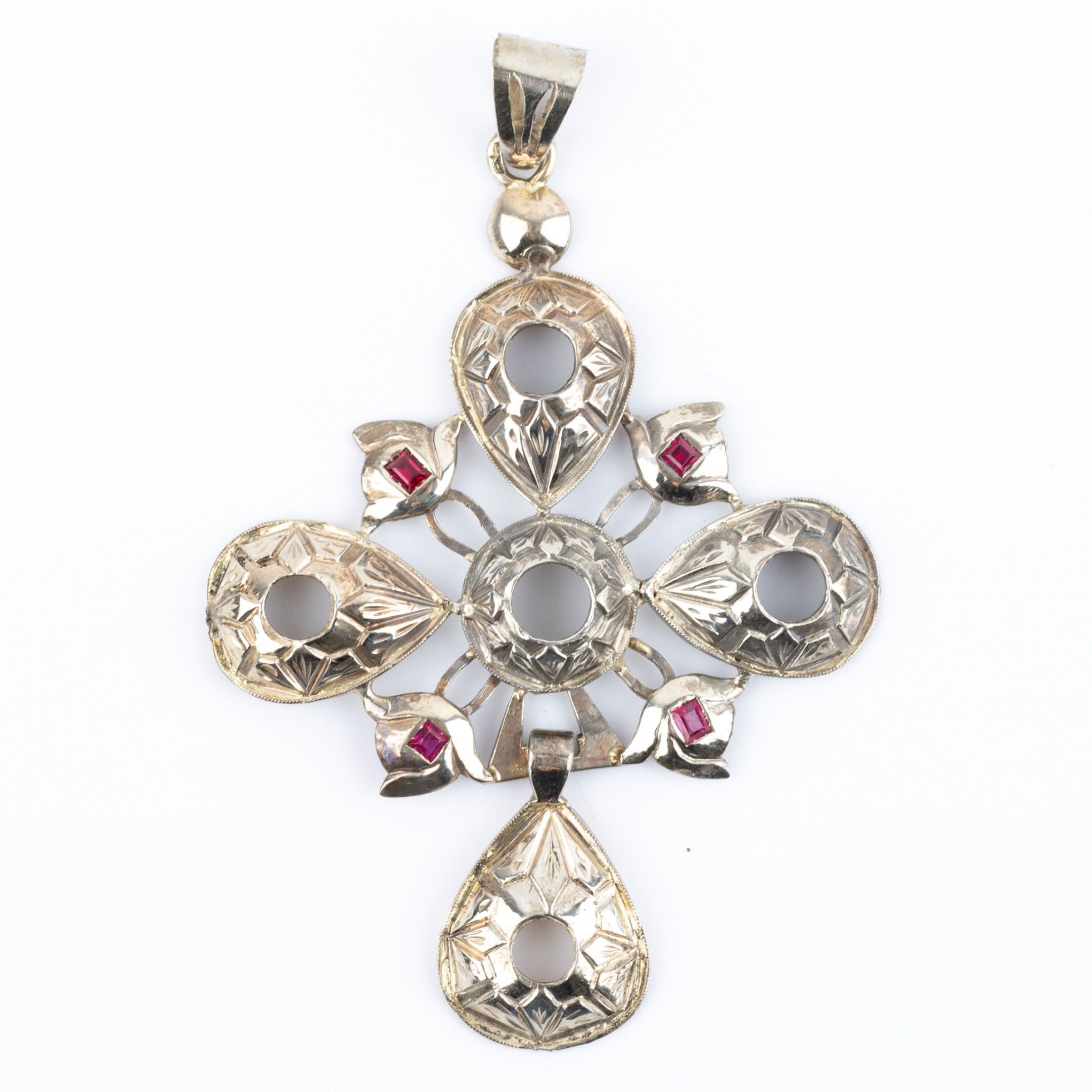 Norman cross pendant set in 18K white gold with red stones