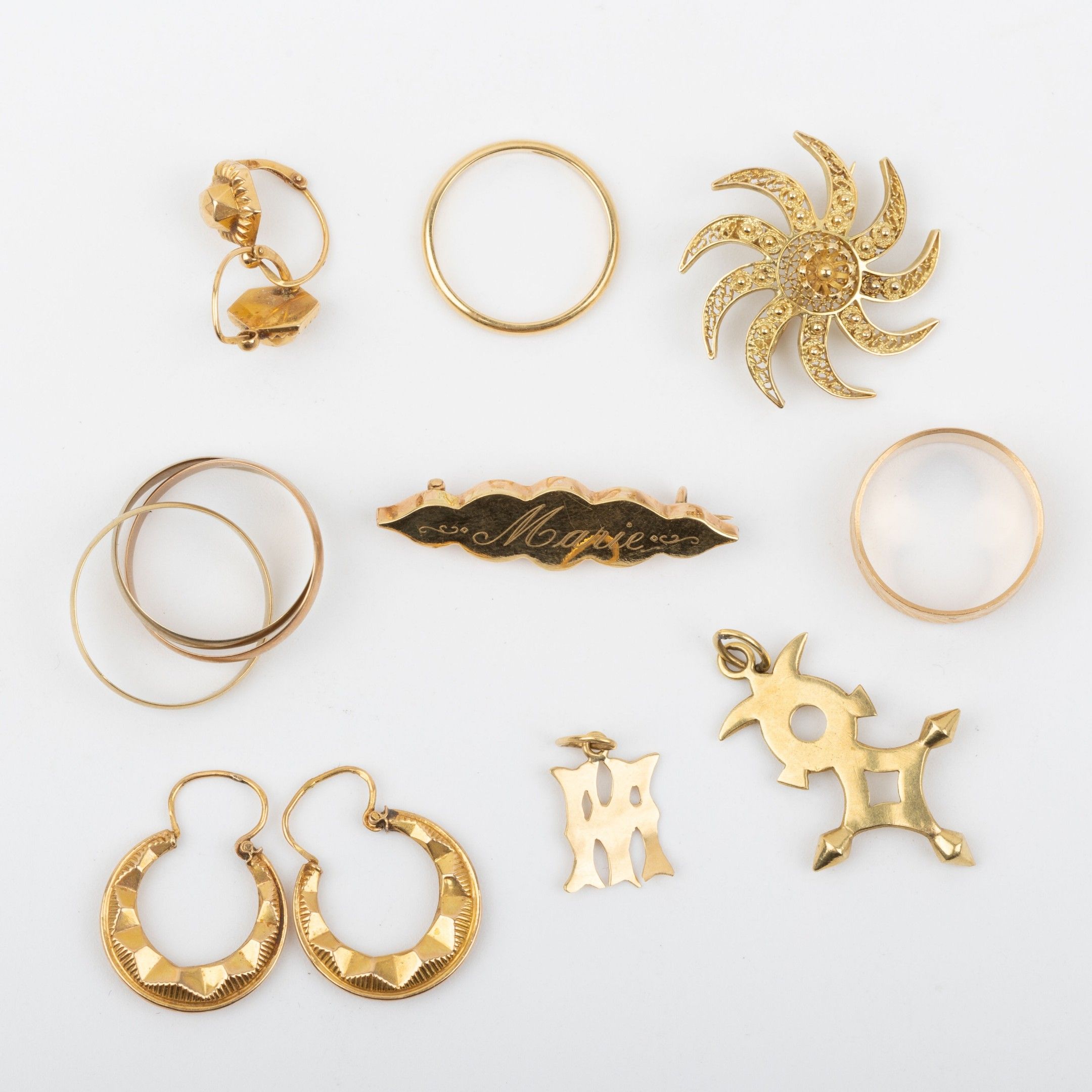 18K gold jewellery set: wedding rings, rings, earrings, pendants, brooches