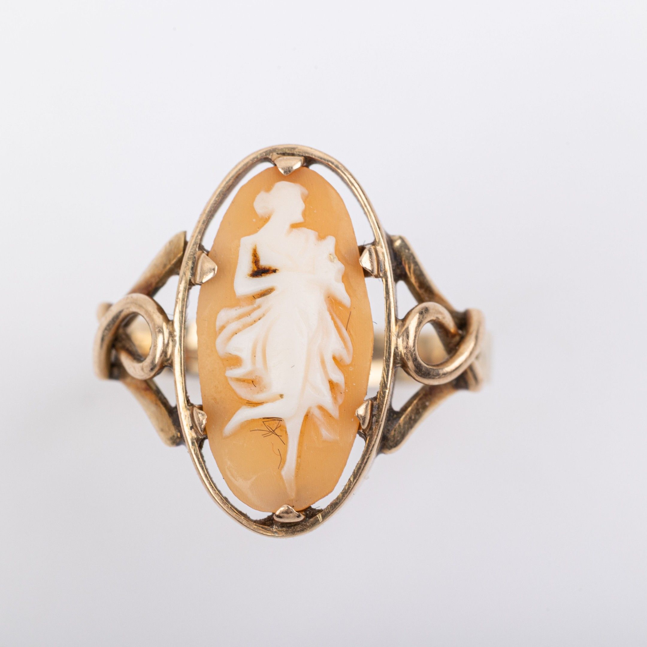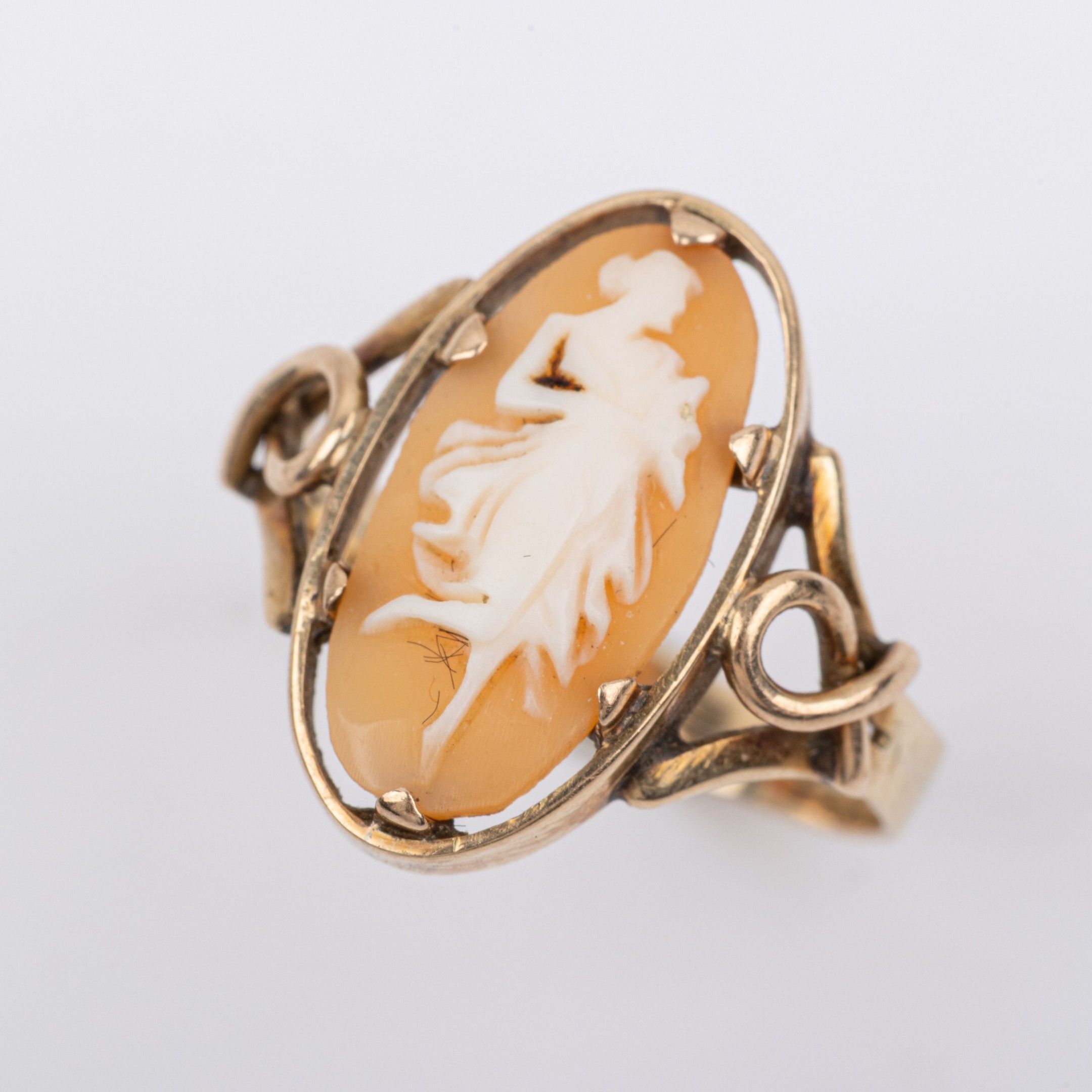 Shuttle dancer ring engraved with a cameo on a shell, set in 9K gold