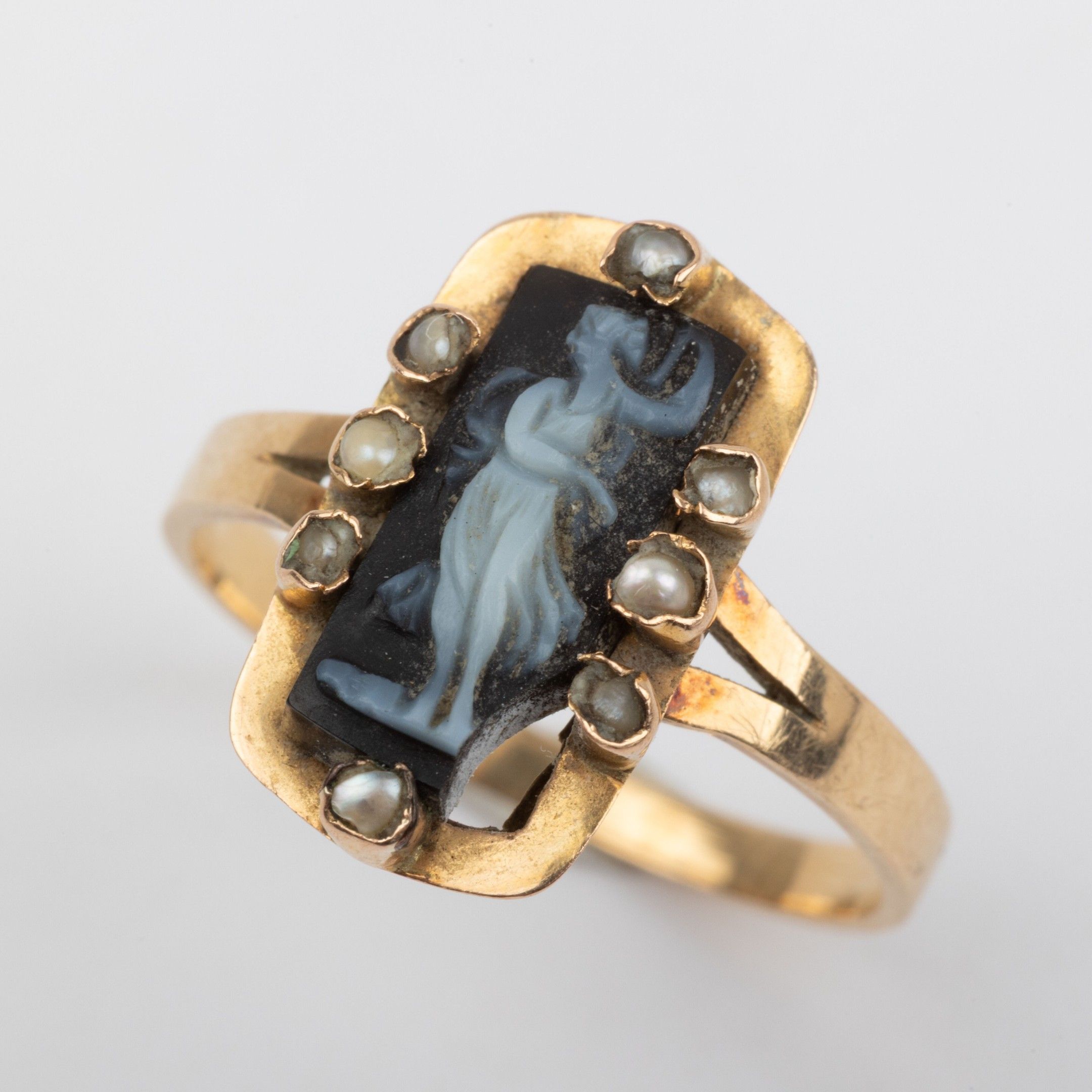 Ring decorated with a young woman, engraved in cameo on hard stone, 18 K gold setting.