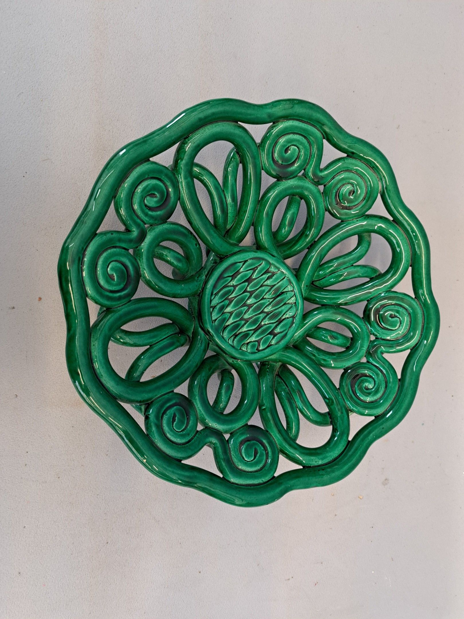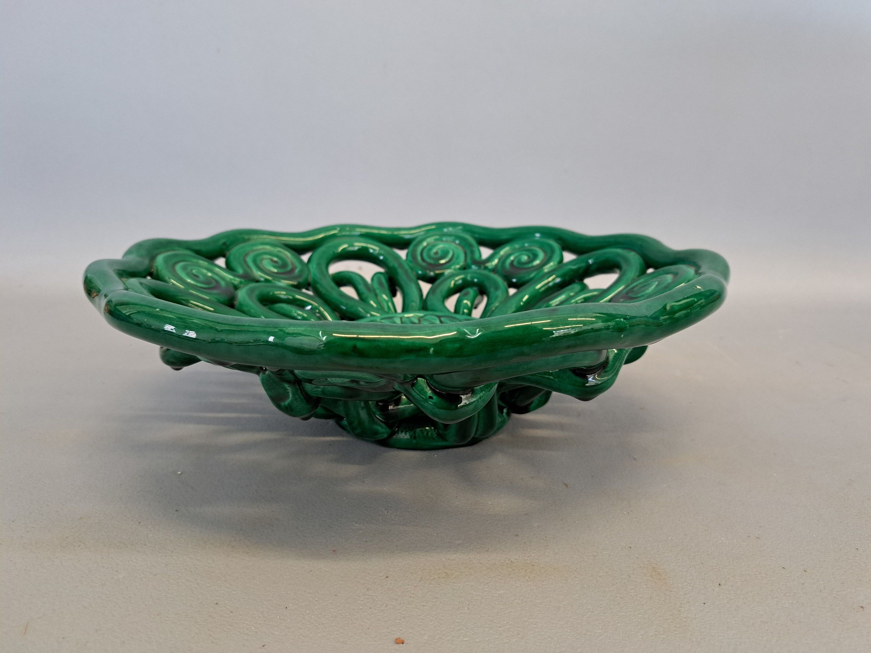 A large green glazed ceramic bowl decorated with scrolls and basketwork motifs.