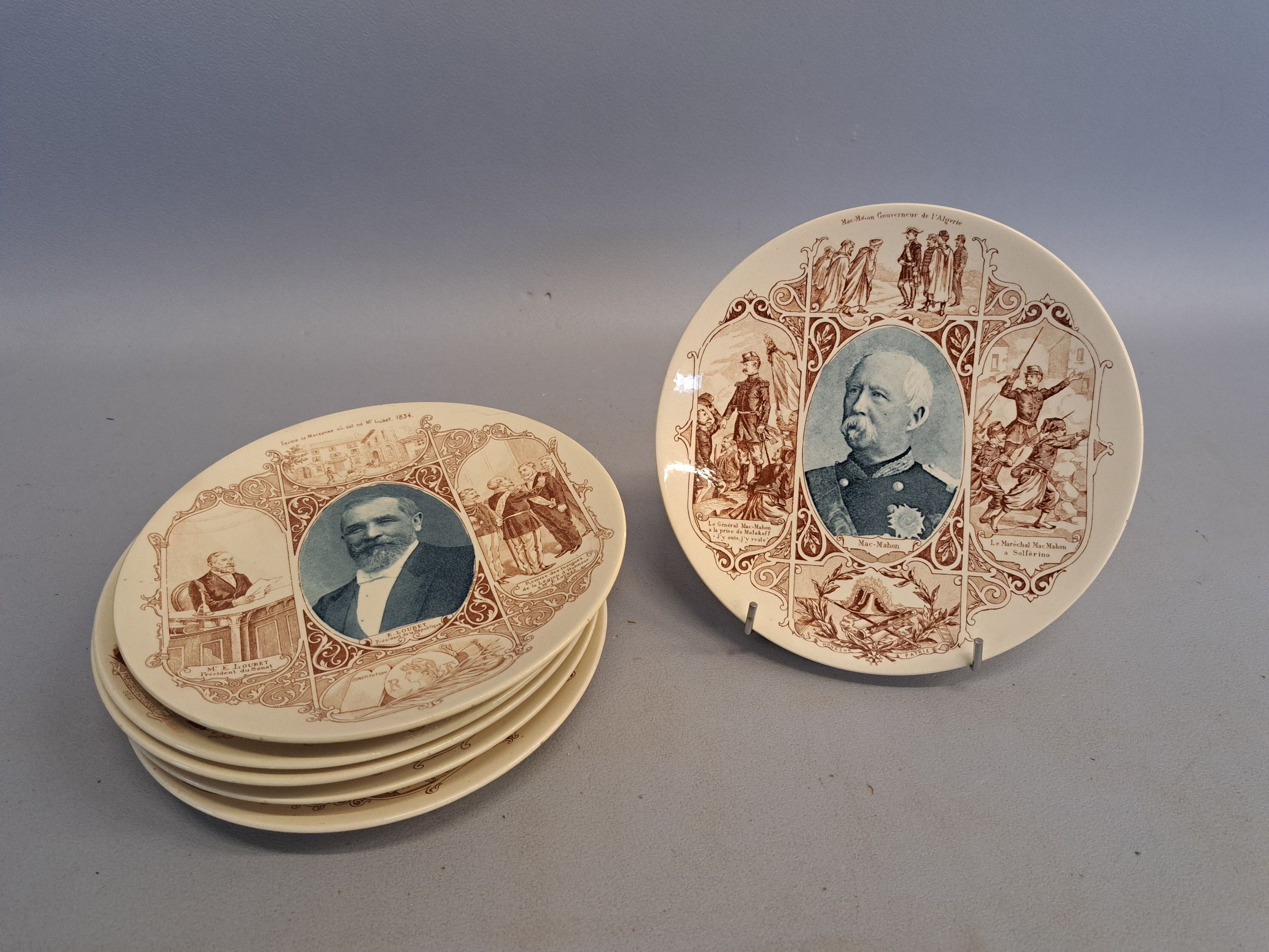 Sarreguemines, set of 6 earthenware plates with printed decoration of political figures (minor wear). Diam. 21.5 cm.